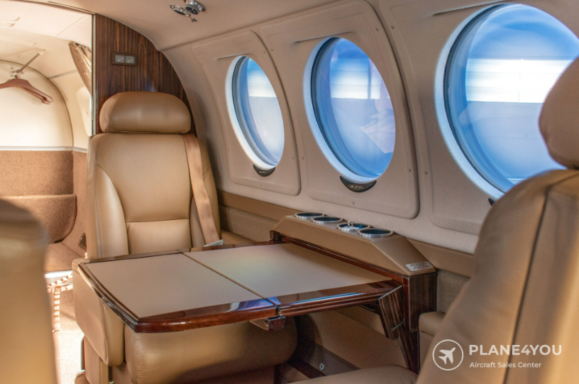 The King Air 250 cabin is pressurized with a typical club-seating business layout, a belted lavatory area in many configurations, and a practical baggage solution suited to regional travel. Compared with many light jets, the turboprop cabin experience can include more noticeable propeller/engine noise and vibration, though comfort is highly dependent on specific interior, soundproofing options, and prop balance/maintenance. The main value is a usable cabin for teams and clients combined with the ability to use smaller airports and shorter runways.