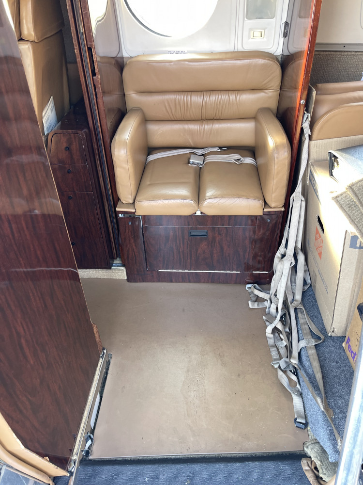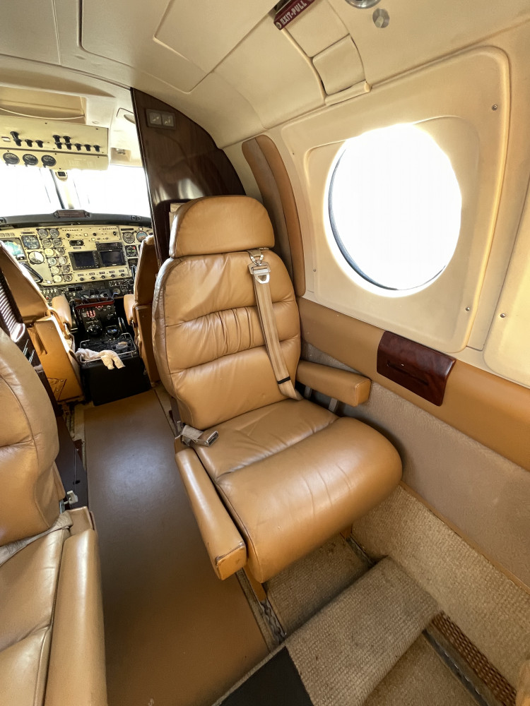 The pressurized cabin is typically arranged as a club-style interior with optional aft seating and an enclosed lavatory depending on configuration. Cabin height and width are modest versus jets, but the flat floor and large windows can make it comfortable for small groups on regional sectors. Boarding is via an airstair door, and baggage volume depends on interior layout and installed equipment.