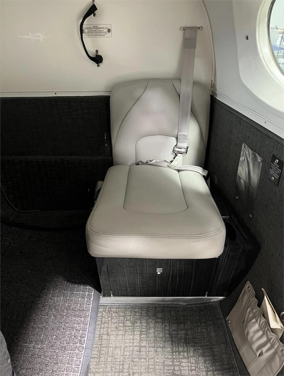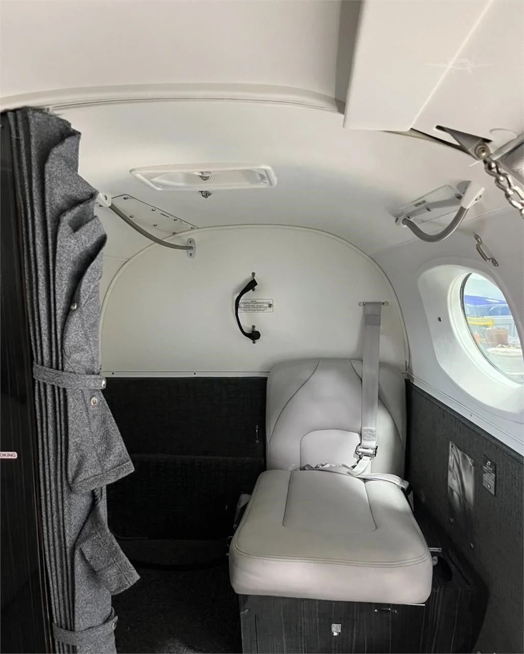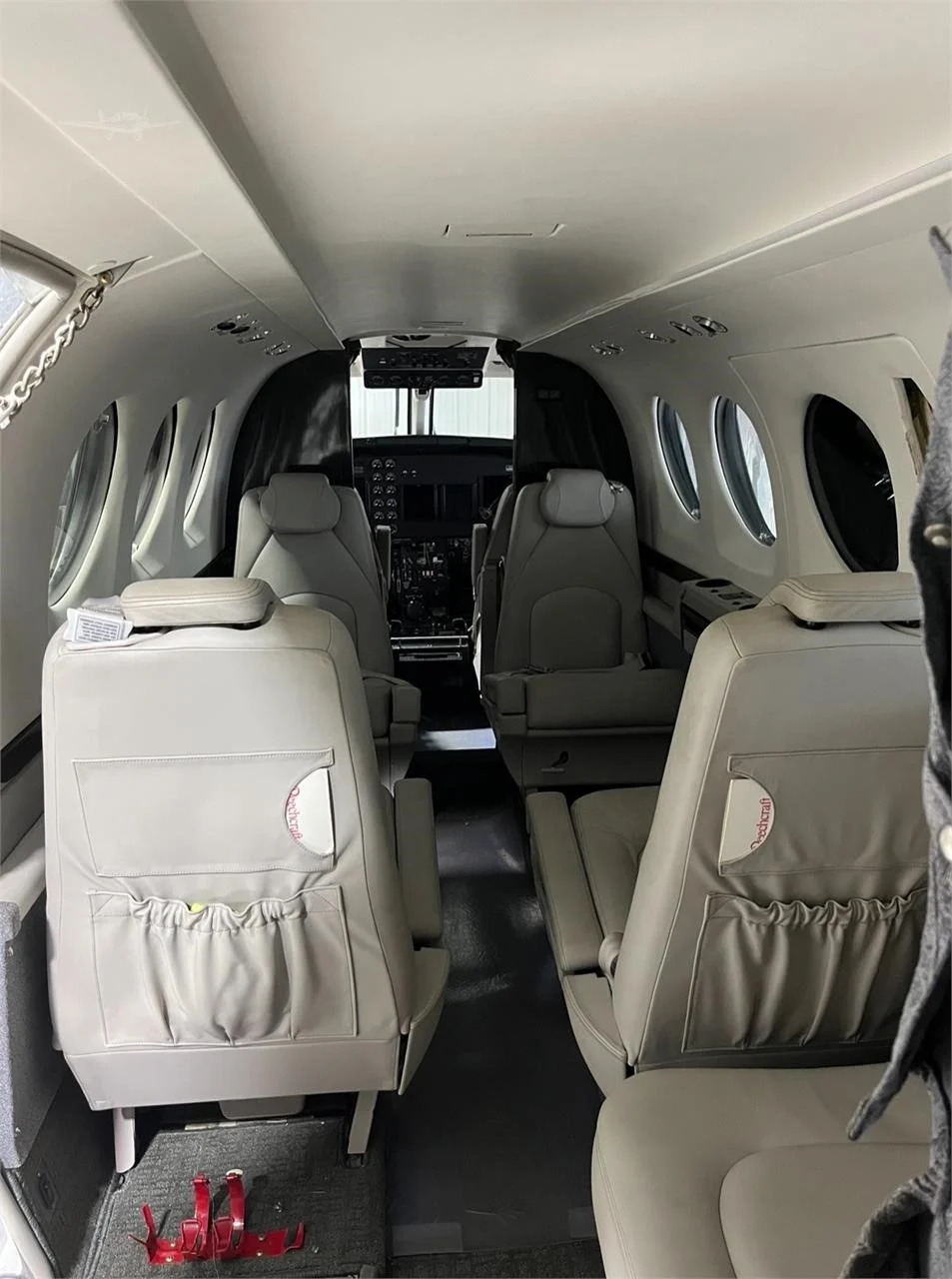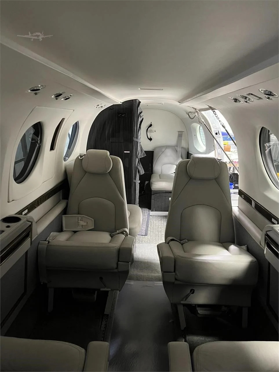 The C90A offers a compact, pressurized cabin typically arranged for executive transport with club seating and an aft refreshment/utility area depending on the interior. Expect a functional cabin suited to small groups rather than a stand-up environment. Noise and vibration are characteristic of turboprops; interior condition, insulation upgrades, and propeller/engine maintenance state can materially influence perceived comfort.