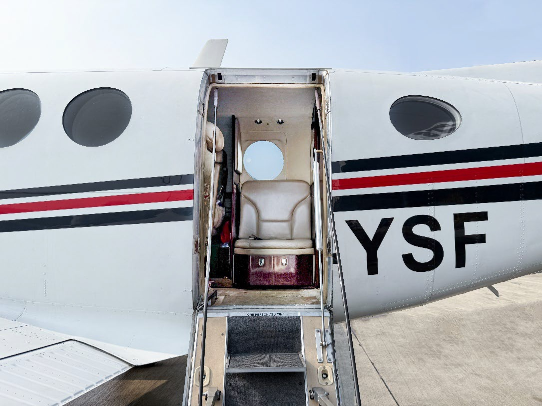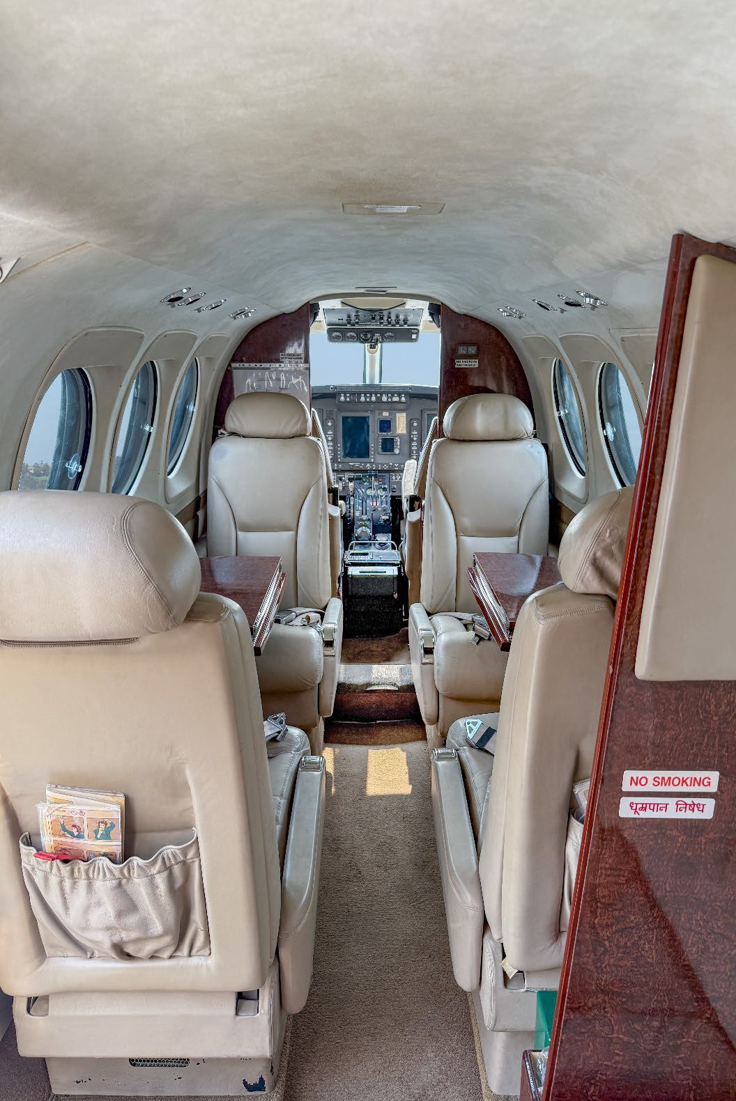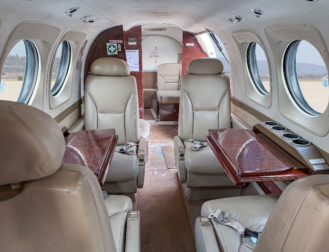 - Interior: Six passenger seats, 4-place club configuration with folding tables, aft lavatory with hard privacy door.
