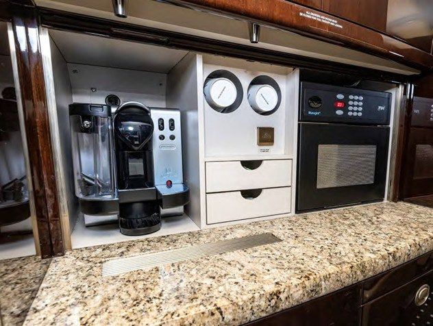 - Interior Features: Forward galley with coffee maker and microwave, NICE cabin management system, pullout tables.