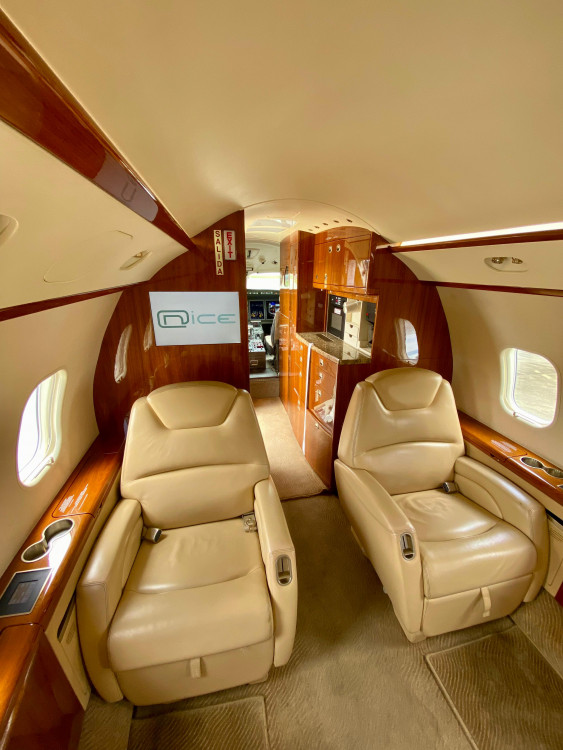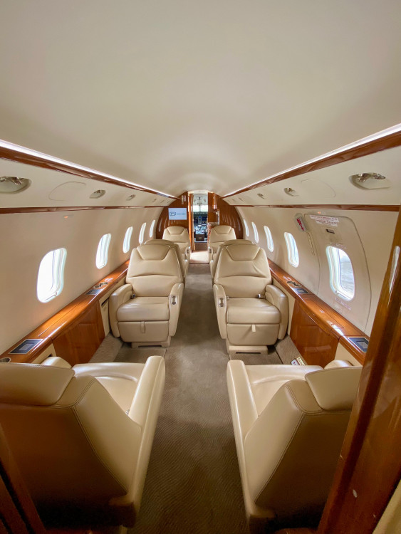- Cabin configuration: 9 passenger seats, including a belted lavatory and 8 executive seats with fold-out tables.