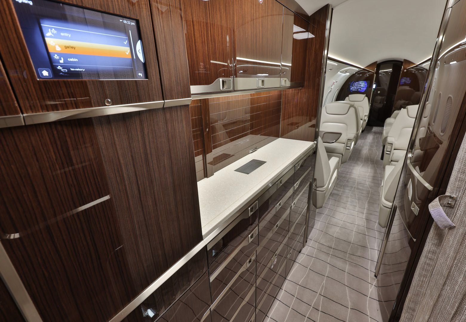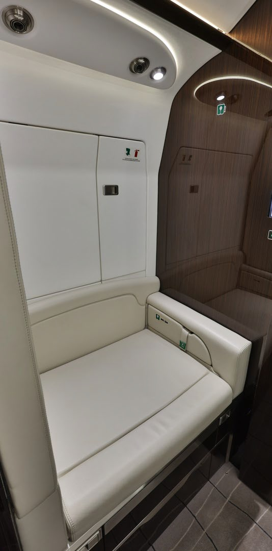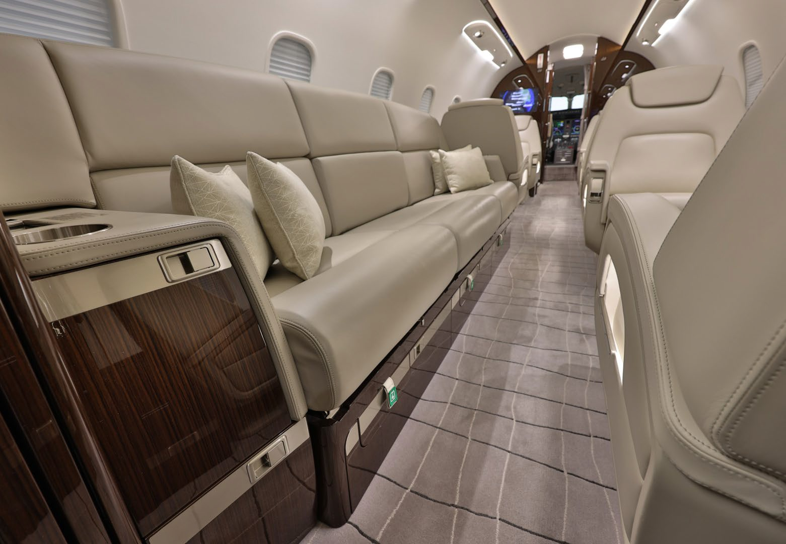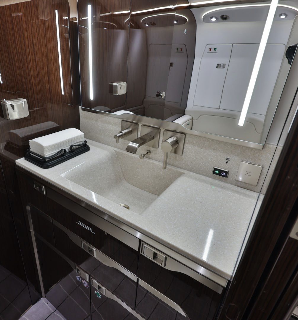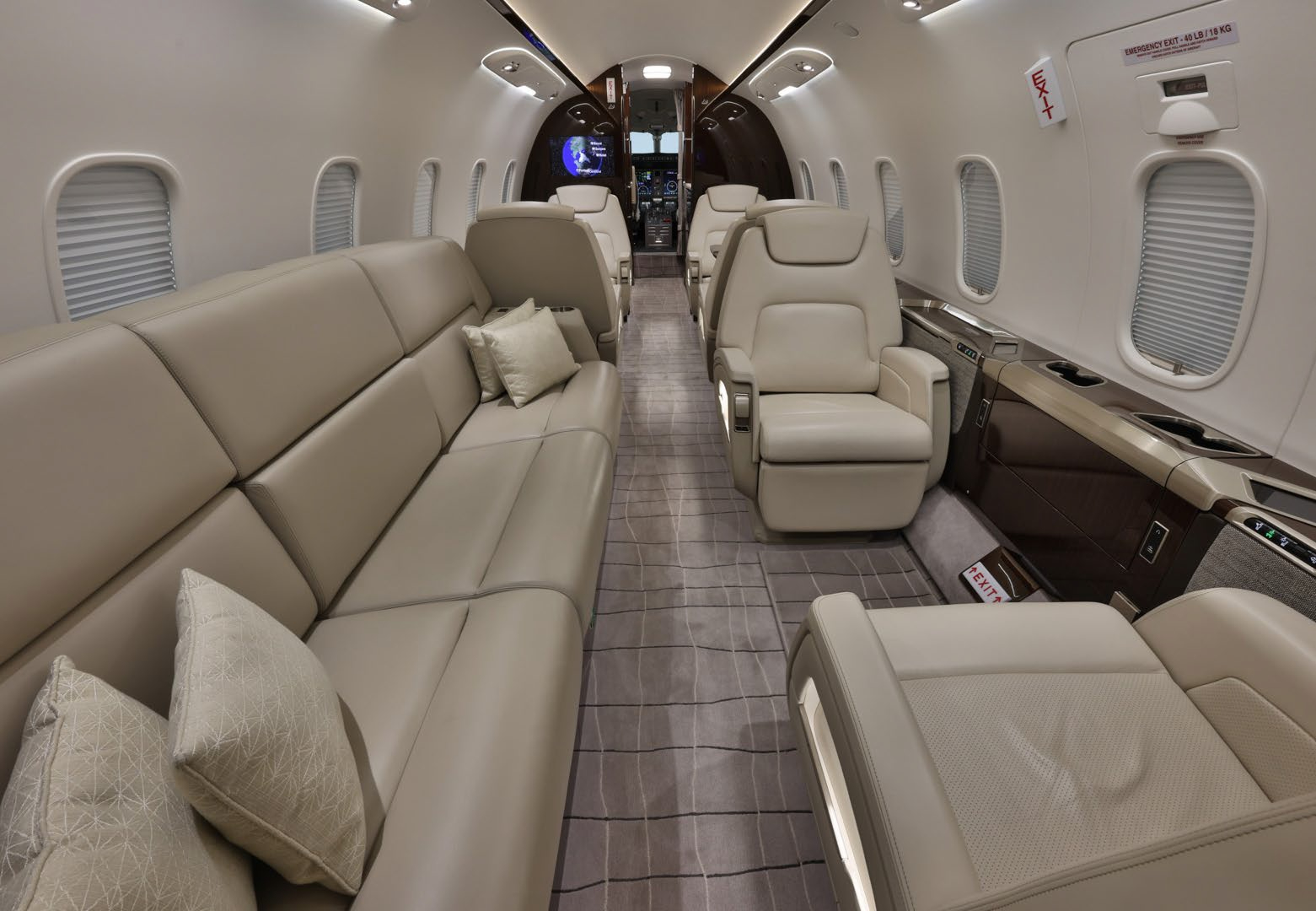 The cabin is one of the aircraft’s defining attributes: a wide cross-section for the class, generally allowing a comfortable aisle and seating that feels closer to a large-cabin product than a traditional midsize. Most aircraft are configured with a forward galley, a double-club seating area, and an enclosed aft lavatory; many also include a belted lav seat for additional flexibility. Large windows, a flat floor, and good baggage volume support longer legs and multi-day trips.