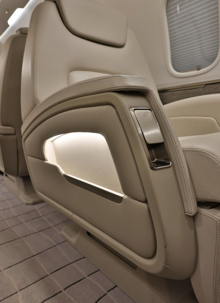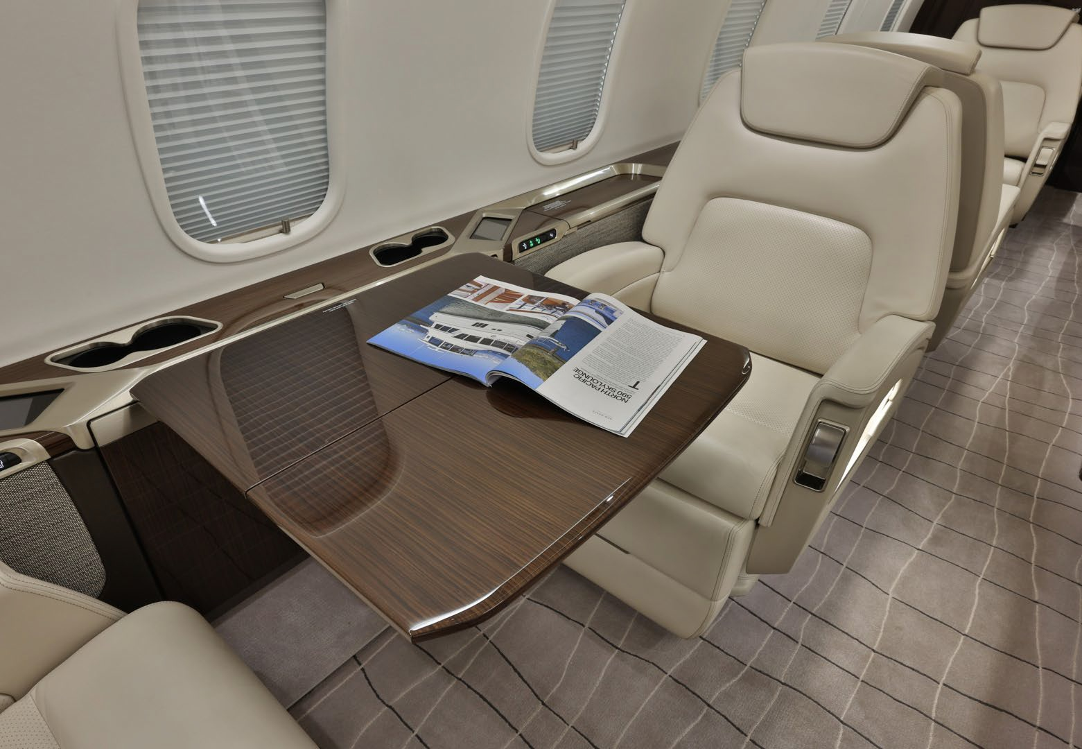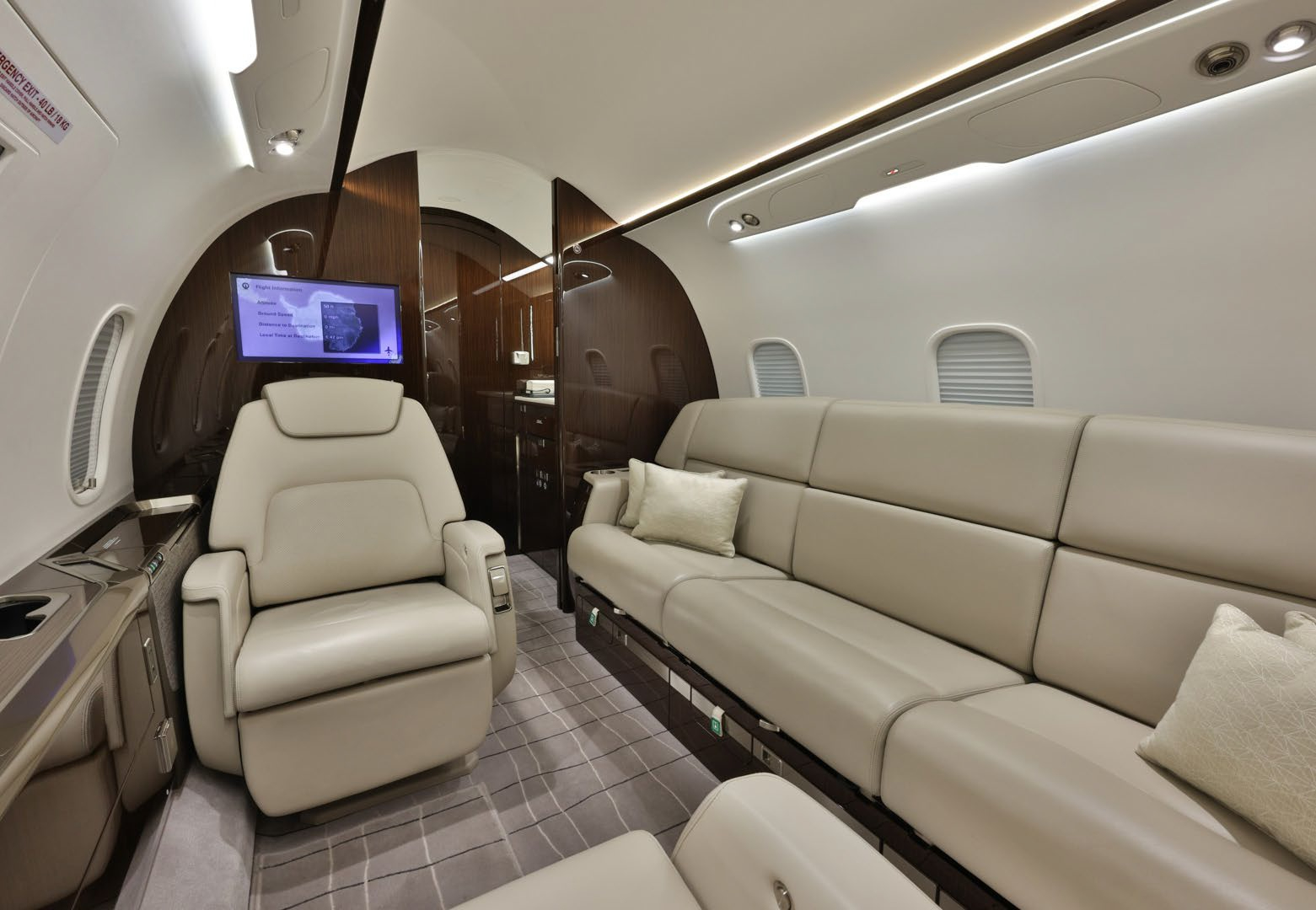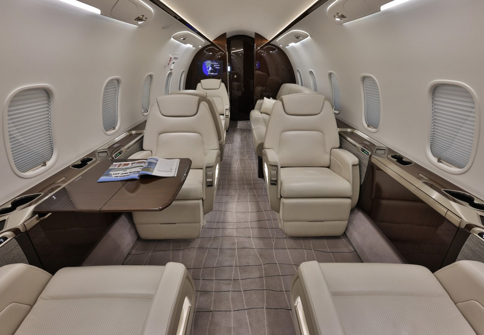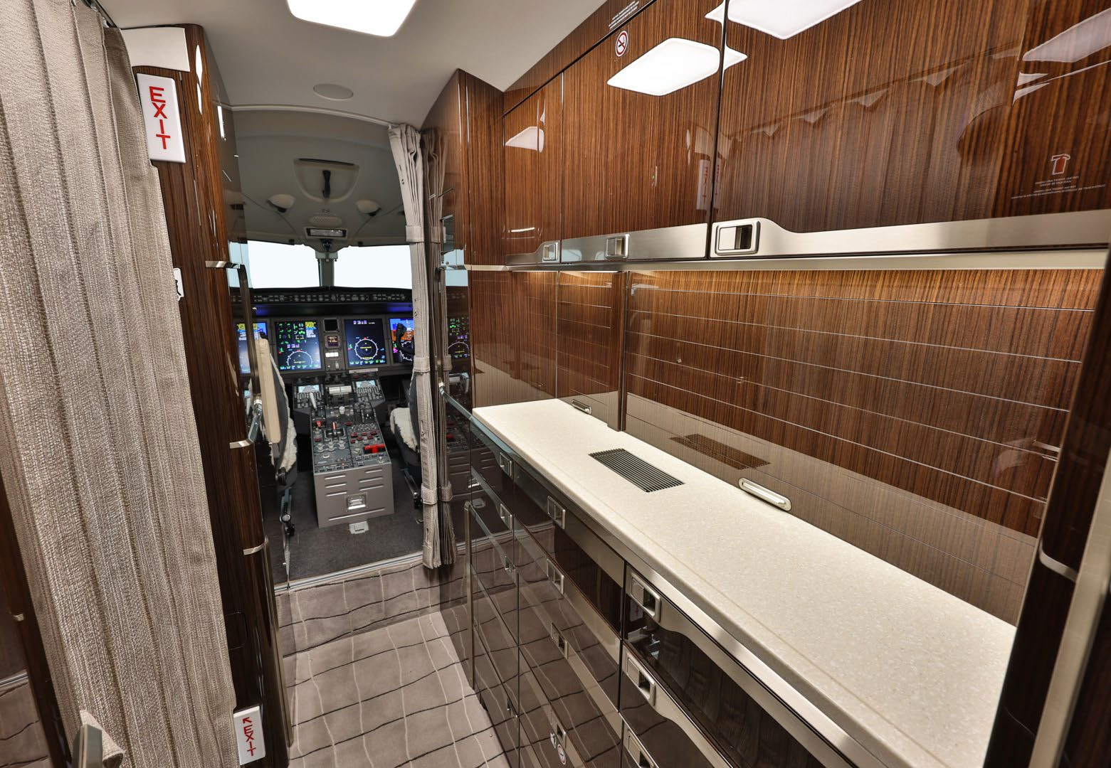 The cabin is one of the aircraft’s defining attributes: a wide cross-section for the class, generally allowing a comfortable aisle and seating that feels closer to a large-cabin product than a traditional midsize. Most aircraft are configured with a forward galley, a double-club seating area, and an enclosed aft lavatory; many also include a belted lav seat for additional flexibility. Large windows, a flat floor, and good baggage volume support longer legs and multi-day trips.