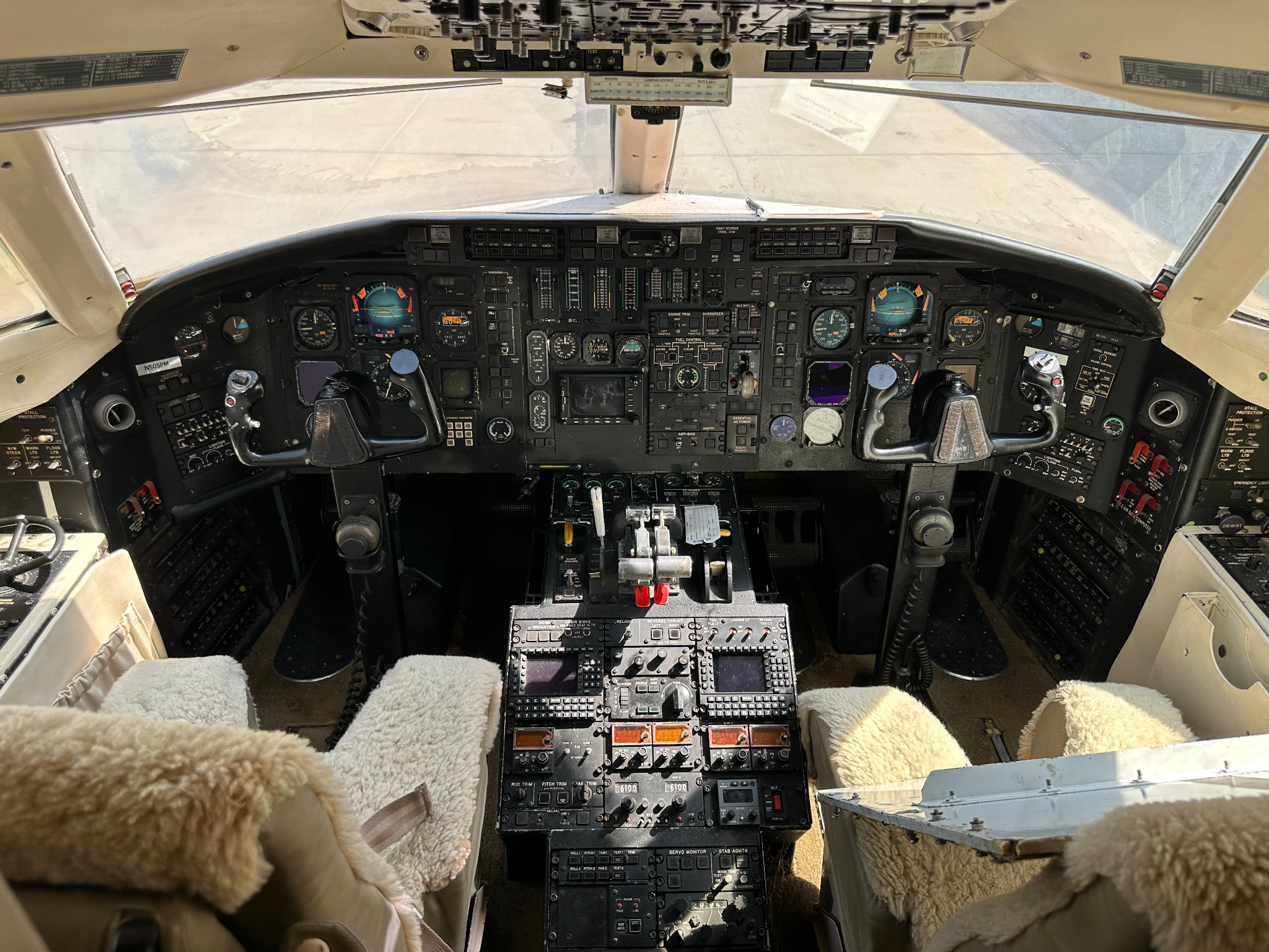 - Interior: Executive configuration for 11 passengers, beige leather seating, tan headliner, aft lavatory.