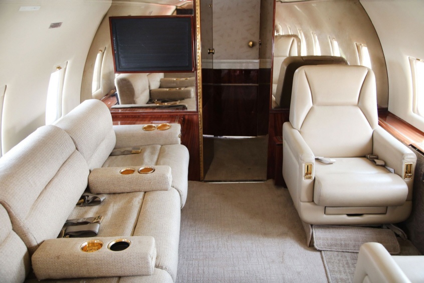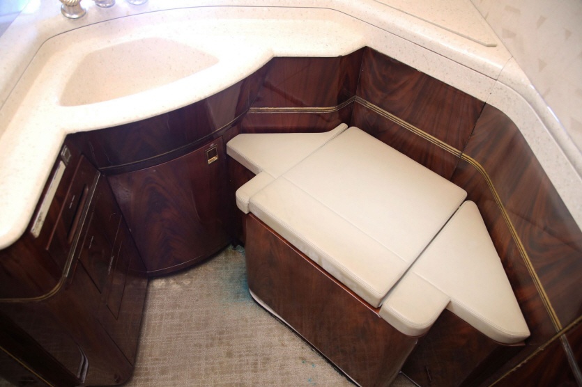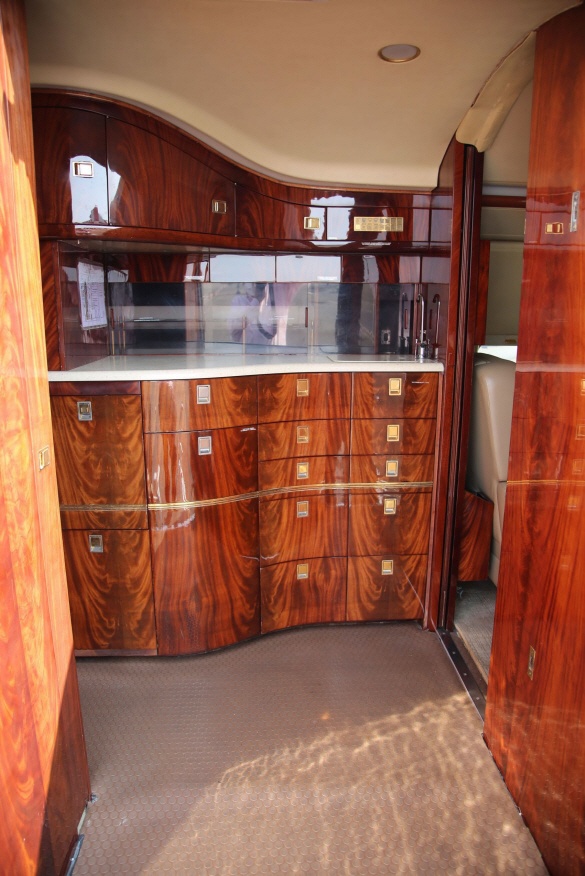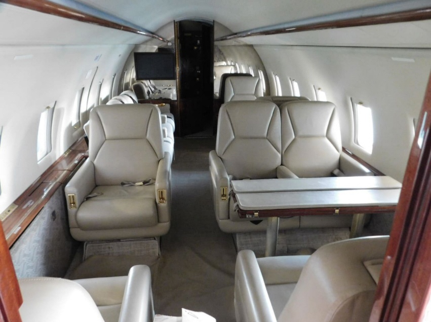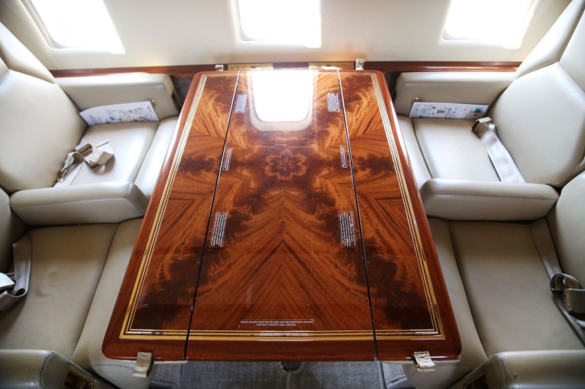 - Interior: Partially refurbished in 2016, 12-passenger capacity, beige leather seating, forward 2-place club, 4-place conference group, aft 2-place club, 4-place divan in beige fabric, high-gloss medium wood veneer cabinetry, aft lavatory with vanity, forward S-galley with sink, coffee maker, and warming oven.
