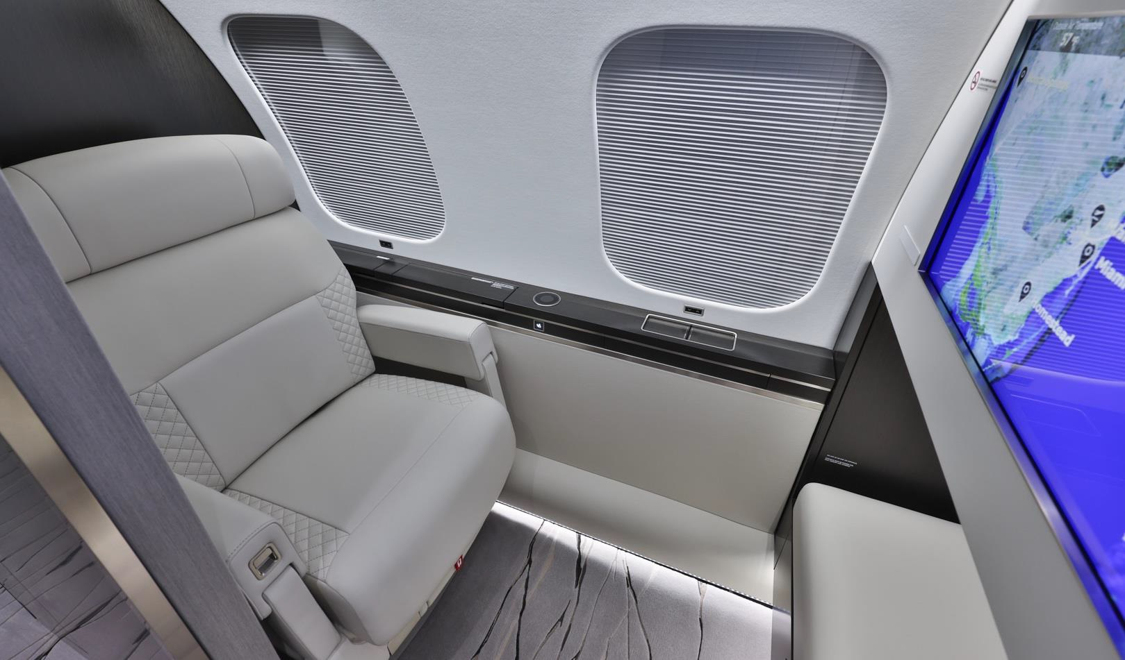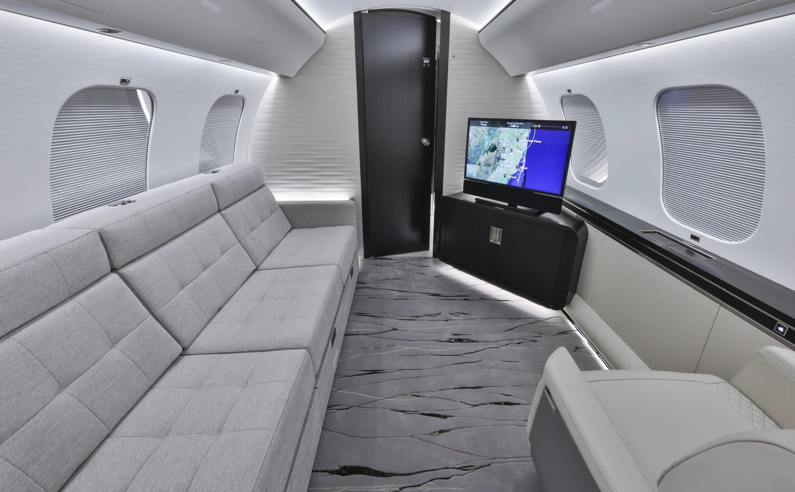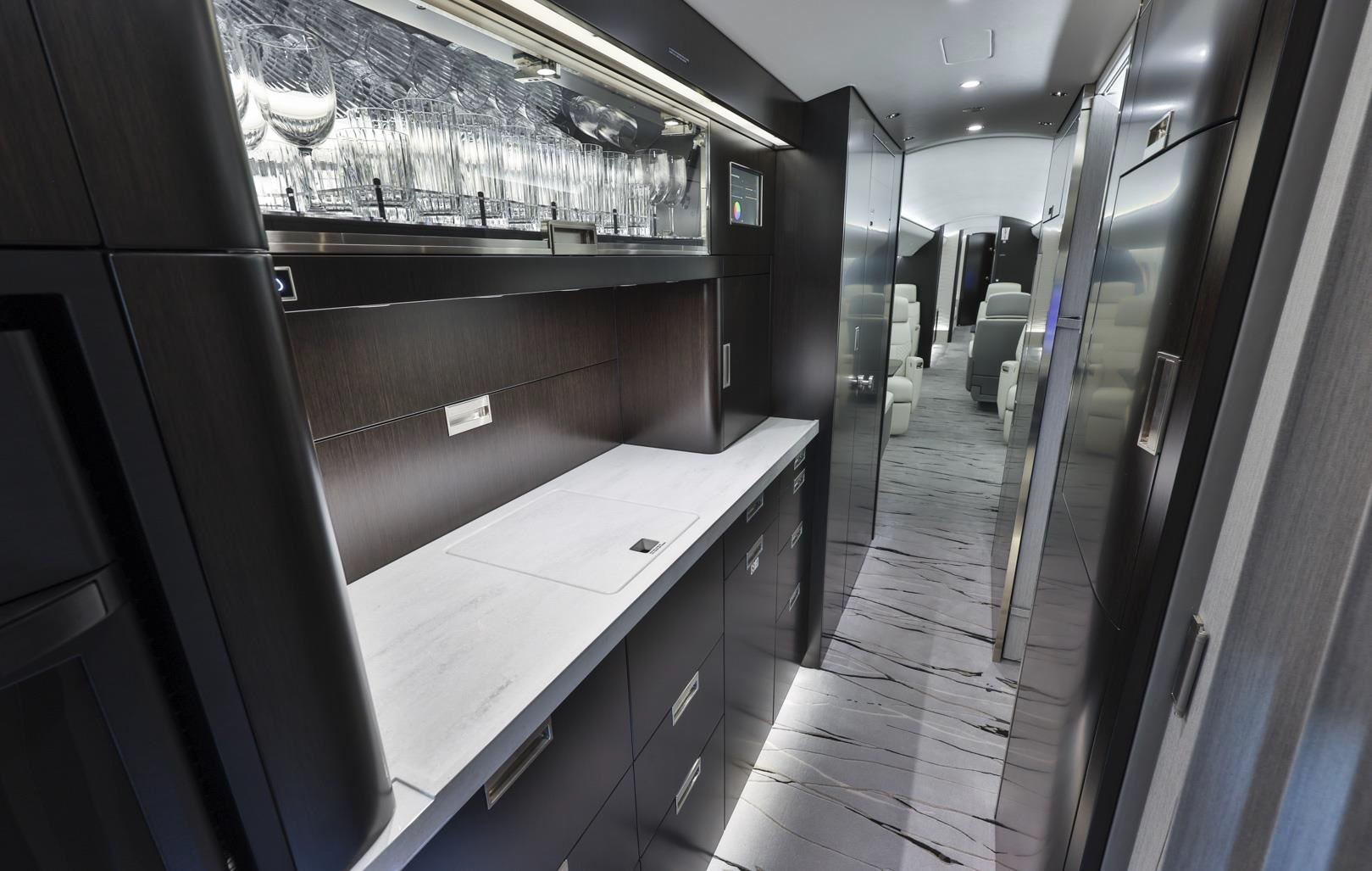 The cabin is arranged as a true multi-zone environment, commonly offering separate areas for conference-style work, lounge seating, and dedicated rest. A full-size galley and multiple lavatory options are typical, supporting long-duration service. Ride quality and cabin altitude management are key parts of the long-range comfort story, and baggage access and stowage are generally planned for extended trips with more luggage.