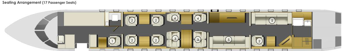 - Interior: Executive layout for 17 passengers, forward galley, four-zone configuration