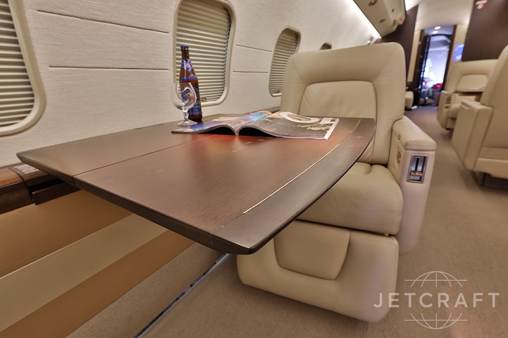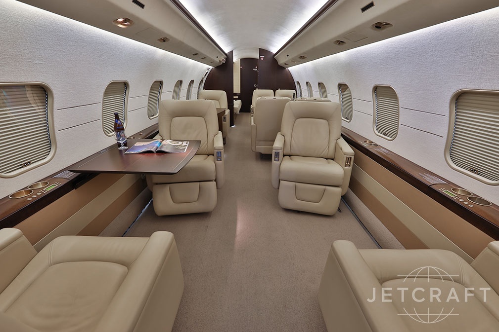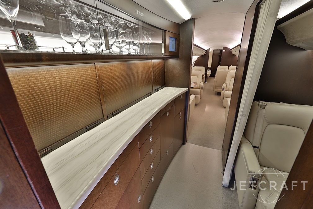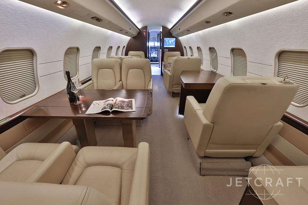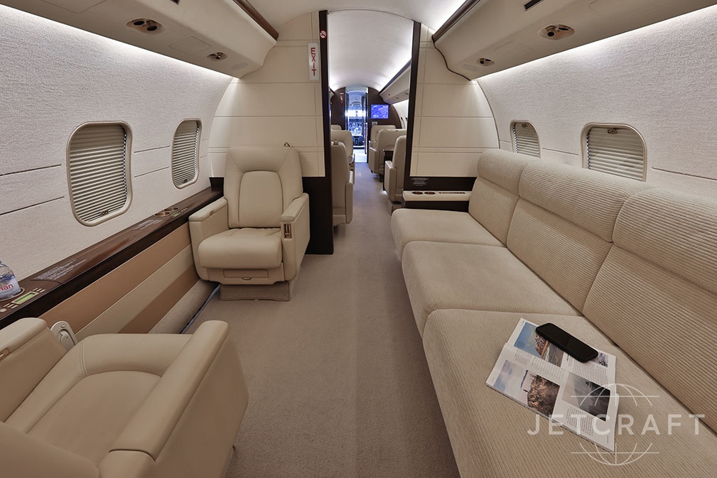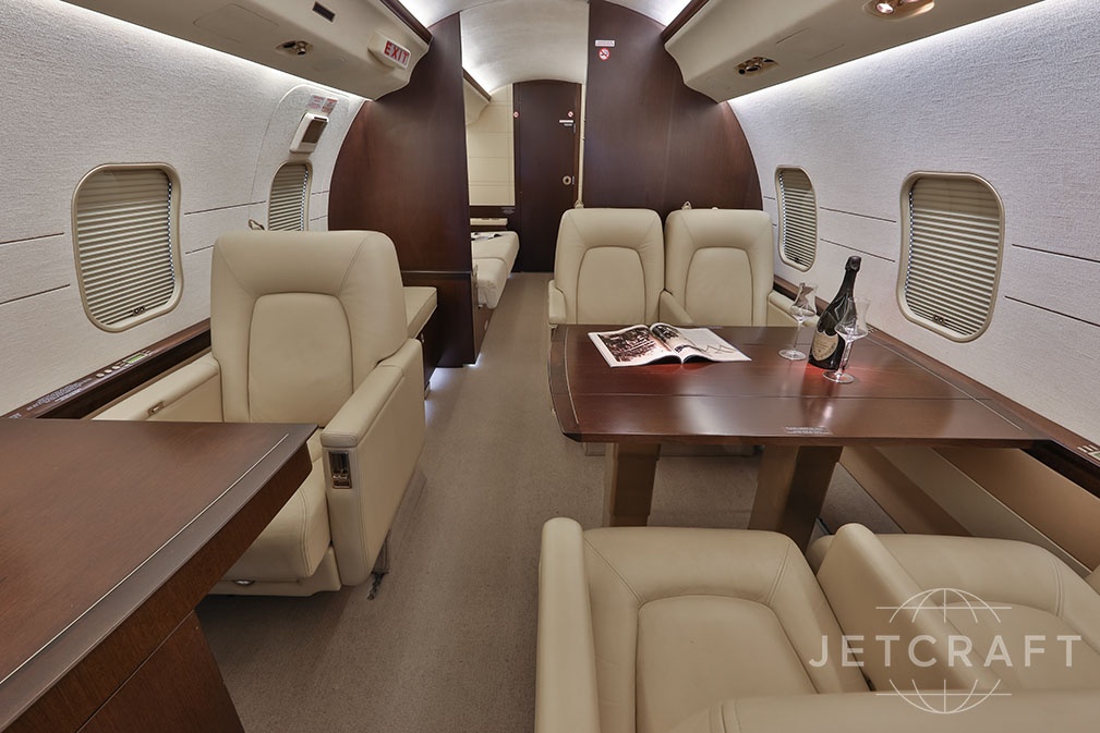The cabin is generally arranged in multiple zones, enabling separation between meeting/work seating and a private aft area. Most aircraft are configured with a forward galley sized for full-service catering and a dedicated crew rest solution on many examples. Typical layouts support a mix of conference-style seating, lounge groupings, and an enclosed lavatory; many aircraft include a permanent or convertible sleeping setup to support true long-haul use.