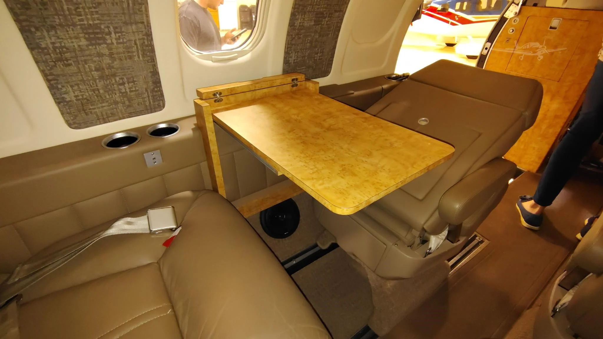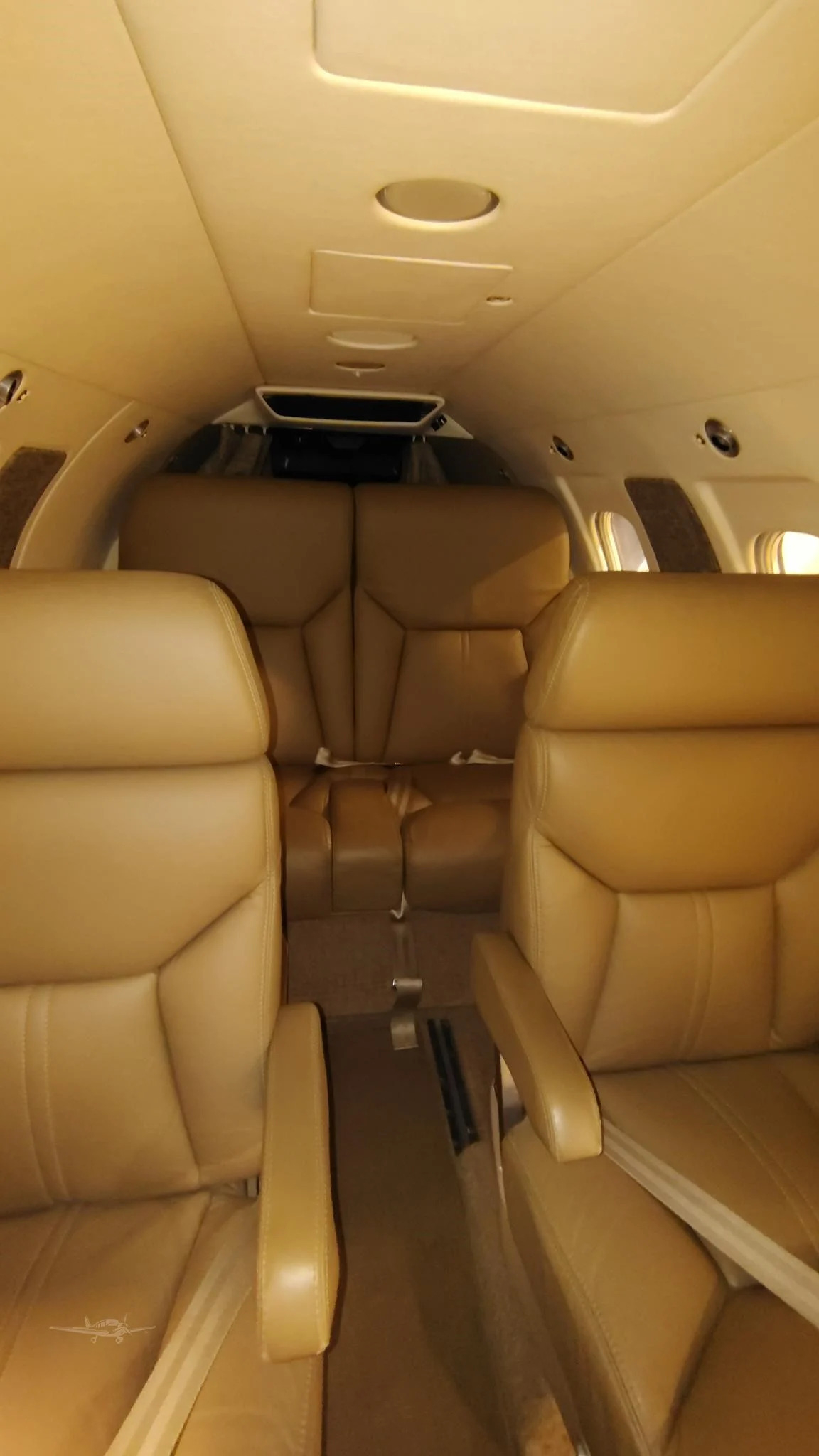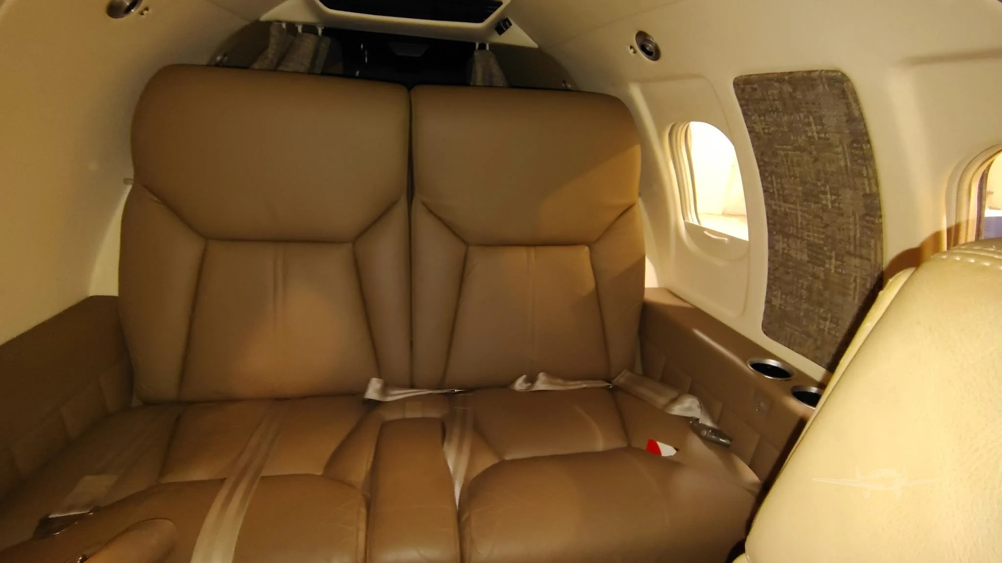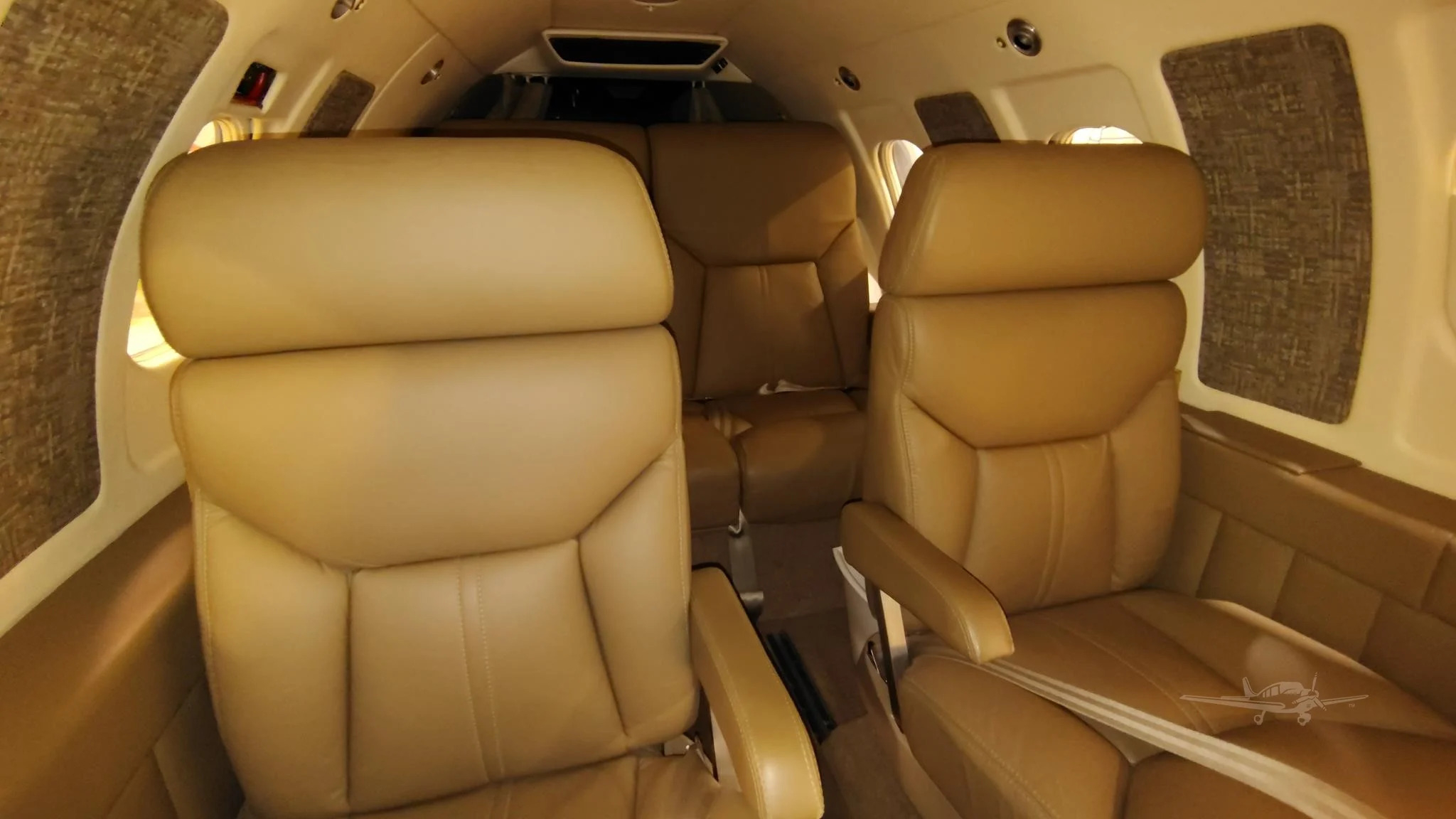 - Interior: 6 seats, forward galley, forward lavatory, light beige leather interior, and beige carpeting