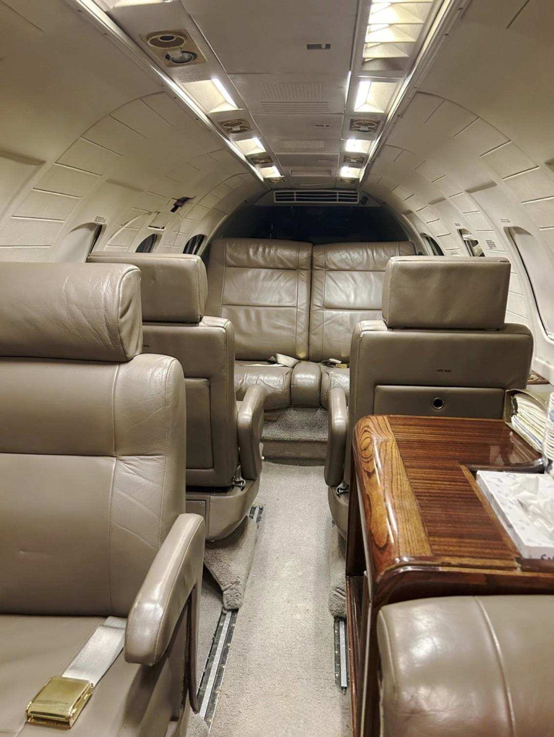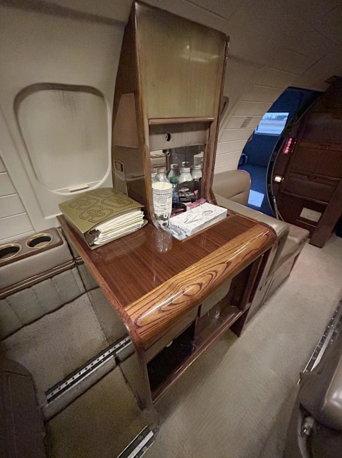 - Interior: Executive 8-passenger configuration, light brown leather seats, brown carpeting, mid-cabin refreshment galley, dual executive writing tables
