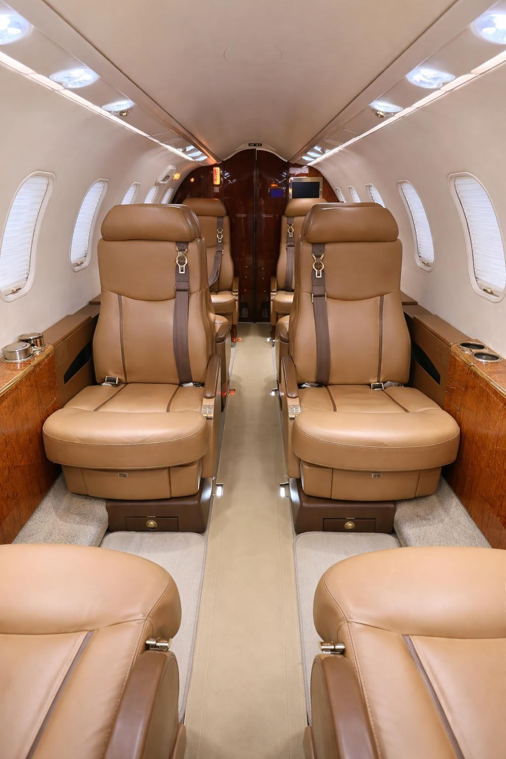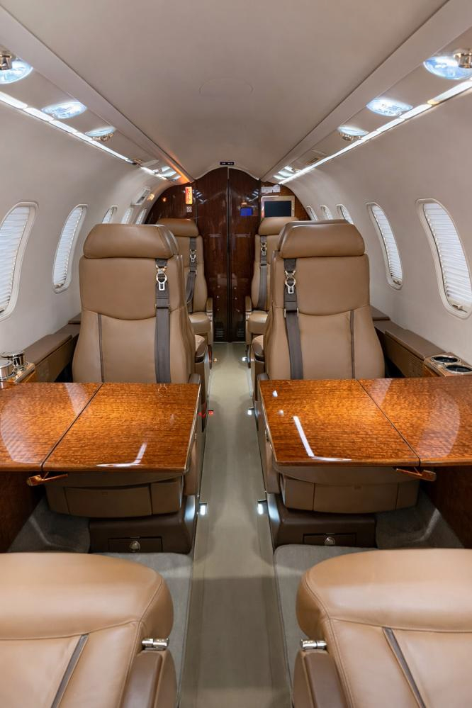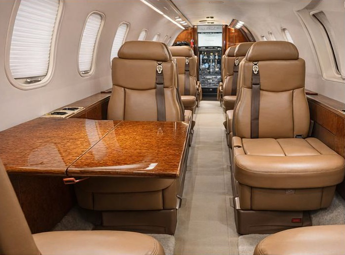 - Interior Features: Executive configuration, seating for 9 with double club arrangement, forward galley, belted aft lavatory, air conditioning, and entertainment system with monitors.