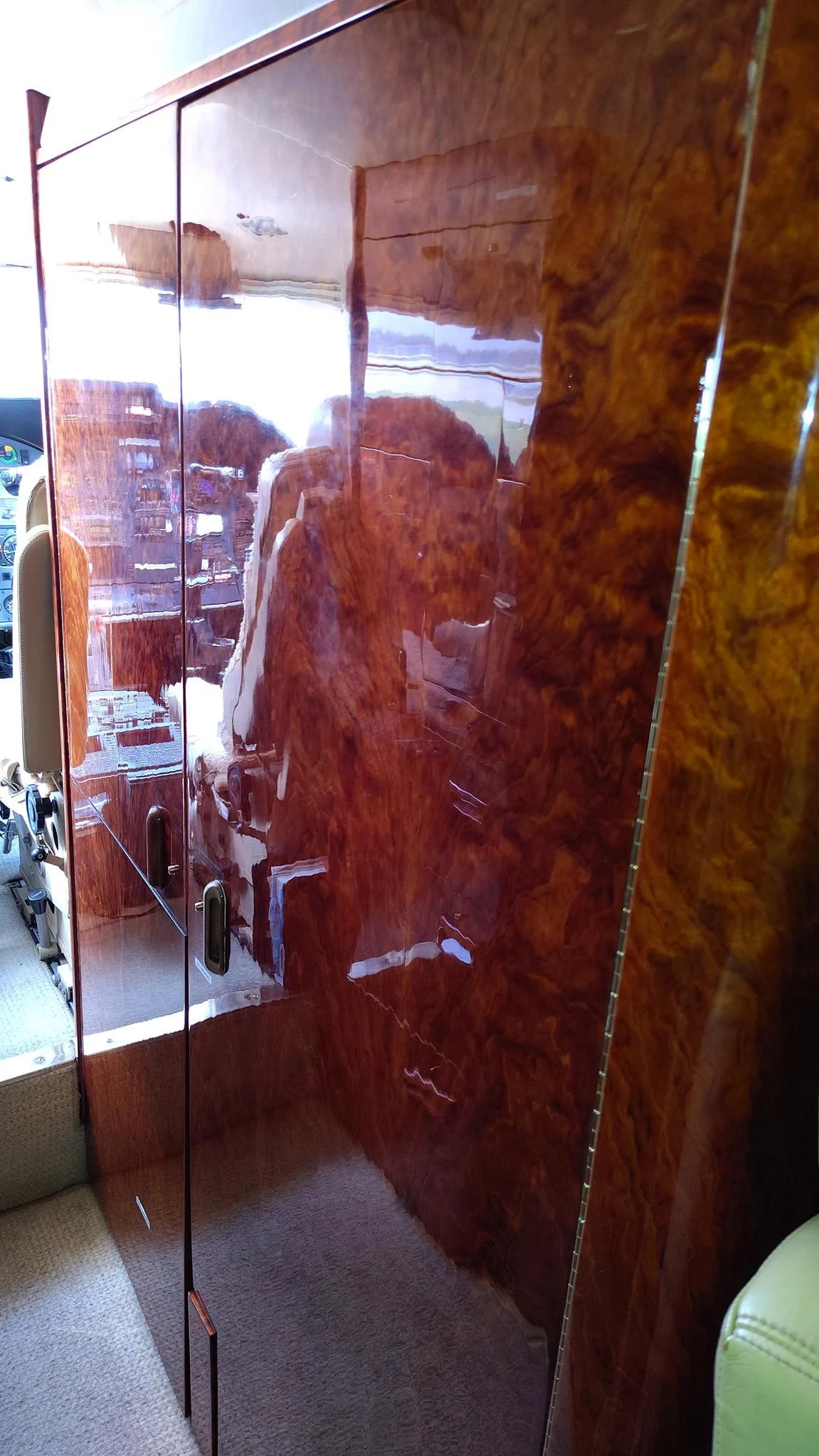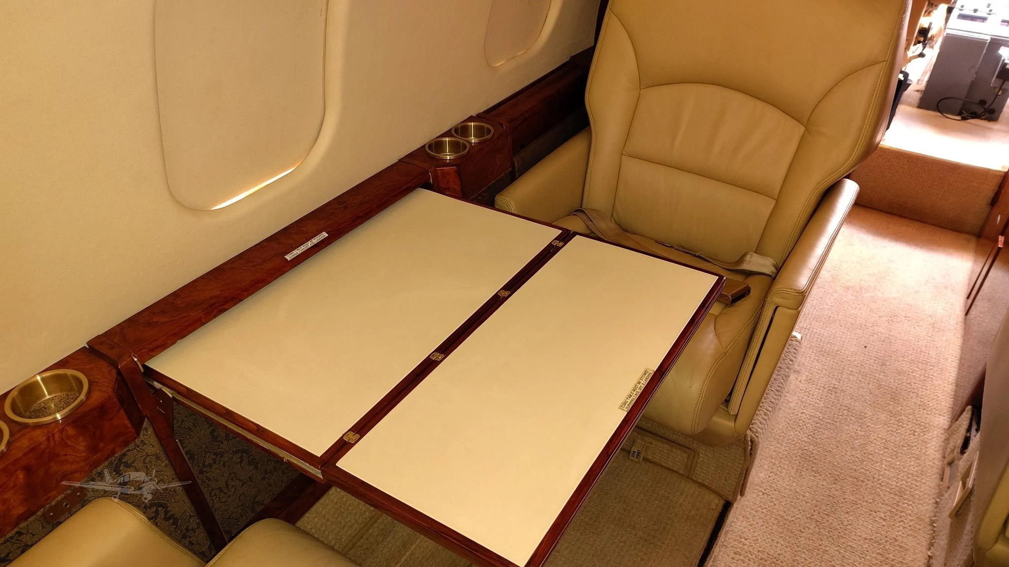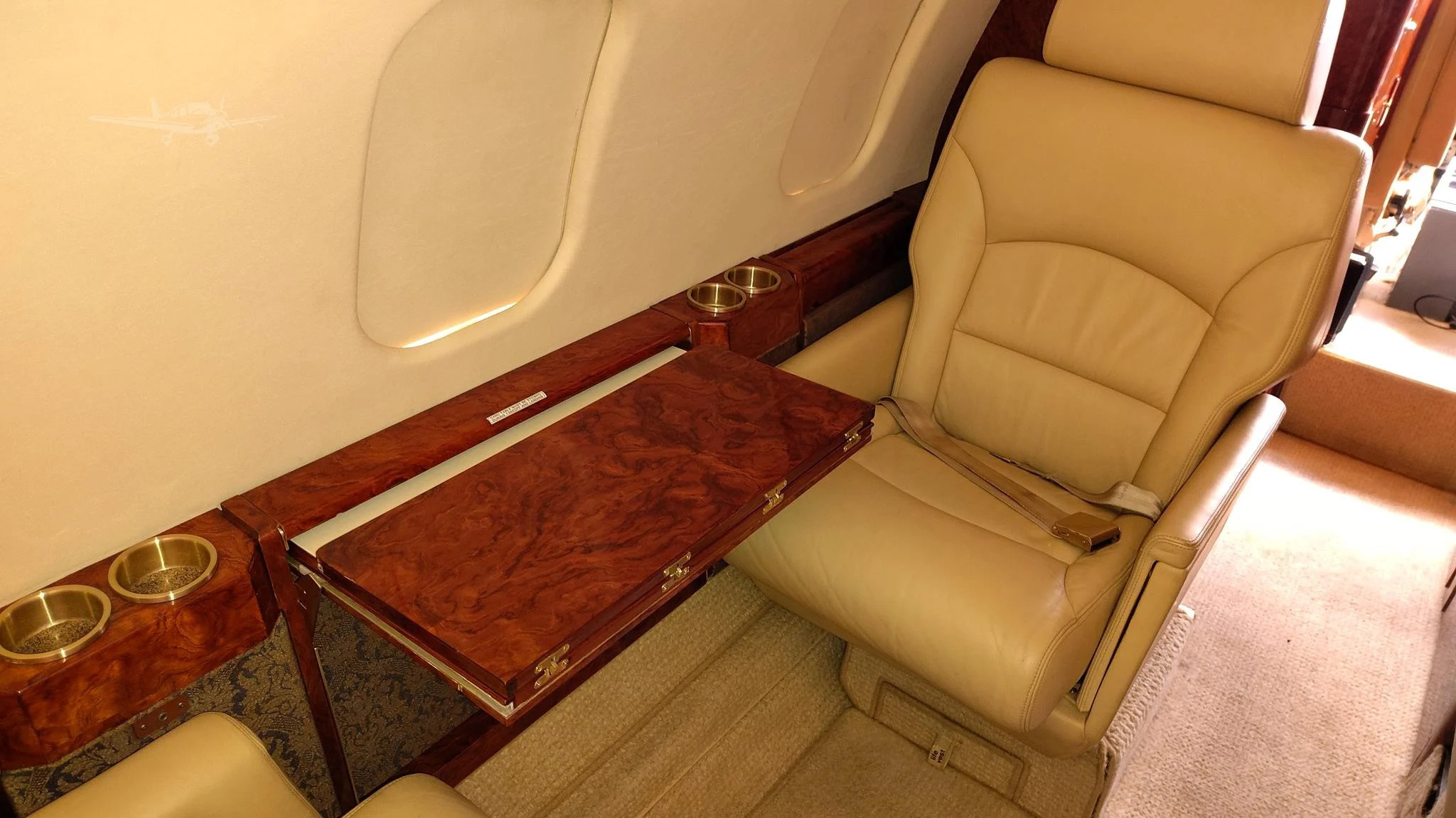 - Interior: 8 seats, light beige leather, high-gloss red maple burlwood, forward galley and lavatory