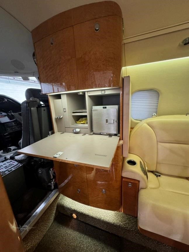 - Cabin Features: Cream Caressa leather, high-gloss bird's-eye maple cabinetry, aft belted lavatory with vanity, forward refreshment center with warming oven