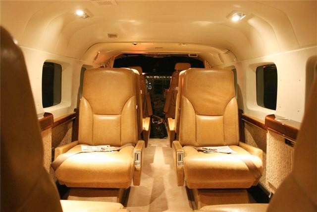 - Interior: Plush Oasis interior; Tan leather seating for 10 passengers; Light tan wool carpeting; Aft lavatory; Dual foldout tables.