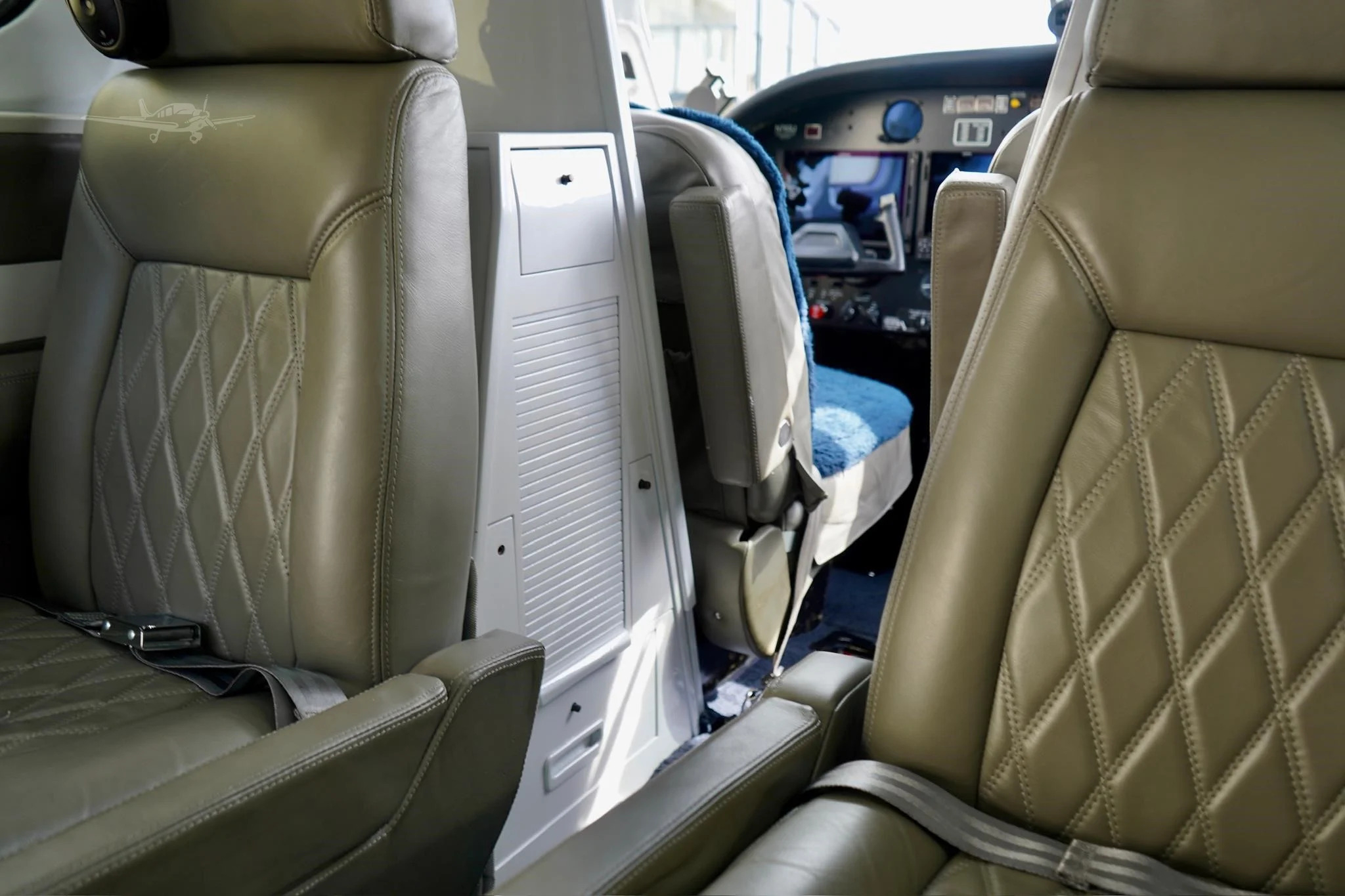- Navy blue carpets, gray seats, white refreshment center