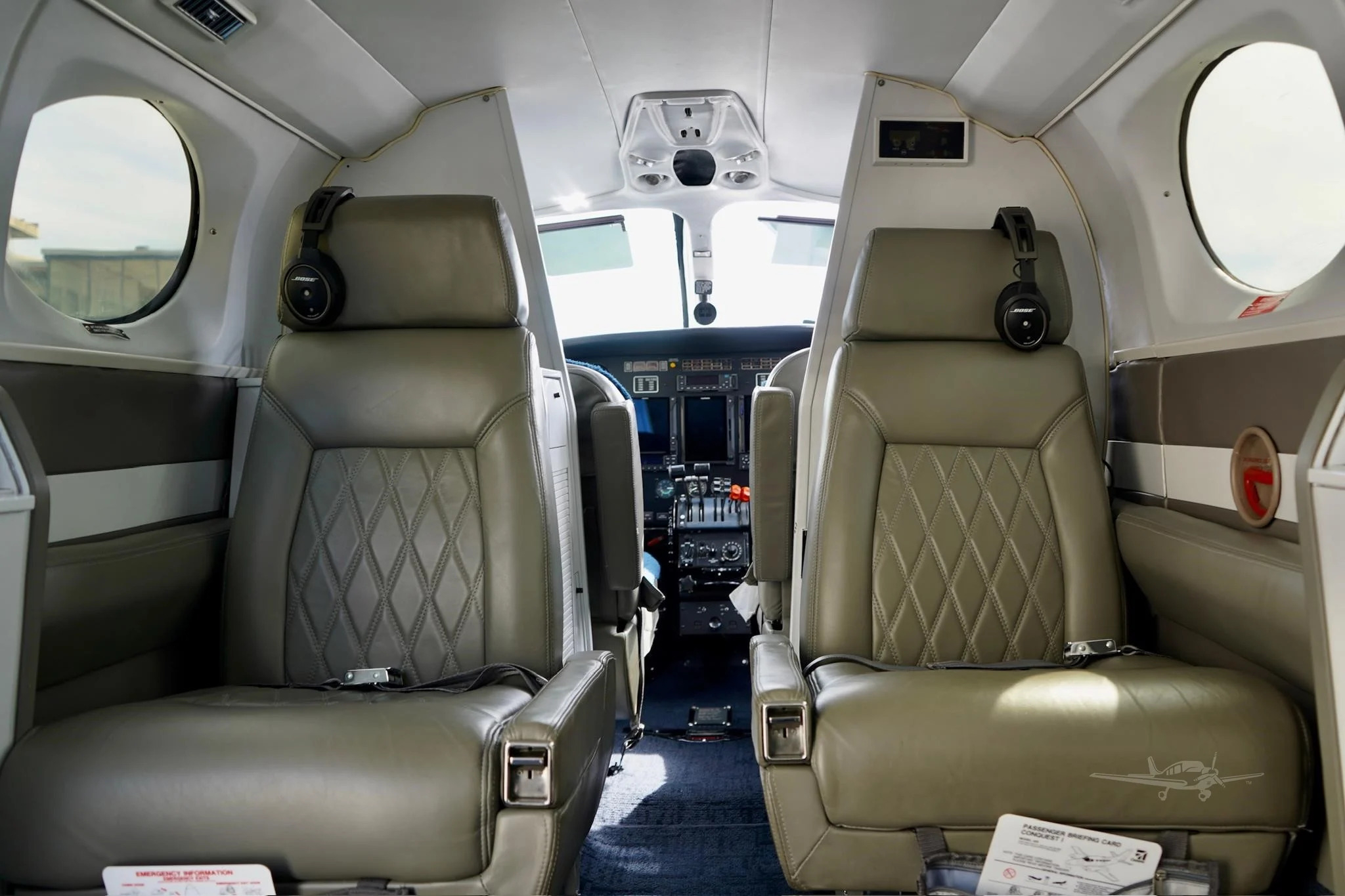 The Conquest I offers a compact, pressurized cabin sized for small groups, typically arranged as a club seating layout with an aft bench or side-facing option depending on interior. Expect a functional cabin rather than a large-cabin experience: adequate space for work or conversation for a few passengers, with typical turboprop sound levels and a cabin cross-section that feels narrower than larger commuter-derived turboprops. Baggage capability varies by configuration and equipment, so operators often plan around a mix of cabin and baggage compartment loading.