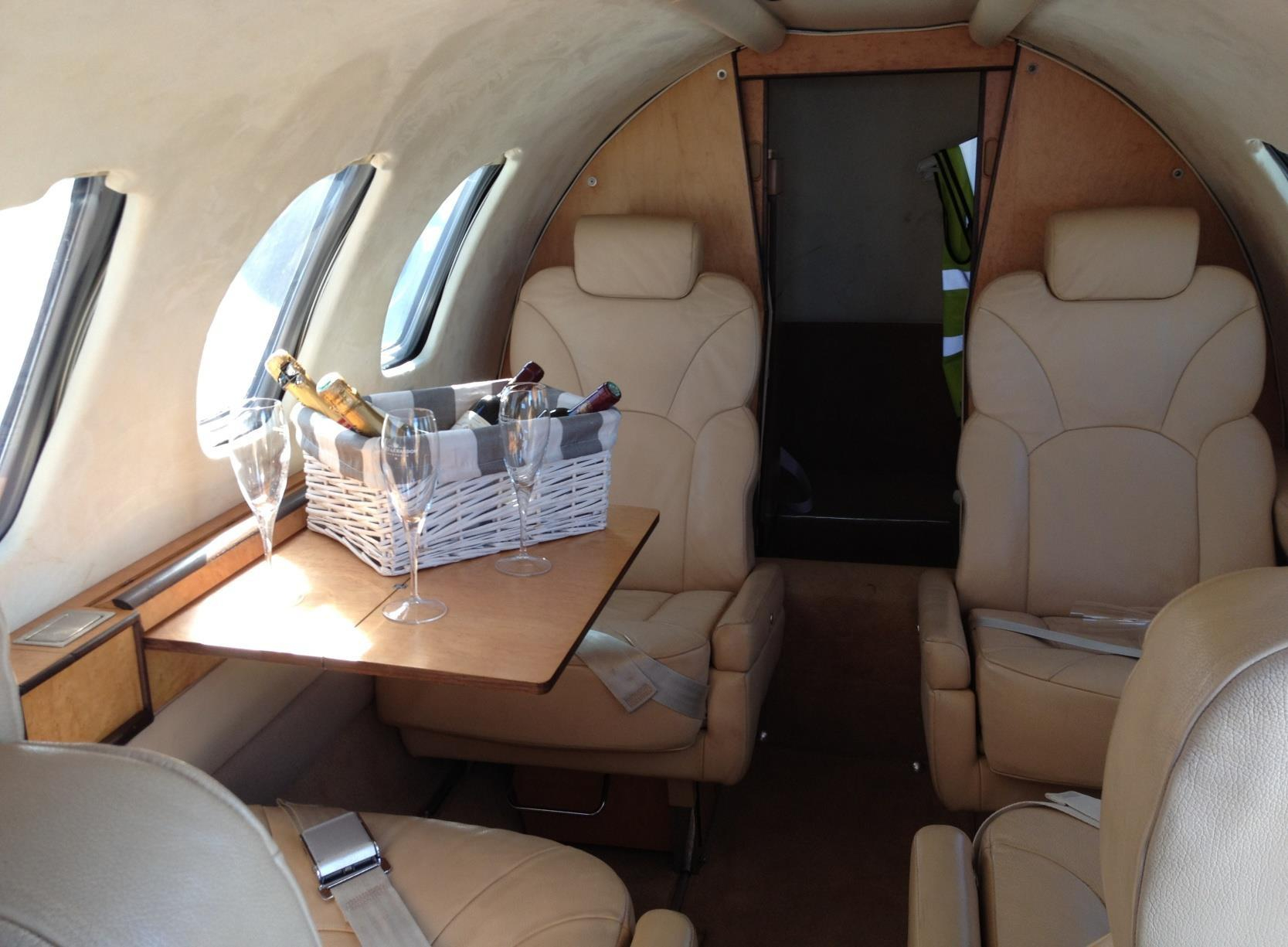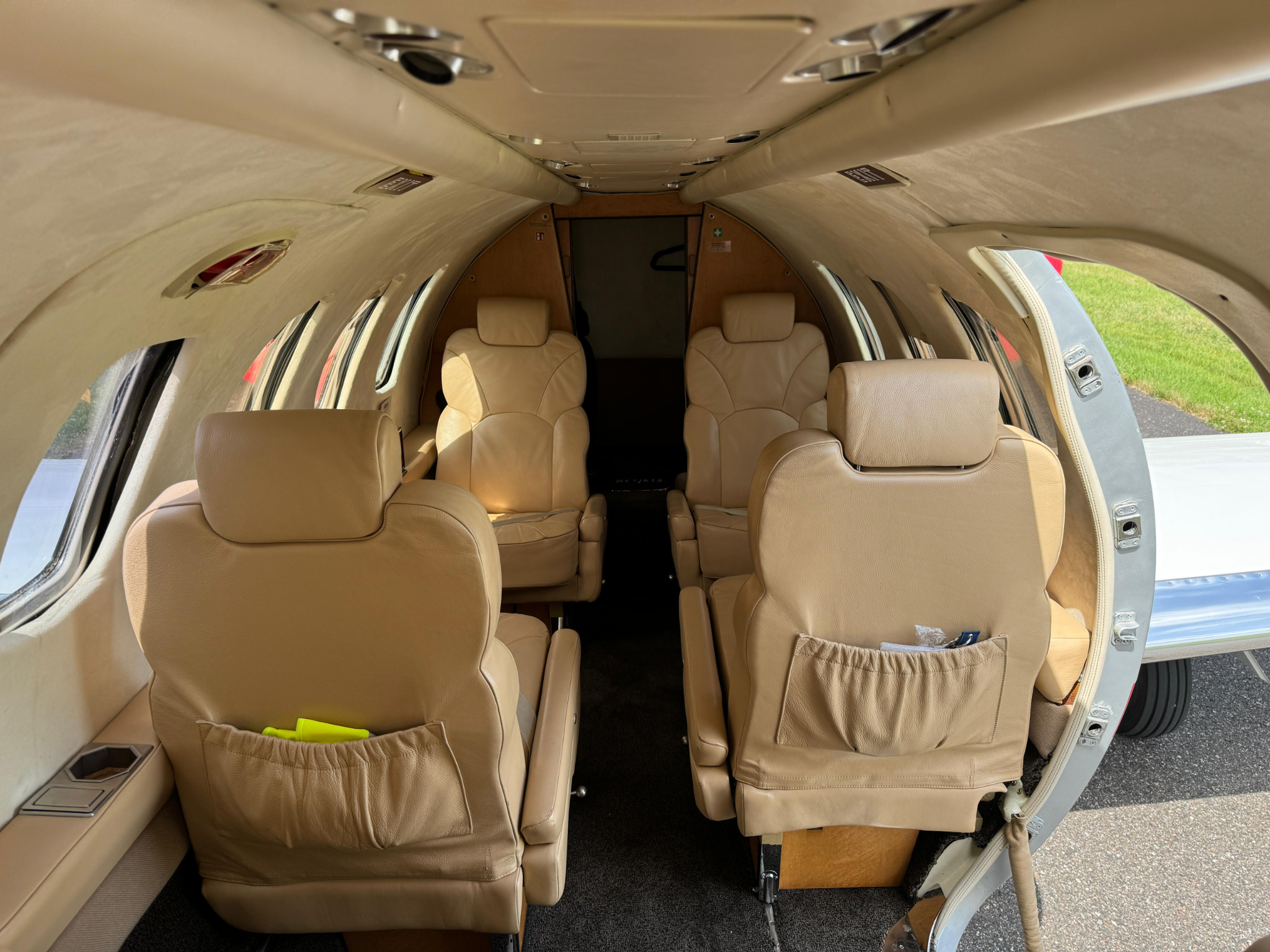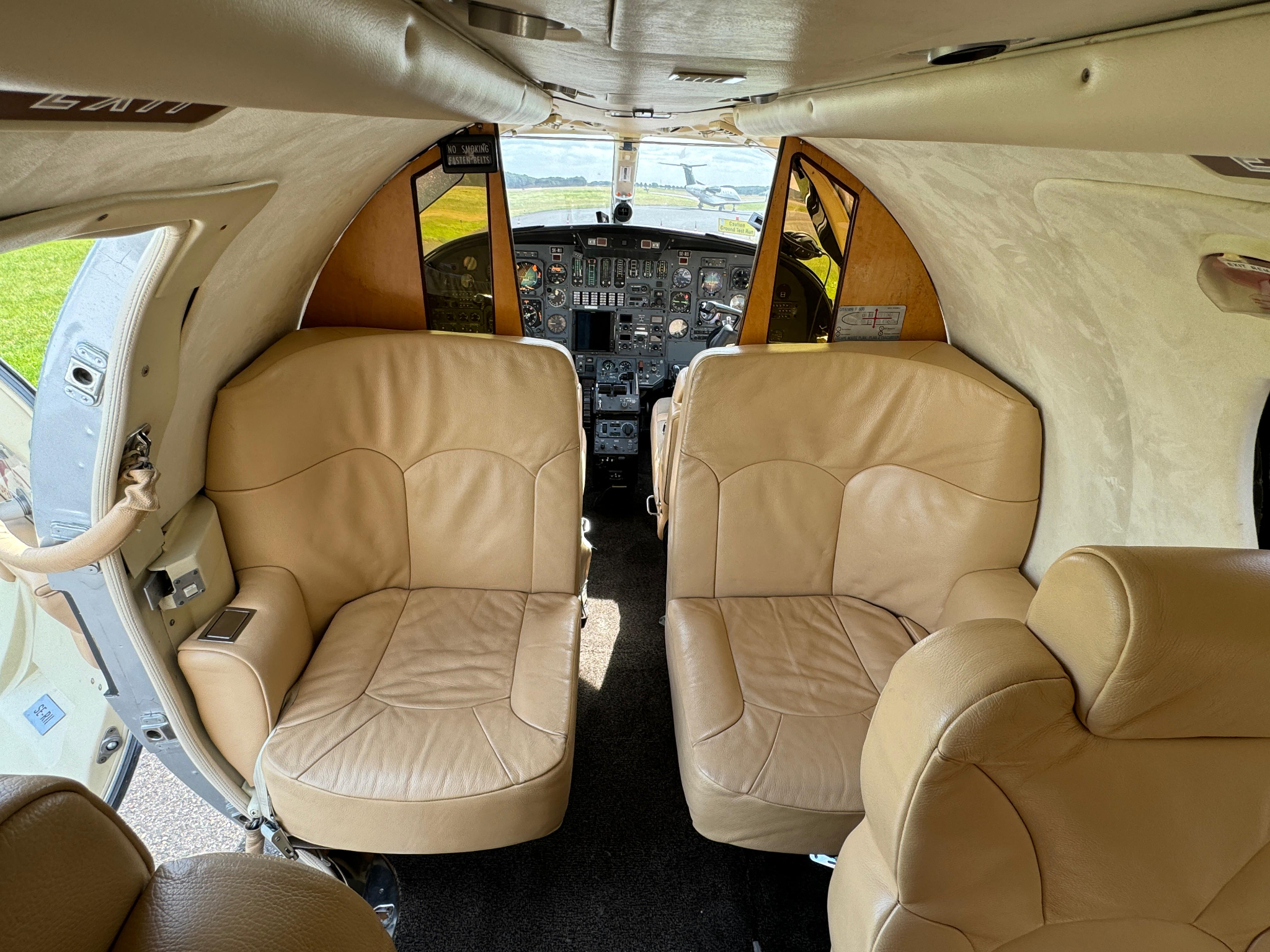 - Interior: Executive configuration for 6 passengers; Beige leather seating; Beige carpeting; Galley; Dual folding tables; Lavatory.