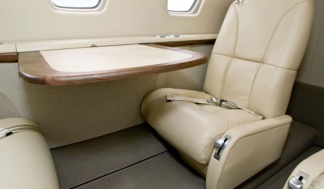• Interior: Executive configuration, 5 single tan leather seats, beige wool carpeting, forward galley with pullout drawers, dual foldout writing tables.