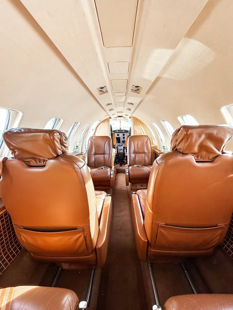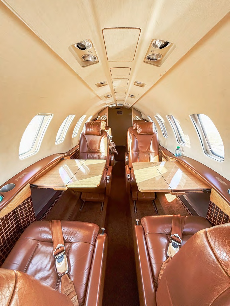 The CJ2 cabin is a compact, club-style environment sized for small groups. Seating is typically arranged for four in a club with additional side-facing or belted seating depending on configuration, making it comfortable for short-to-midrange legs and workable for longer flights when passenger count stays modest. Baggage is generally split between an exterior compartment and smaller in-cabin storage, so packing strategy matters for full-seat missions.
