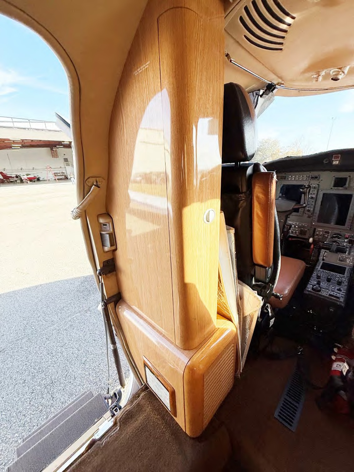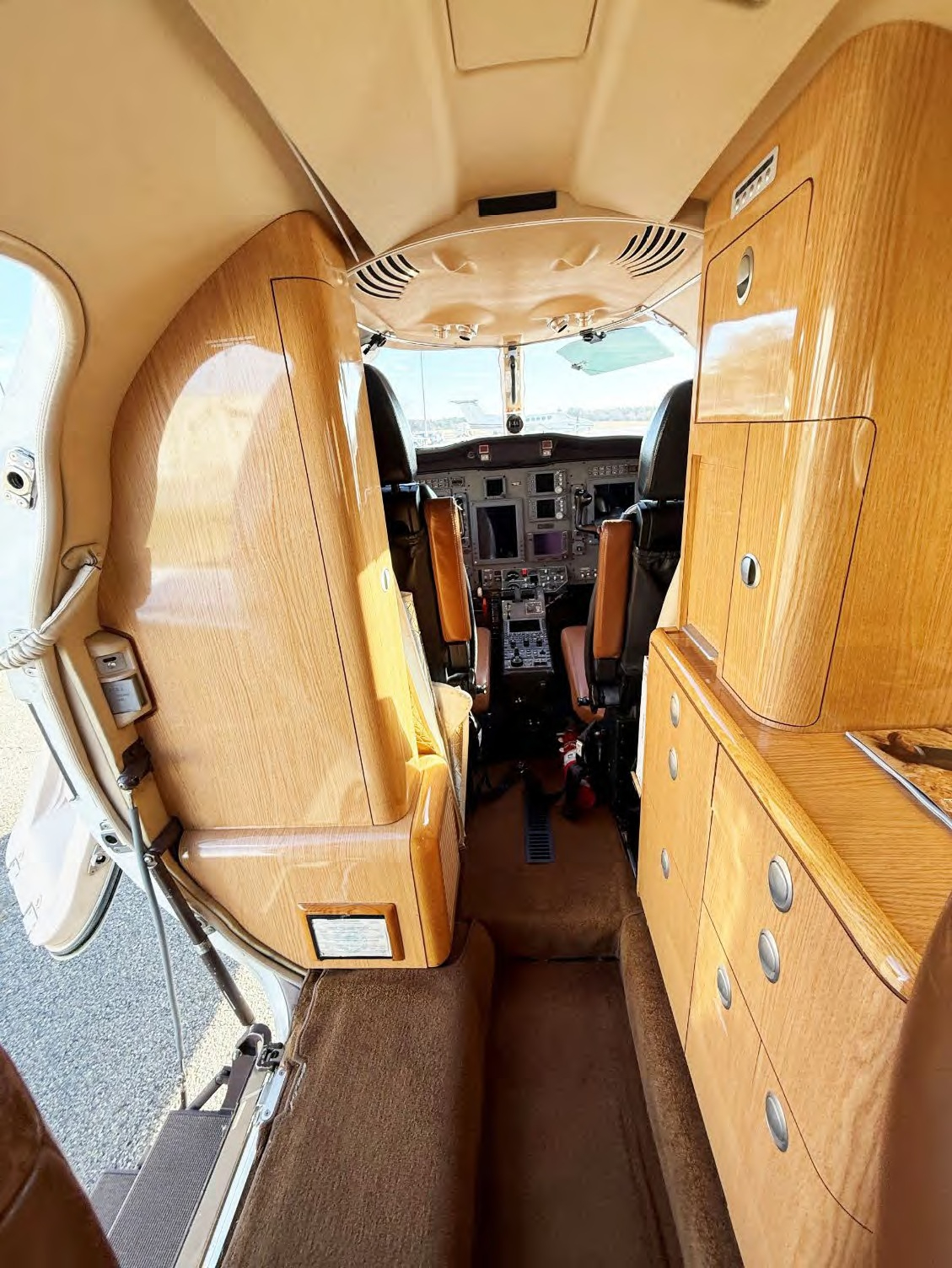 - Seating: Buckskin dark tan leather, forward 4-place club, dual aft forward-facing seats