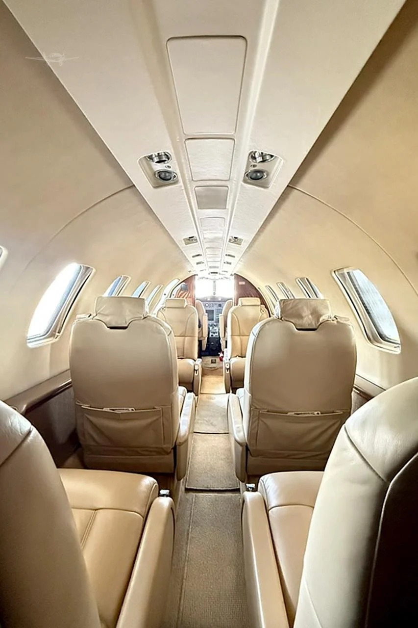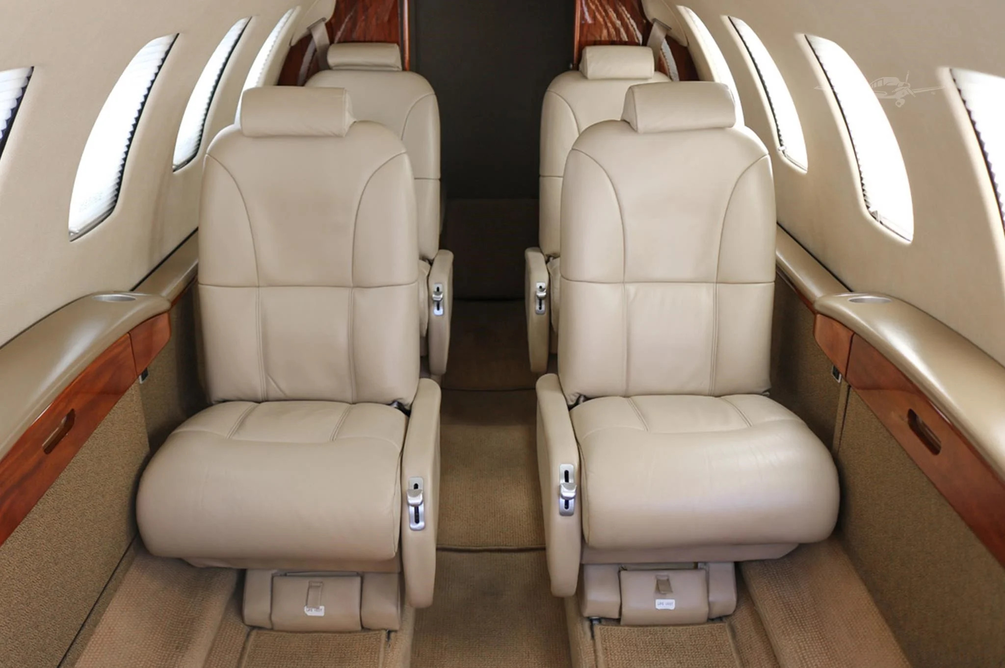 The CJ2 cabin is a compact, club-style environment sized for small groups. Seating is typically arranged for four in a club with additional side-facing or belted seating depending on configuration, making it comfortable for short-to-midrange legs and workable for longer flights when passenger count stays modest. Baggage is generally split between an exterior compartment and smaller in-cabin storage, so packing strategy matters for full-seat missions.