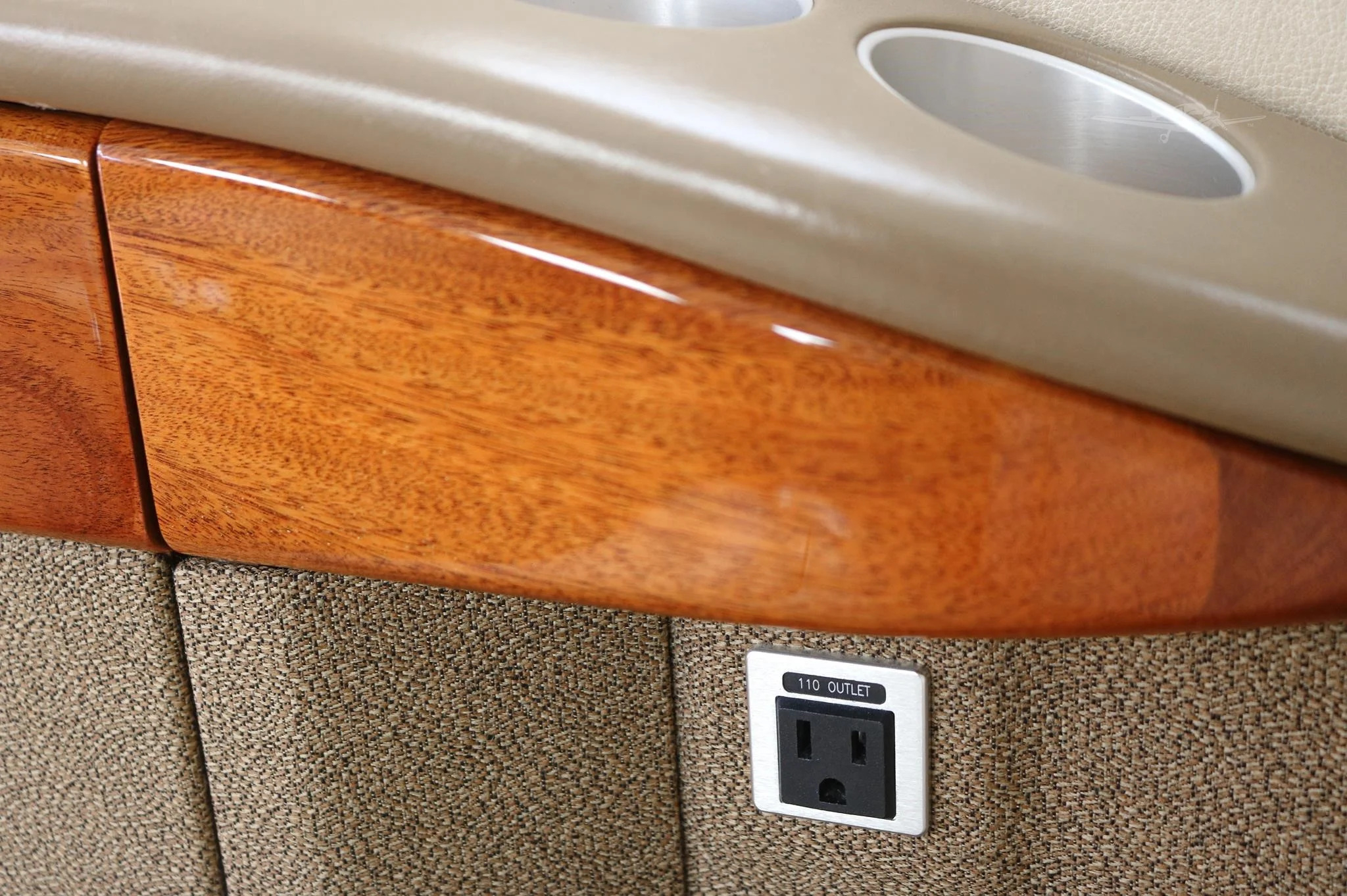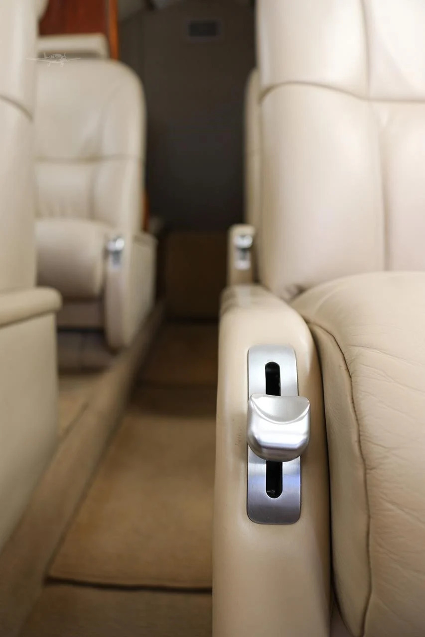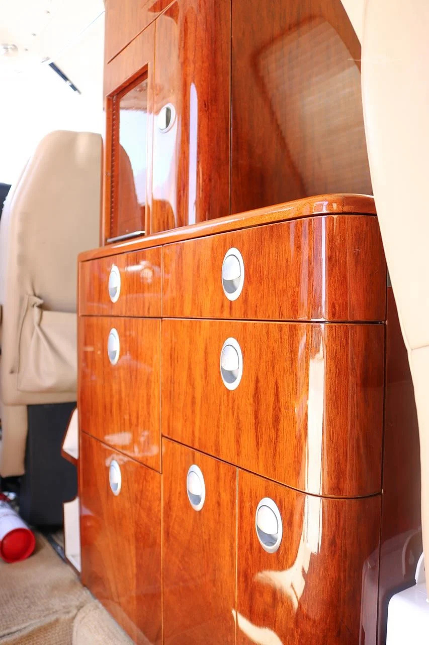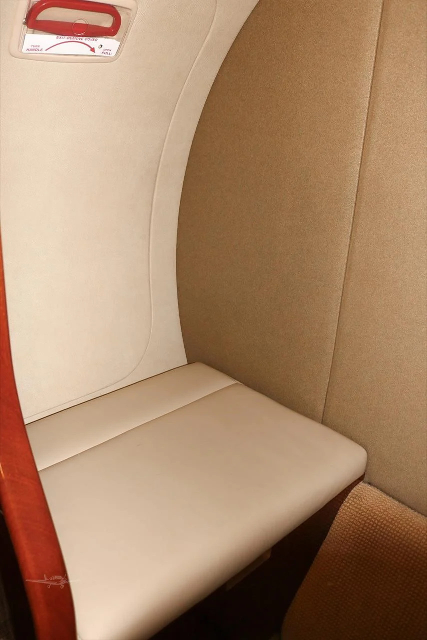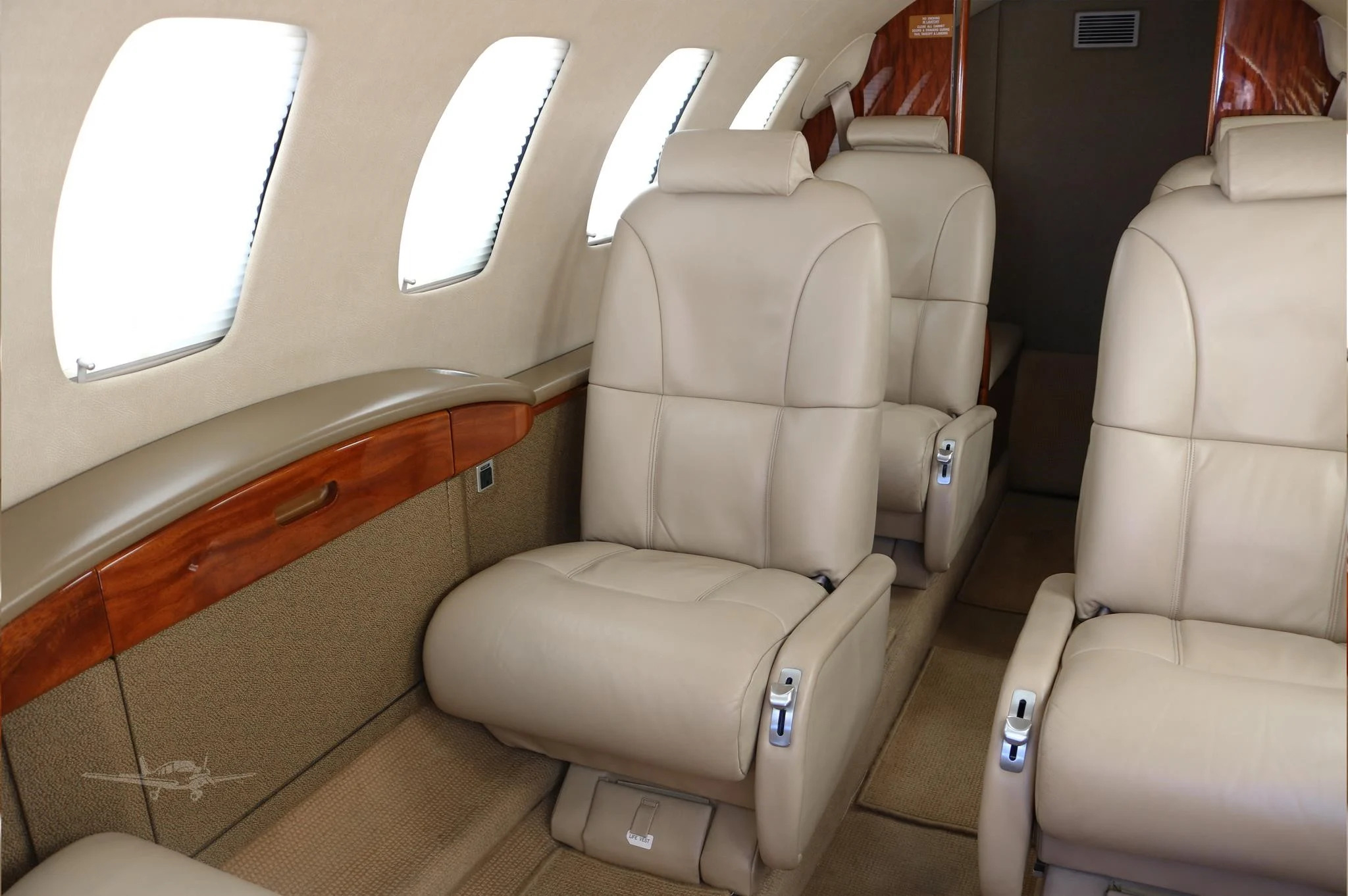 - Interior: Executive configuration for 6 passengers; fireblocked interior; Aspen oatmeal leather seating; forward refreshment center; polished pommele mahogany cabinetry; enclosed aft lavatory.