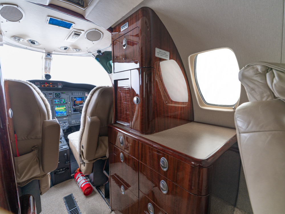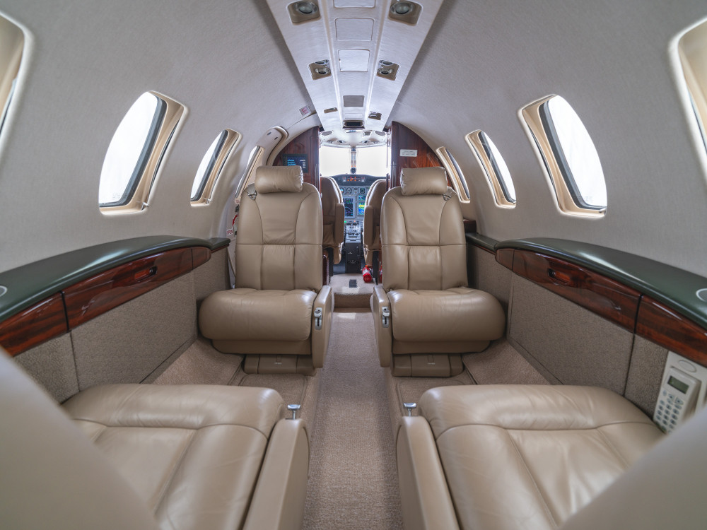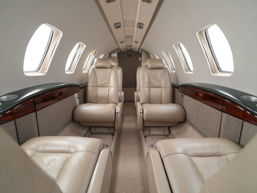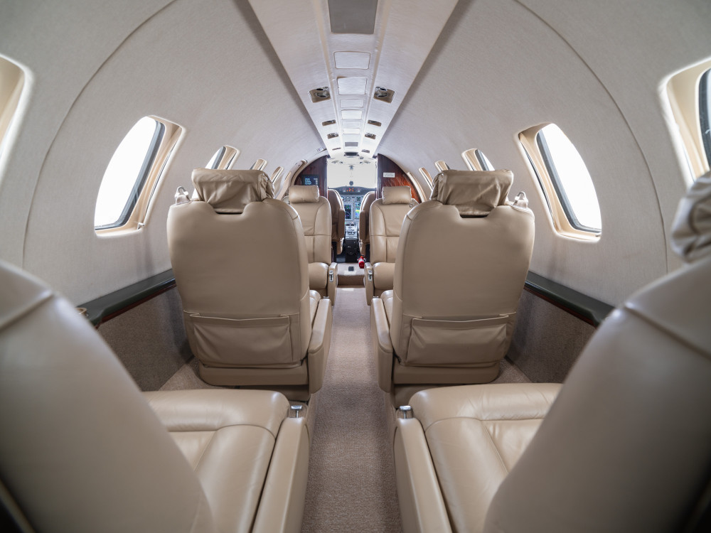 The CJ2 cabin is a compact, club-style environment sized for small groups. Seating is typically arranged for four in a club with additional side-facing or belted seating depending on configuration, making it comfortable for short-to-midrange legs and workable for longer flights when passenger count stays modest. Baggage is generally split between an exterior compartment and smaller in-cabin storage, so packing strategy matters for full-seat missions.