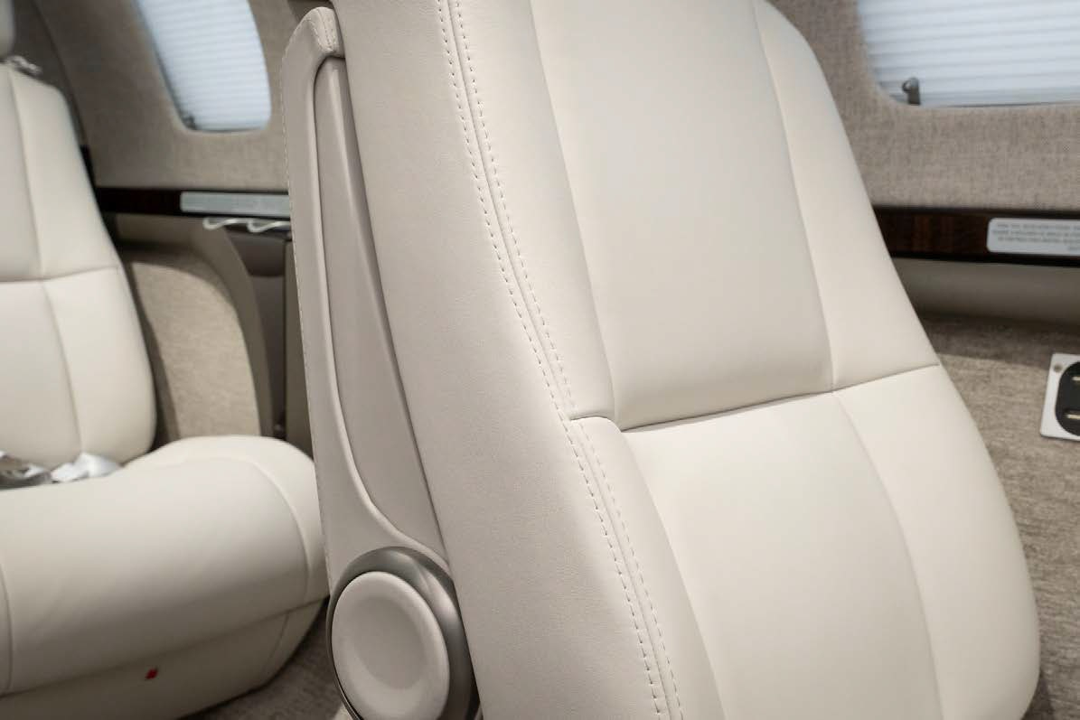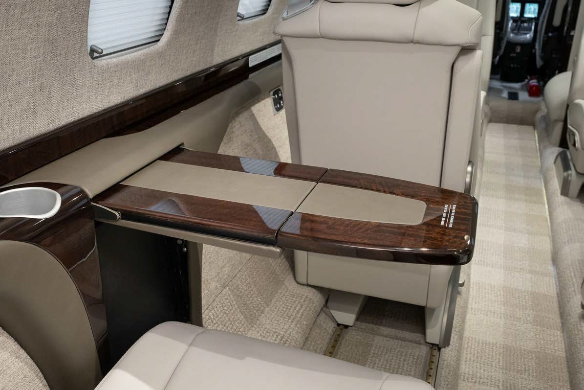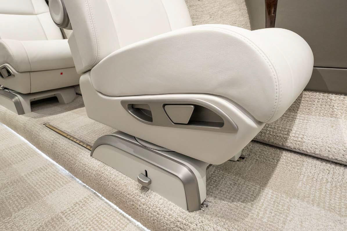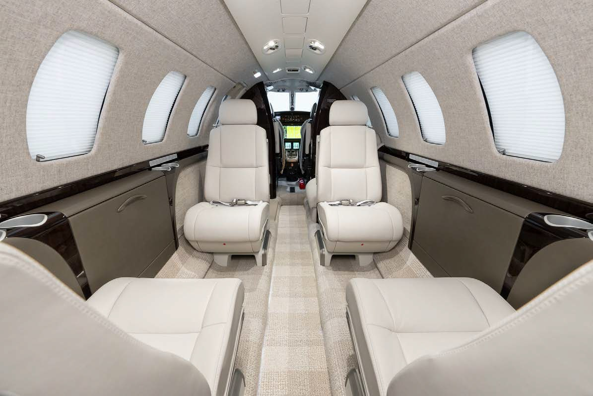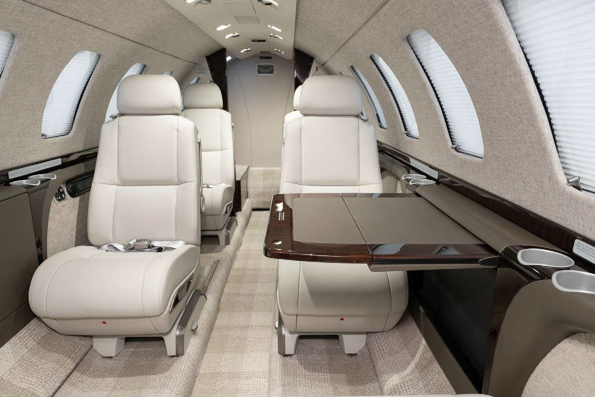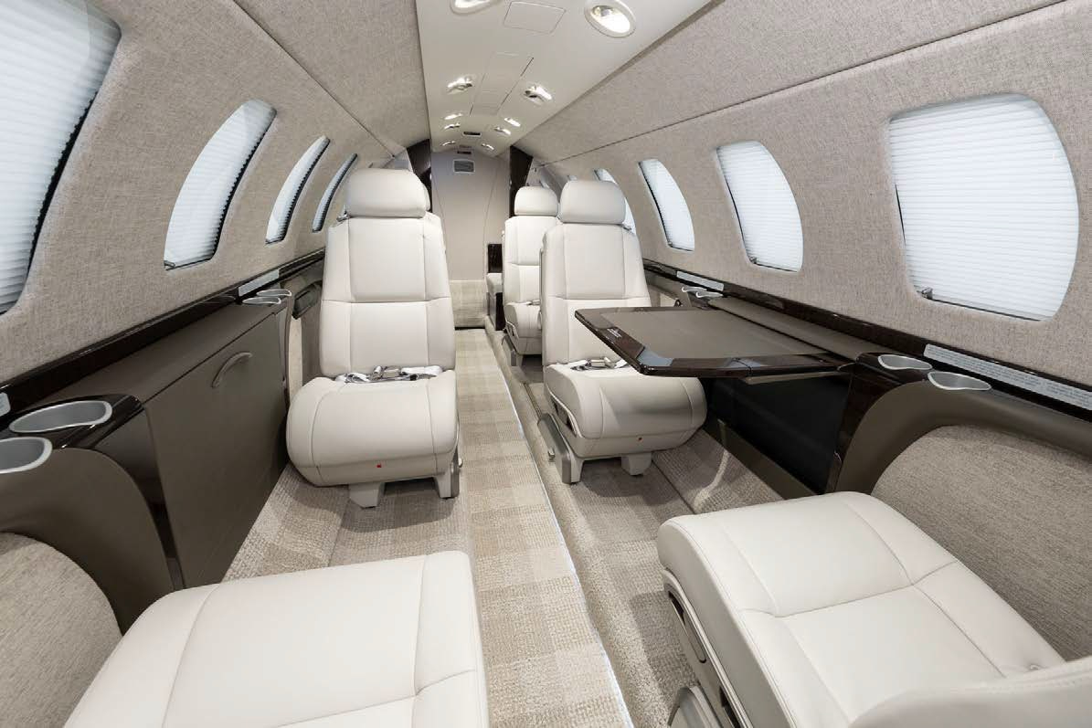 - Interior: Sophisticated configuration for seven passengers + belted lavatory, featuring a refreshment center and swivel seating
