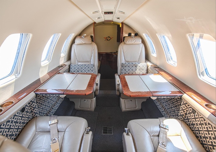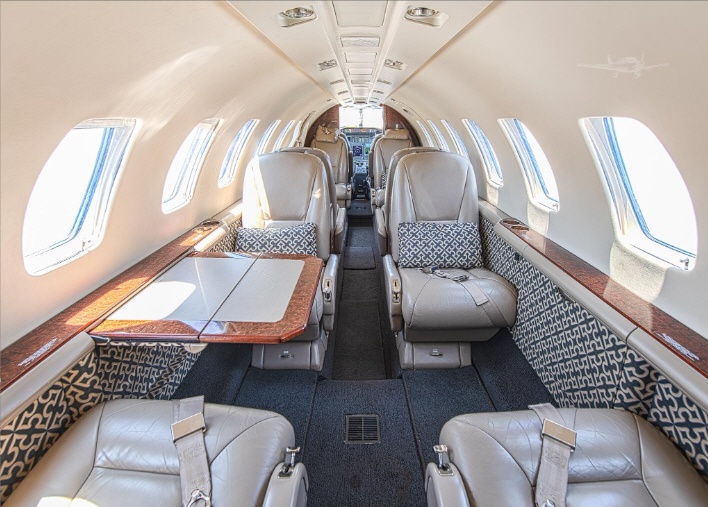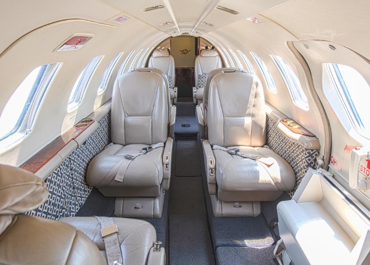 Cabin volume and cross-section follow the Citation V-series, with a straight, usable cabin suited to a small group and luggage. Seating is commonly arranged in a club layout with additional side-facing or forward-facing seating depending on configuration. Expect a functional, business-oriented interior rather than a stand-up cabin; comfort is typically strongest for small-group trips, with adequate baggage provision for standard carry-ons and soft bags.