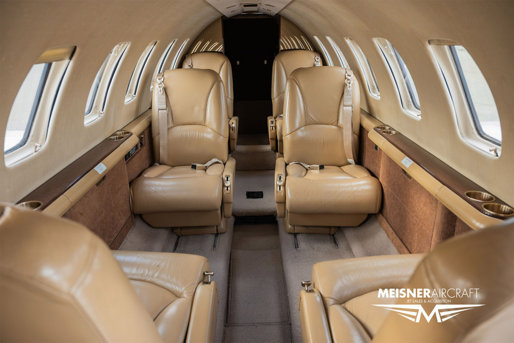 Cabin volume and cross-section follow the Citation V-series, with a straight, usable cabin suited to a small group and luggage. Seating is commonly arranged in a club layout with additional side-facing or forward-facing seating depending on configuration. Expect a functional, business-oriented interior rather than a stand-up cabin; comfort is typically strongest for small-group trips, with adequate baggage provision for standard carry-ons and soft bags.