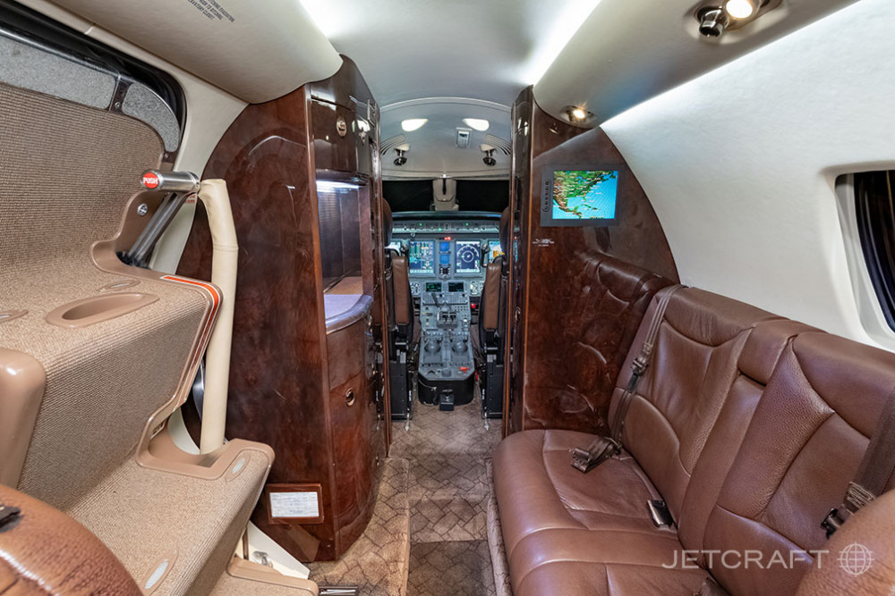 The cabin is sized for comfortable 2+ hour segments and works well for a mix of working and rest. Expect a double-club style layout on many aircraft, an enclosed aft lavatory, and a baggage solution suitable for business luggage on typical passenger counts. Noise, ride, and temperature control are generally aligned with modern Citation expectations, though actual comfort depends on interior refurbishment state and soundproofing condition.