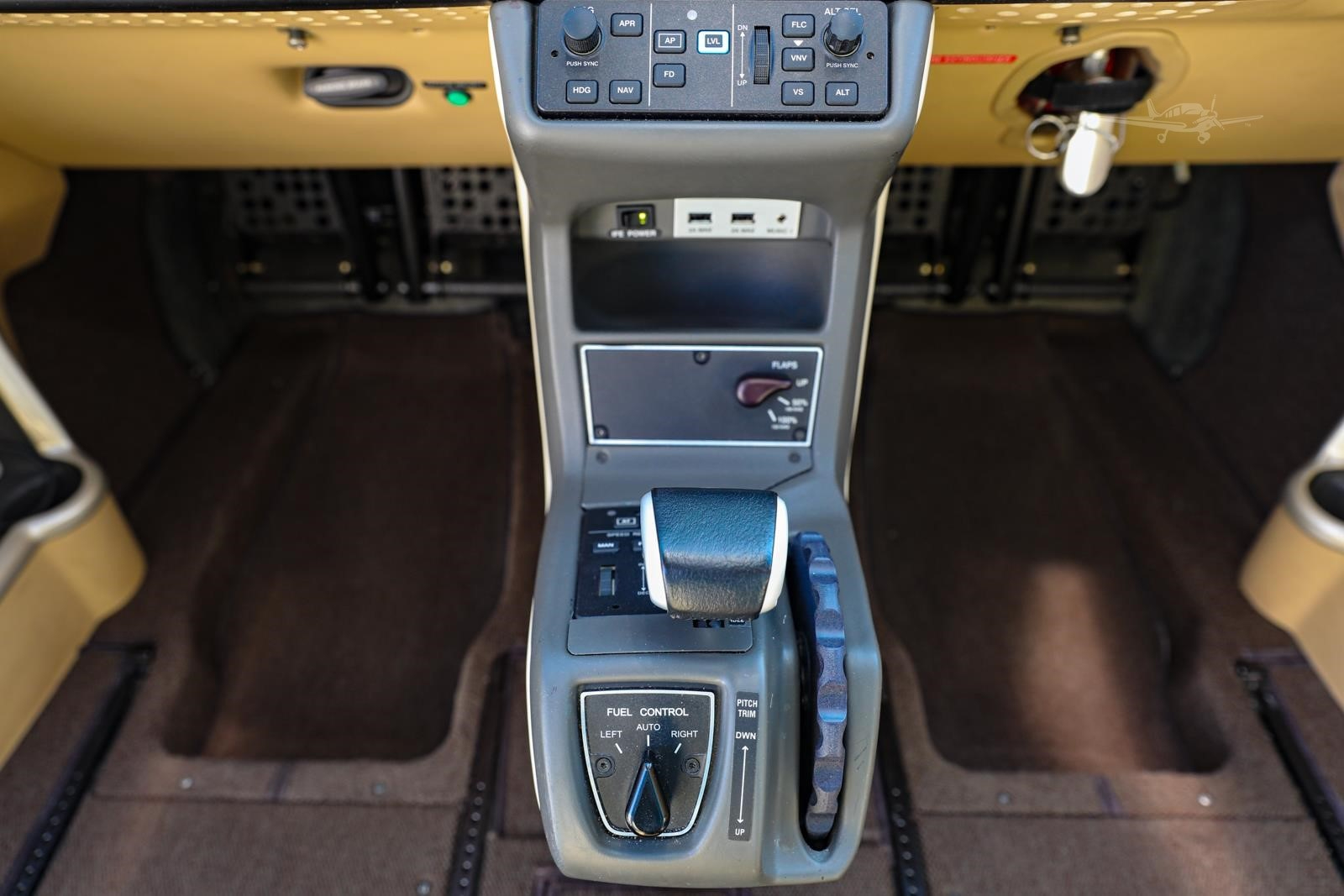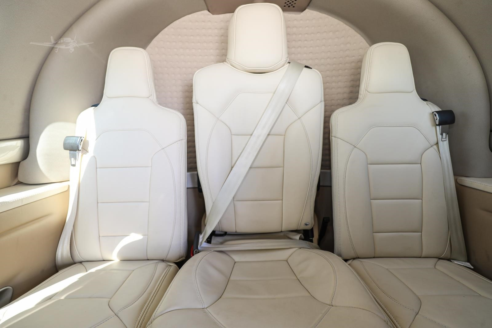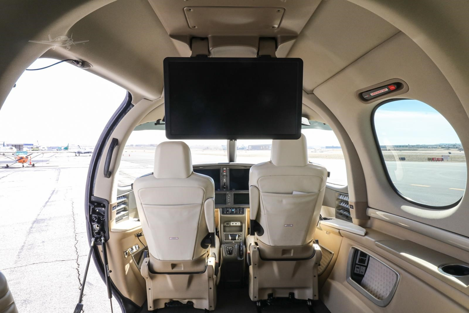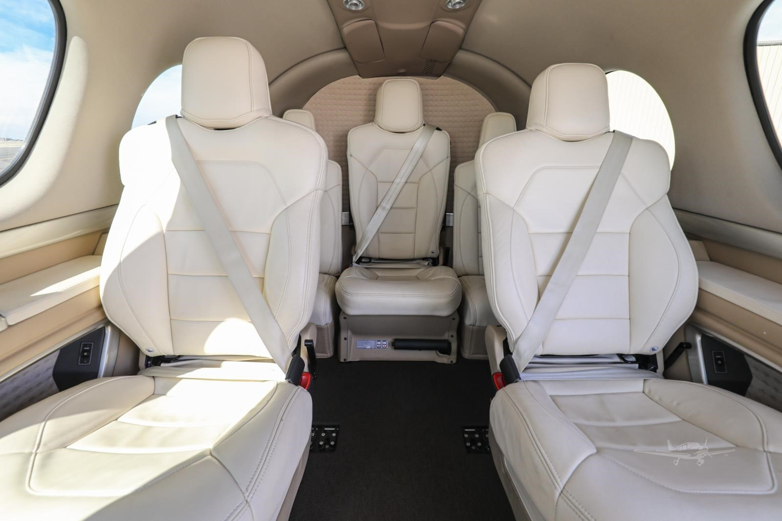 - Interior: Executive configuration, seats 7, premium champagne leather with contrast stitching, modular bolstered leather seating, automatic air conditioning, premium carpeting, stow-away tray tables, 22-inch entertainment display, and Wi-Fi ground link.