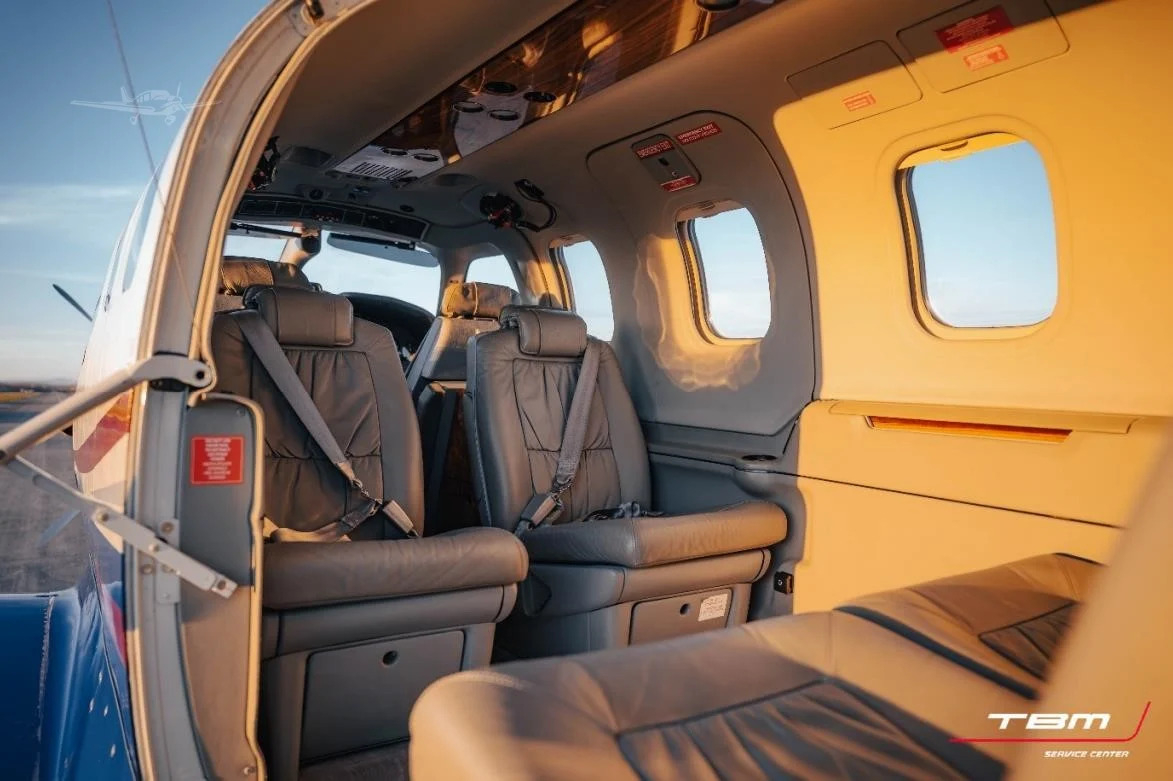 The pressurized cabin is arranged around a club-style seating concept with a forward cockpit separated from the cabin, providing a quieter, more stable ride than pistons at similar trip lengths. Cabin comfort is oriented toward functional business travel: upright seating, adequate personal space for a turboprop, and baggage accommodations suited to typical carry-on and soft luggage loads rather than large hard cases.