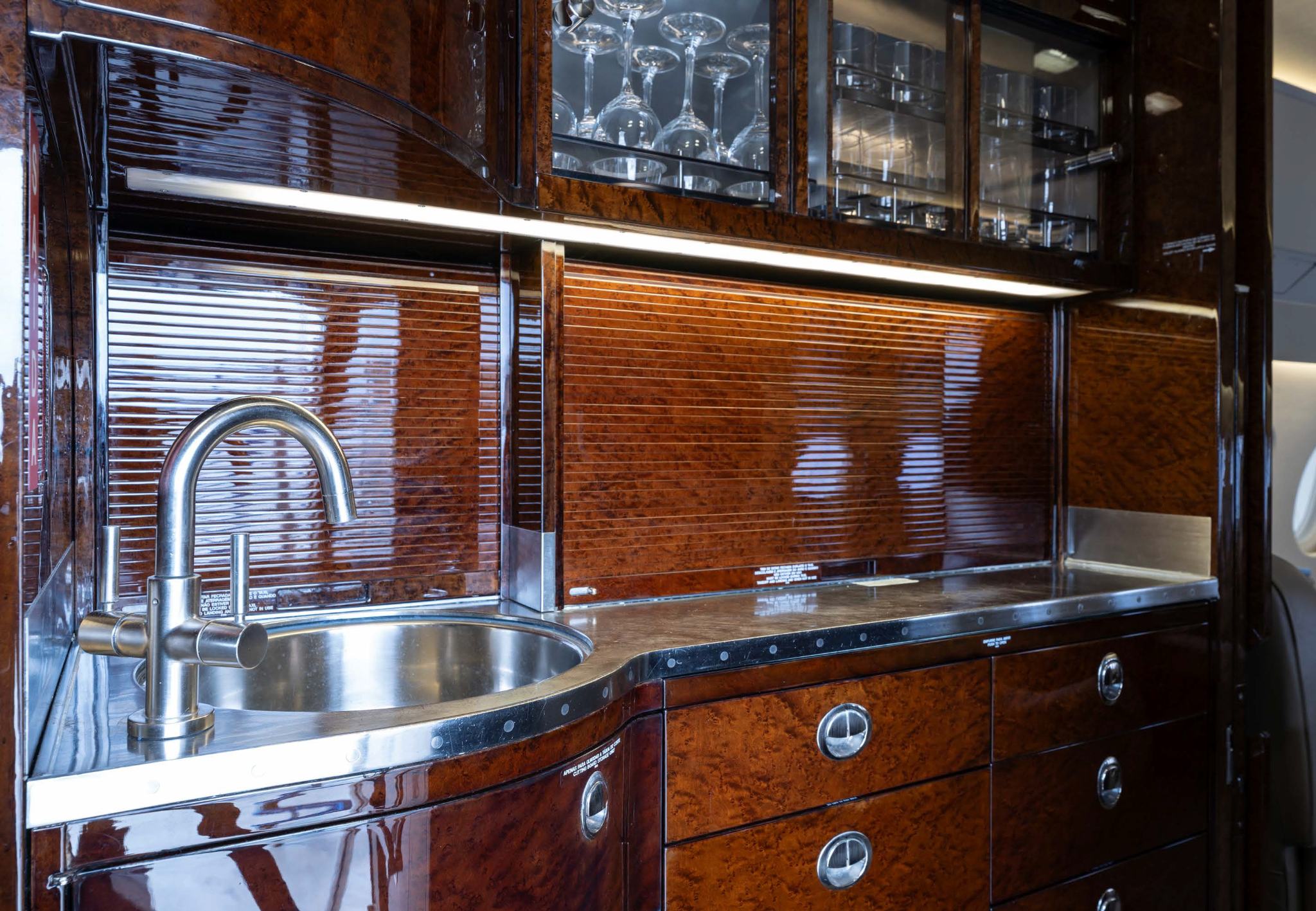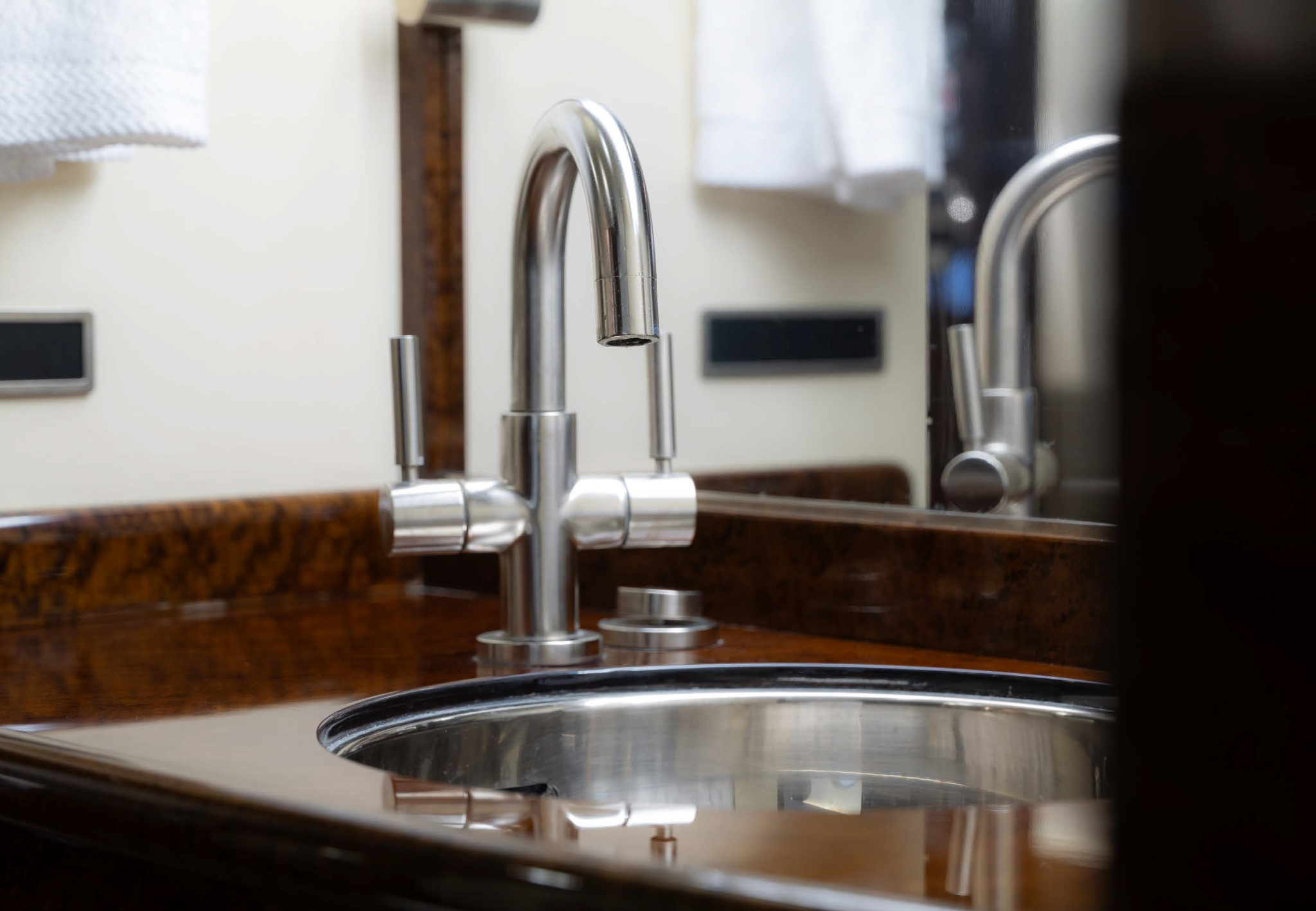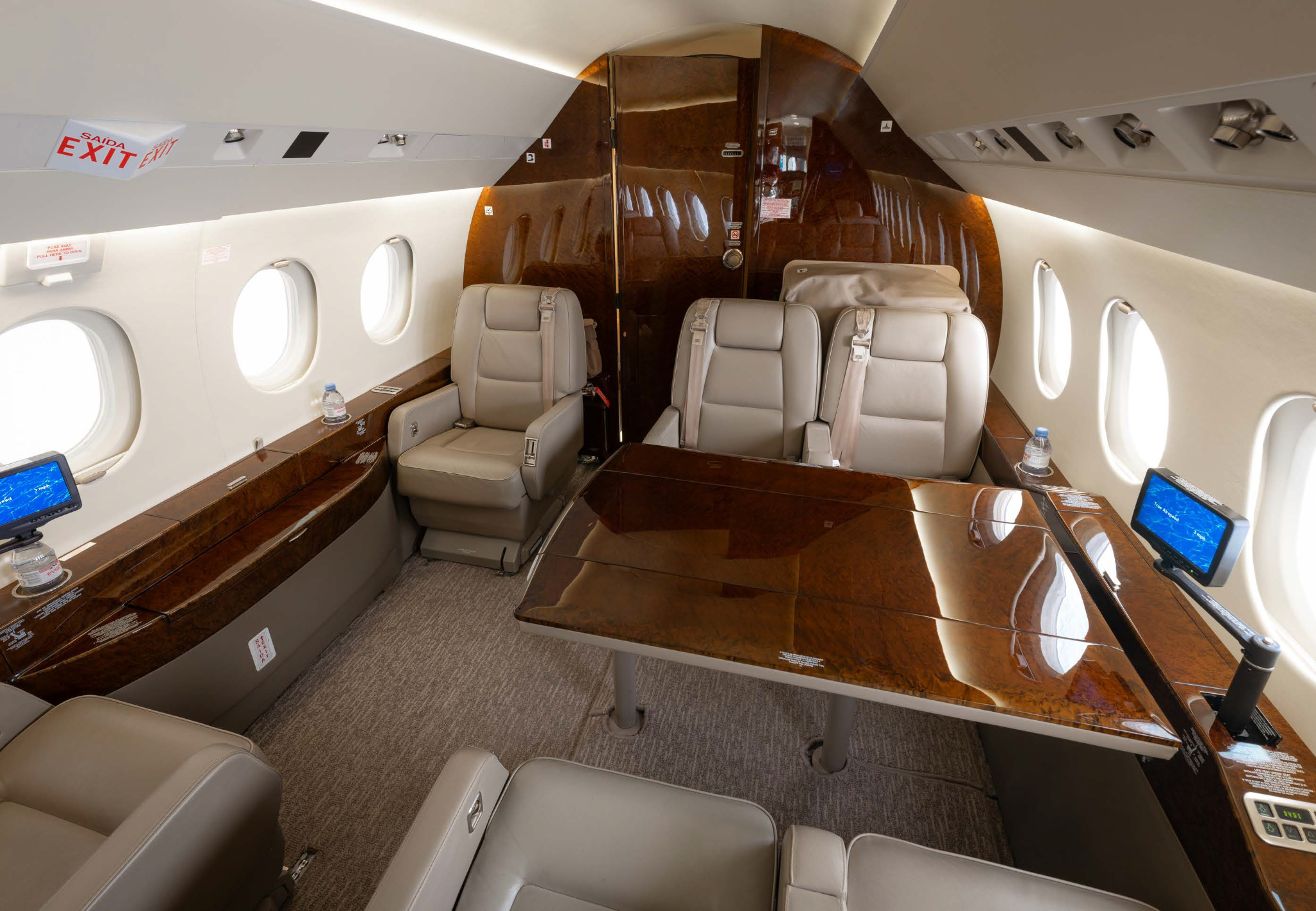 - Interior: 10-passenger configuration with aft conference group; features a large galley with espresso maker, brushed nickel plating, and medium birdseye maple cabinetry; cabin refurbished in 2016, 2020, and 2025.