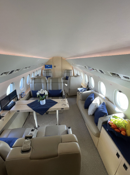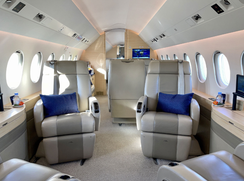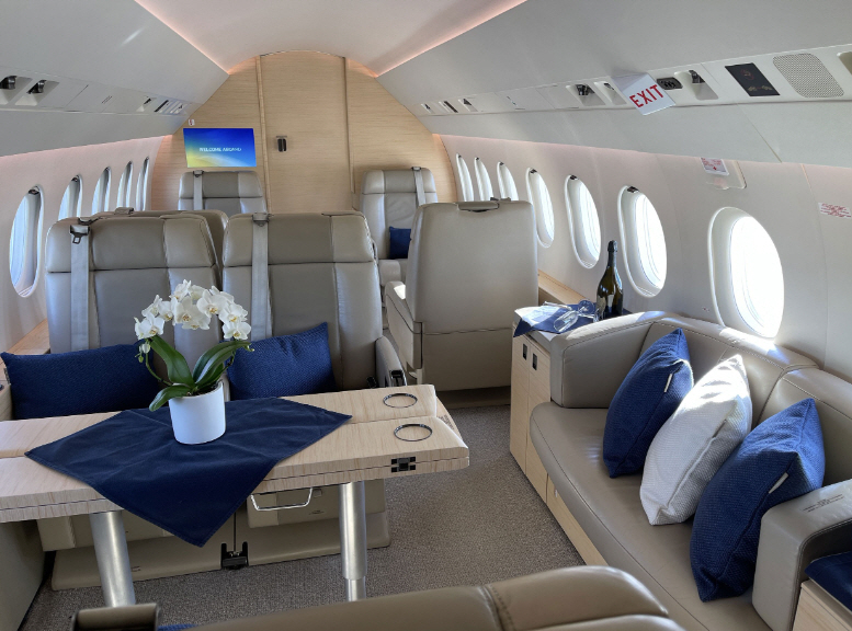 The cabin is known for its width and a layout that supports productive work and quieter conversation, with enough volume for multiple living zones depending on configuration. Typical arrangements seat 8–10 in a club and conference grouping, with an enclosed aft lavatory and a forward galley area. Baggage capacity is suitable for longer trips, and the cabin cross-section generally feels less restrictive than narrower super-midsize cabins, especially for shoulder room and aisle movement.