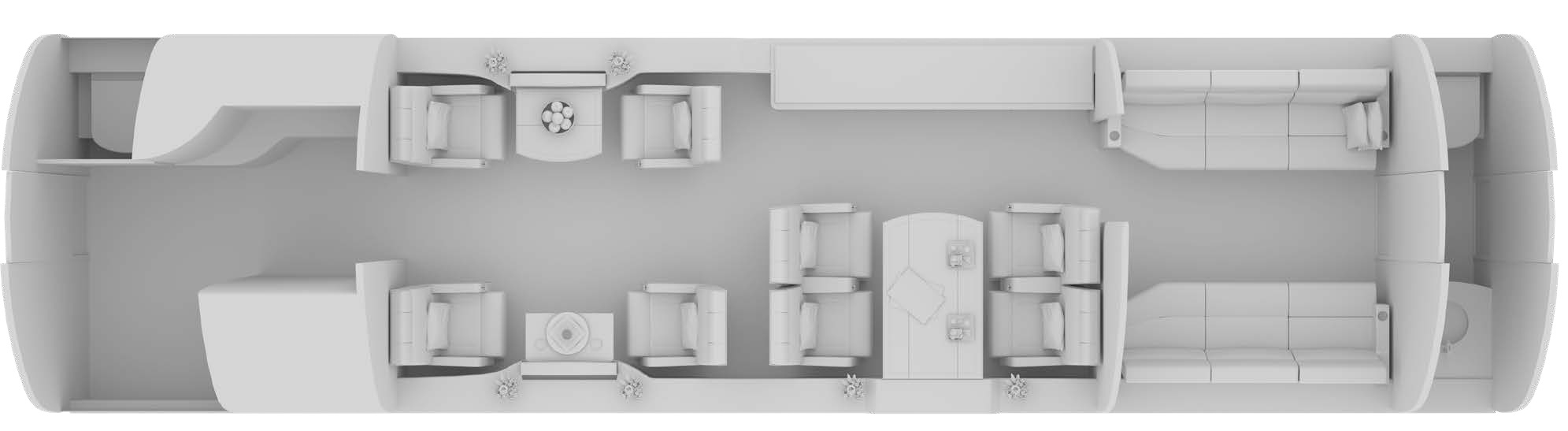 The cabin is arranged for long-duration comfort with a conventional large-cabin cross-section, a true galley area, and an aft lavatory, commonly complemented by an optional crew rest or additional storage depending on configuration. Most interiors support a balance of meeting and dining in the forward zones with a quieter rest environment aft. Baggage capacity is oriented toward international trips, with in-flight access depending on the specific interior and baggage layout.