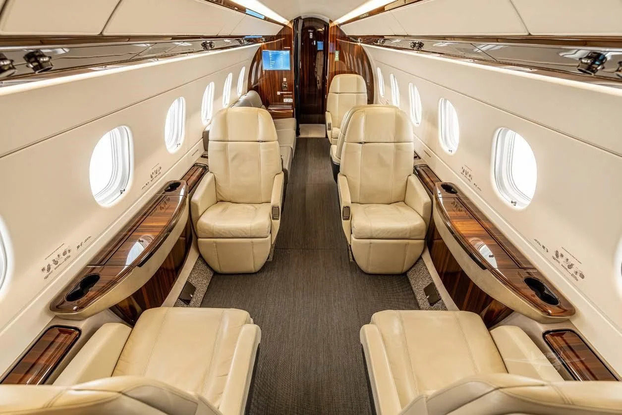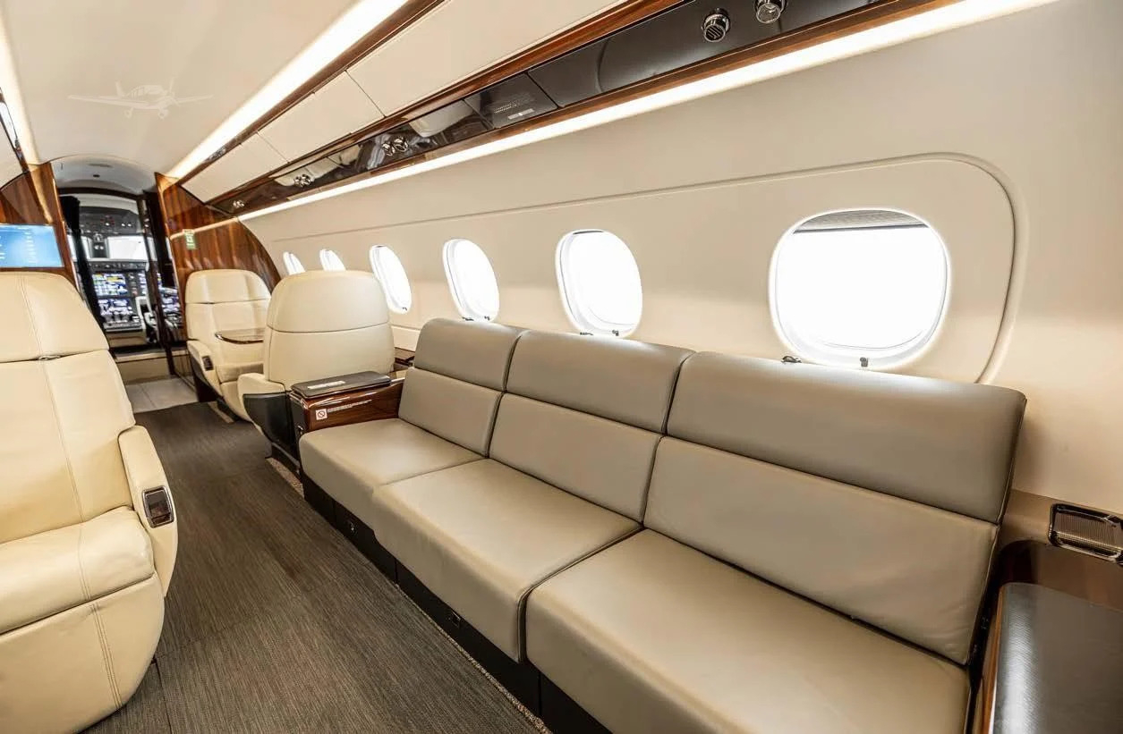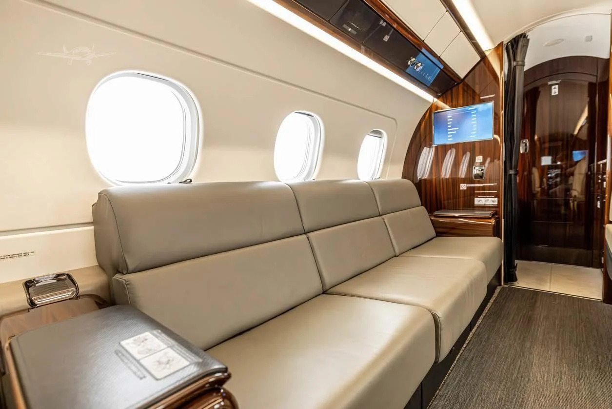 The cabin is designed around a flat floor and stand-up height, with a club seating core and an aft zone that often supports an additional seating grouping or divan depending on configuration. Large windows and a comparatively wide cross-section for the class contribute to an open feel. Baggage access and total volume are generally suitable for multi-day trips for a typical business load, but exact usability depends on interior layout and occupancy.