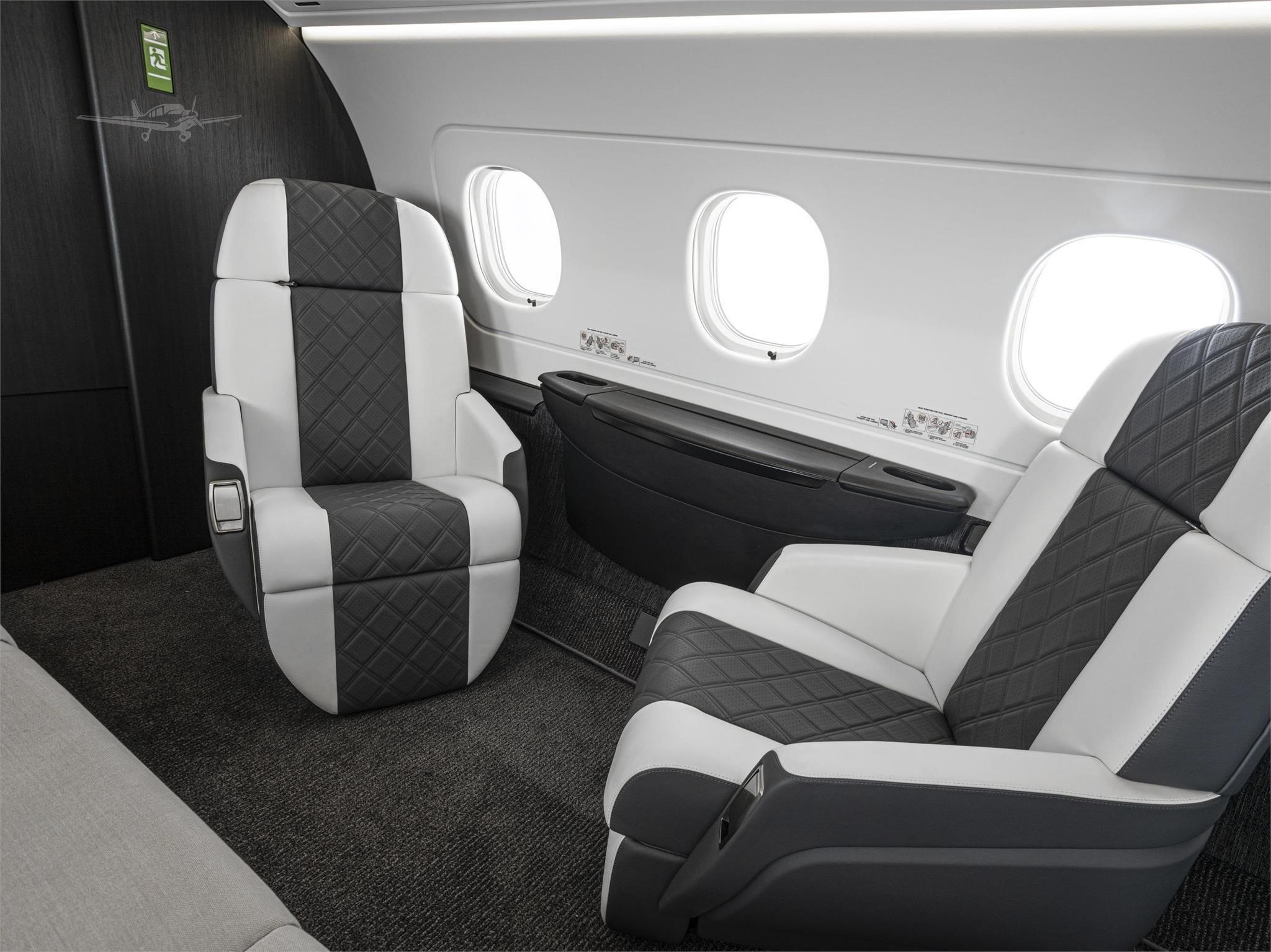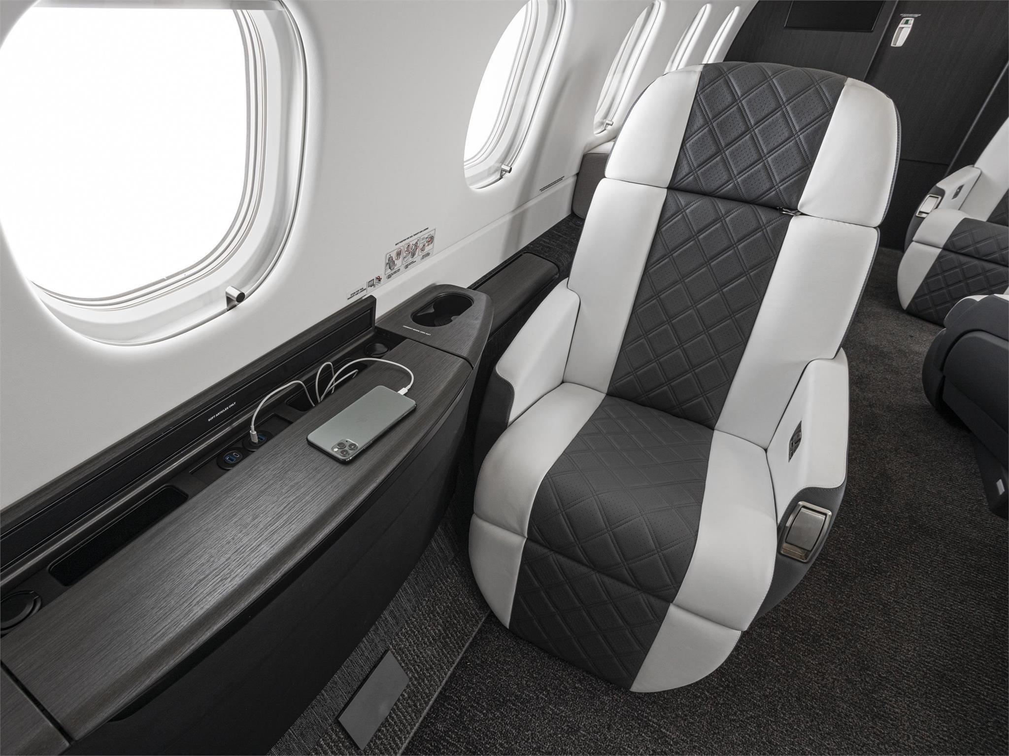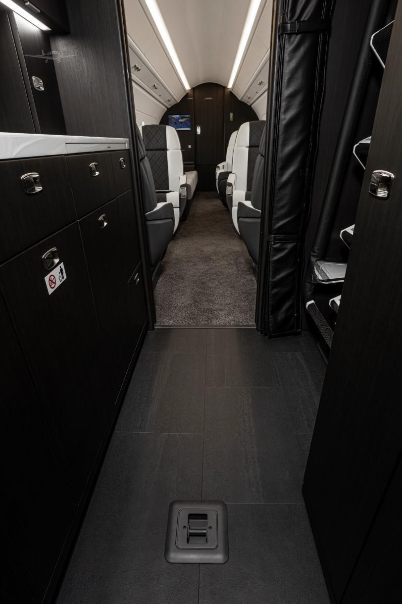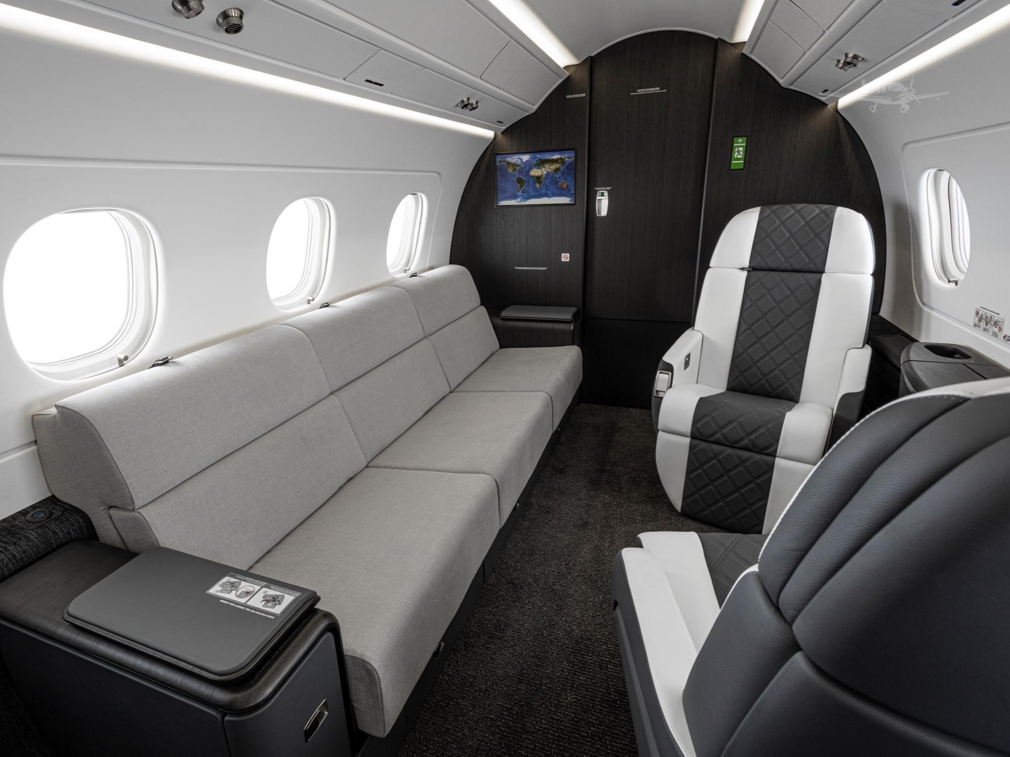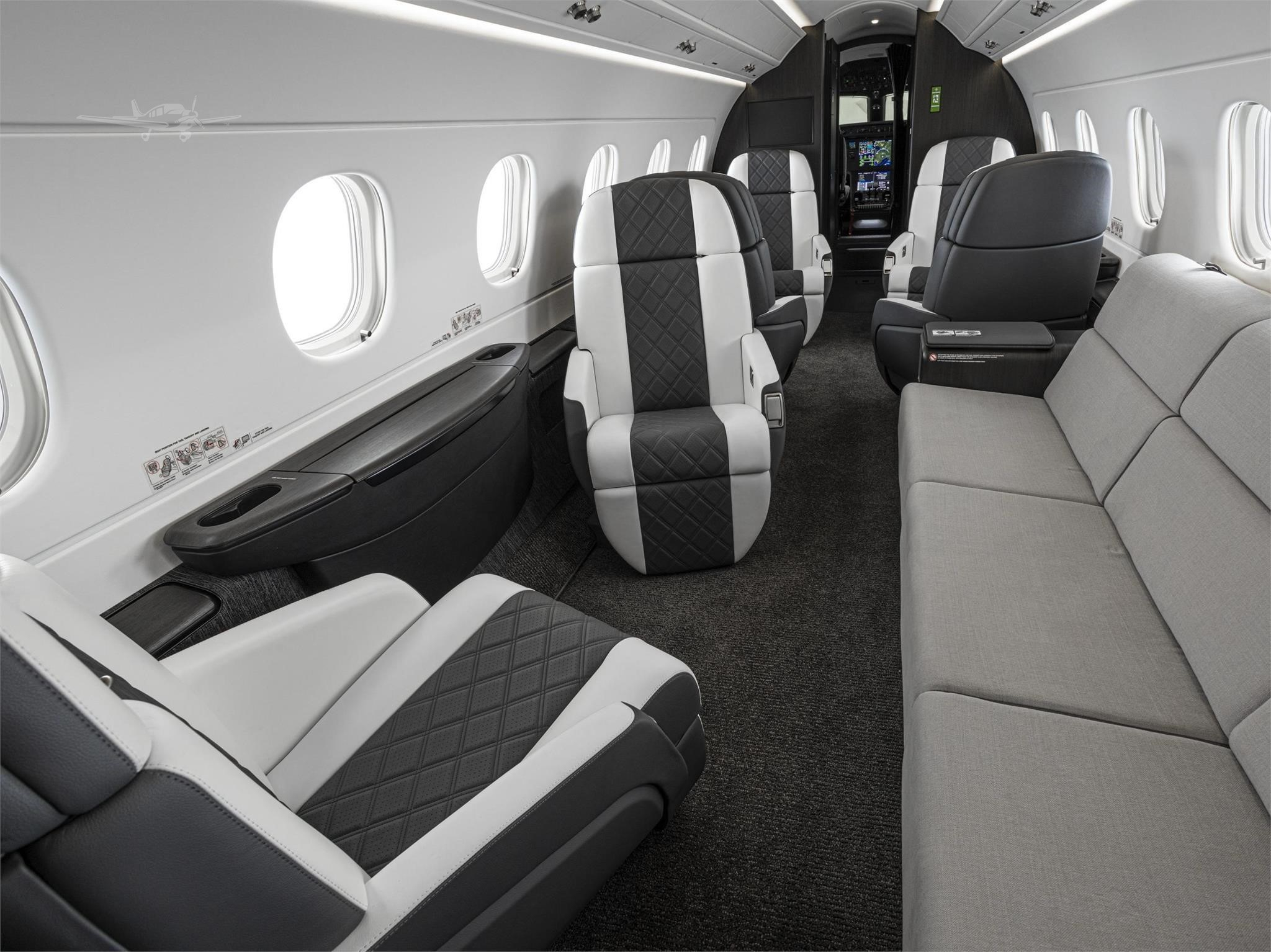 The cabin is designed around a flat floor and stand-up height, with a club seating core and an aft zone that often supports an additional seating grouping or divan depending on configuration. Large windows and a comparatively wide cross-section for the class contribute to an open feel. Baggage access and total volume are generally suitable for multi-day trips for a typical business load, but exact usability depends on interior layout and occupancy.