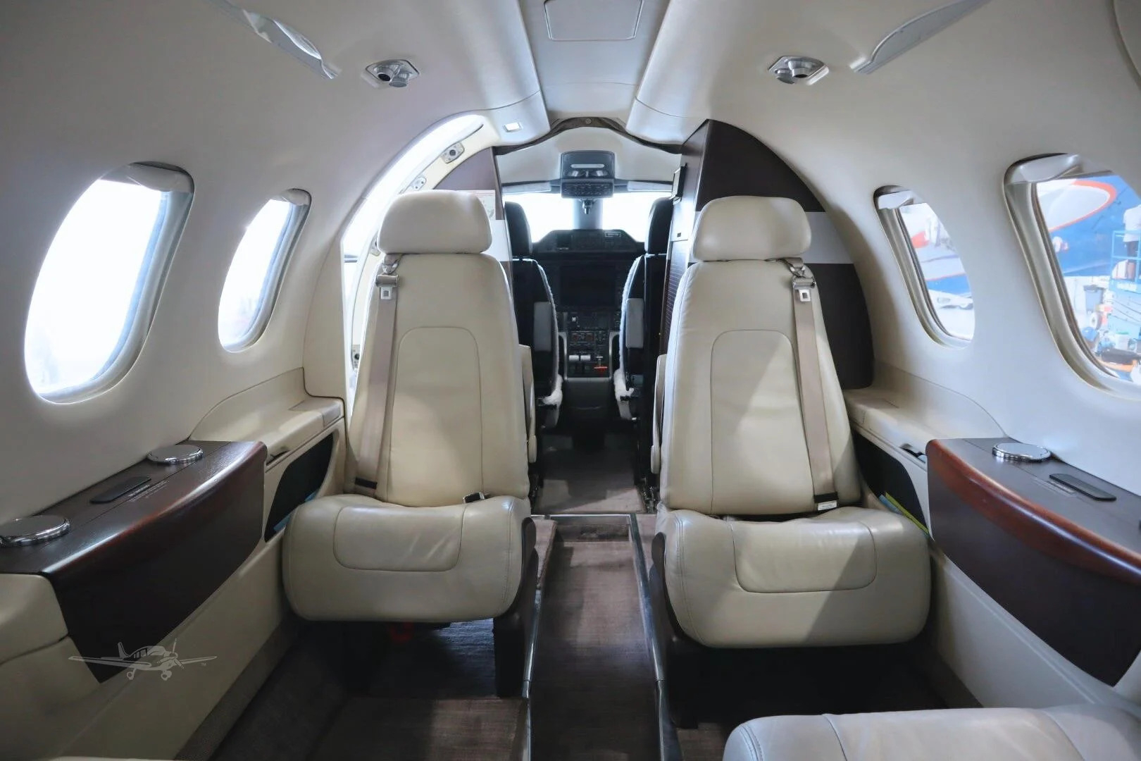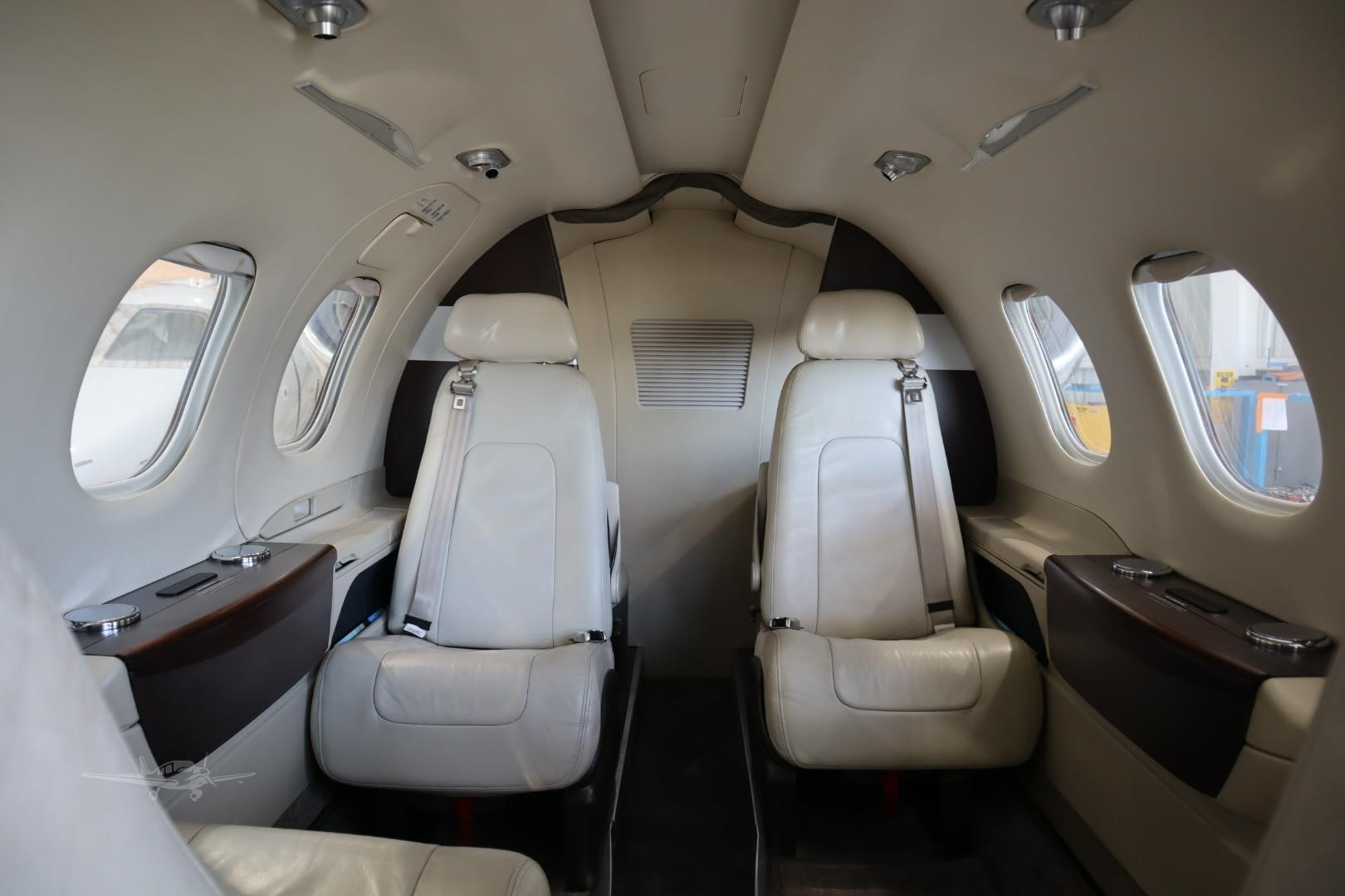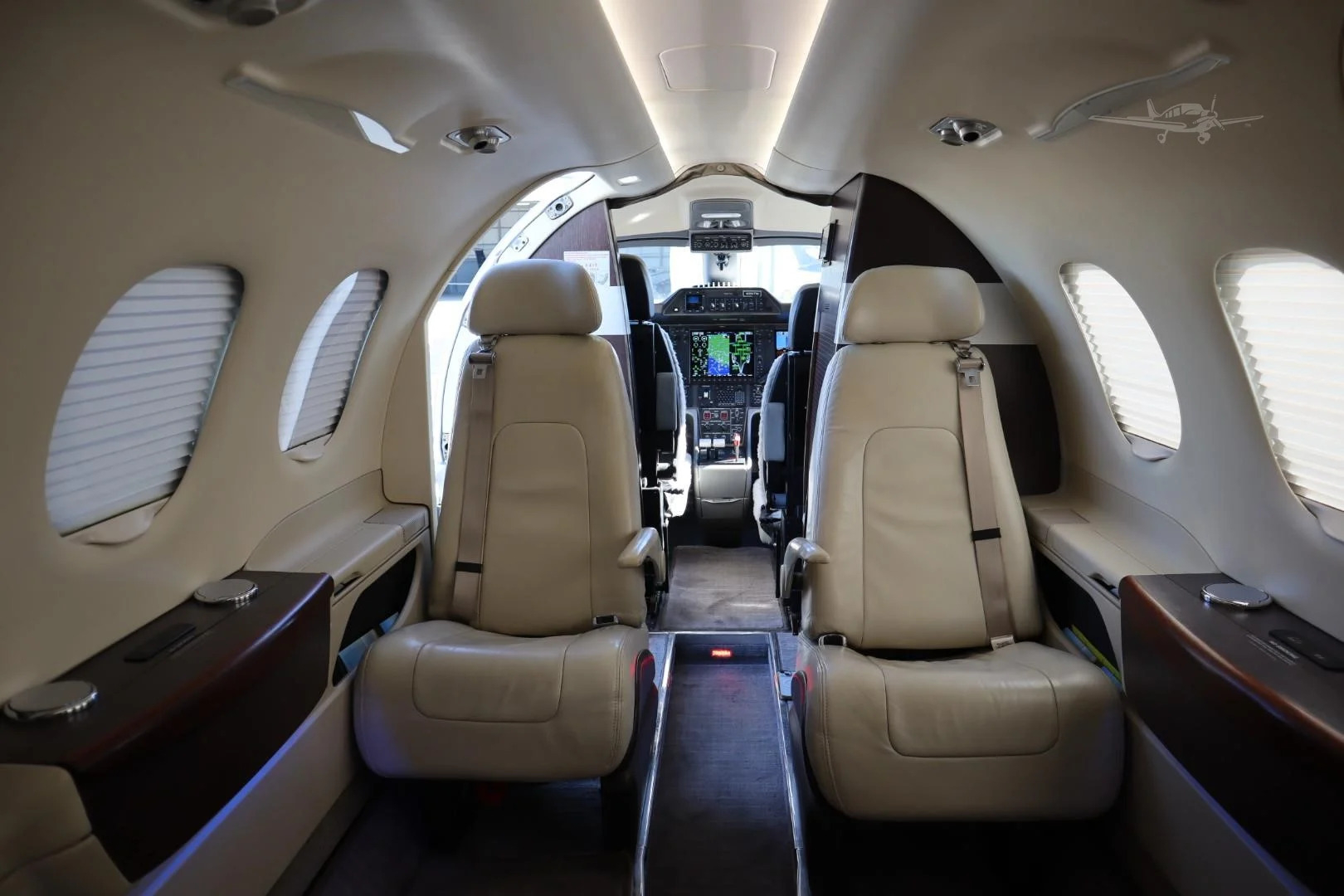 The cabin is arranged as a compact club-style environment intended for small groups, with a fully enclosed aft lavatory in most configurations and a relatively quiet feel for the class. Seating comfort is oriented toward shorter segments; headroom and aisle space are typical VLJ constraints. Baggage volume is adequate for soft bags and briefcases but is less forgiving with hard cases or a full passenger complement.