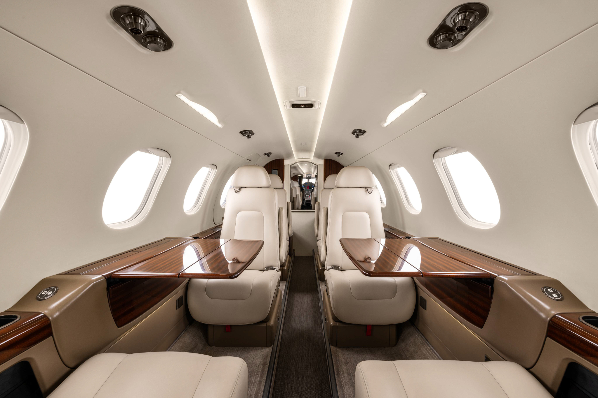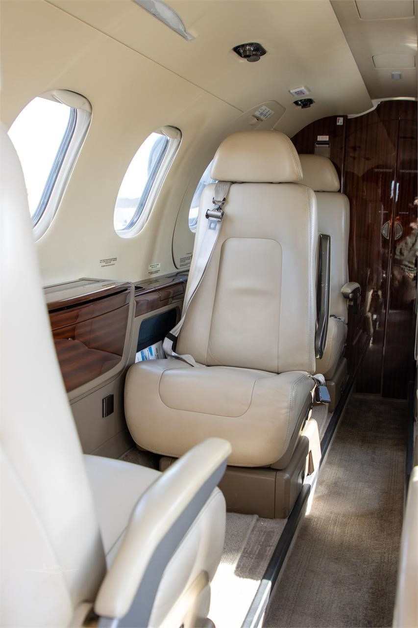 Cabin layout is typically a forward refreshment area, a main club seating section, and an aft enclosed lavatory, giving a more private feel than many light jets. Windows are large for the class, and the baggage compartment is usually accessed from outside; in-flight access is limited compared with larger jets. Noise and ride quality are generally consistent with a modern light jet, with comfort depending on seating configuration and operator interior choices.