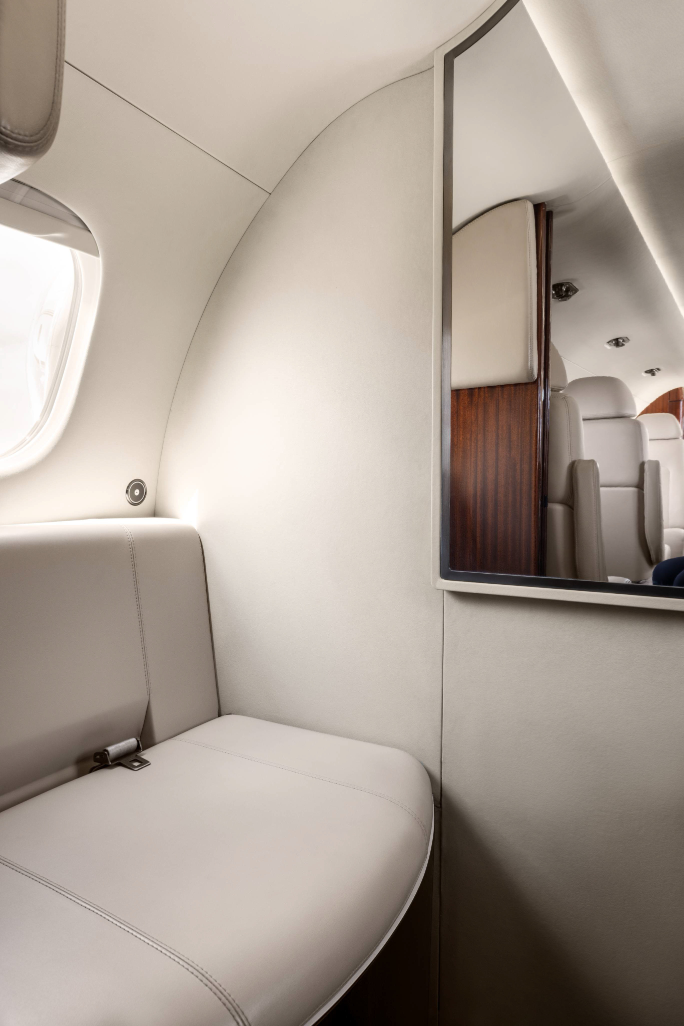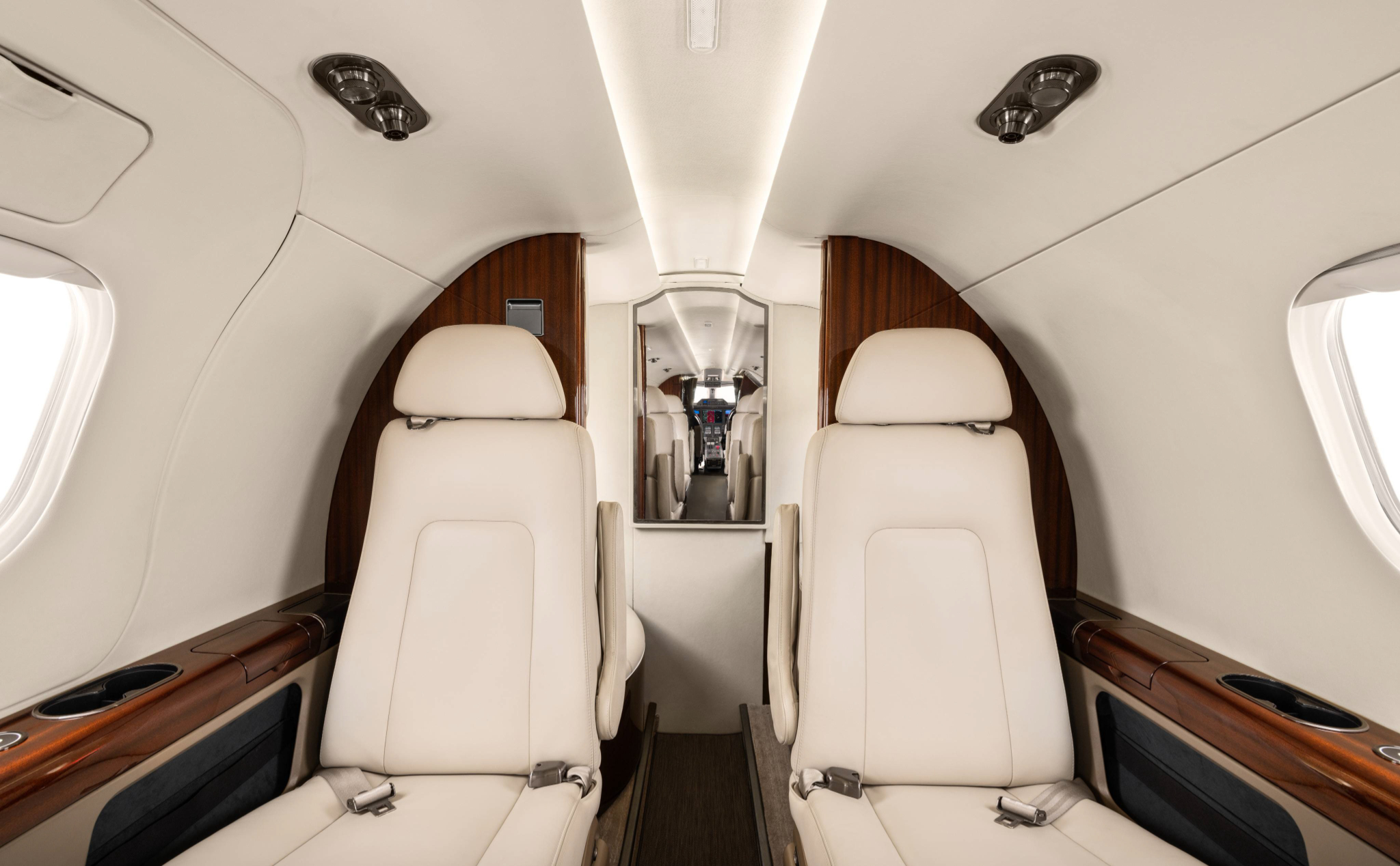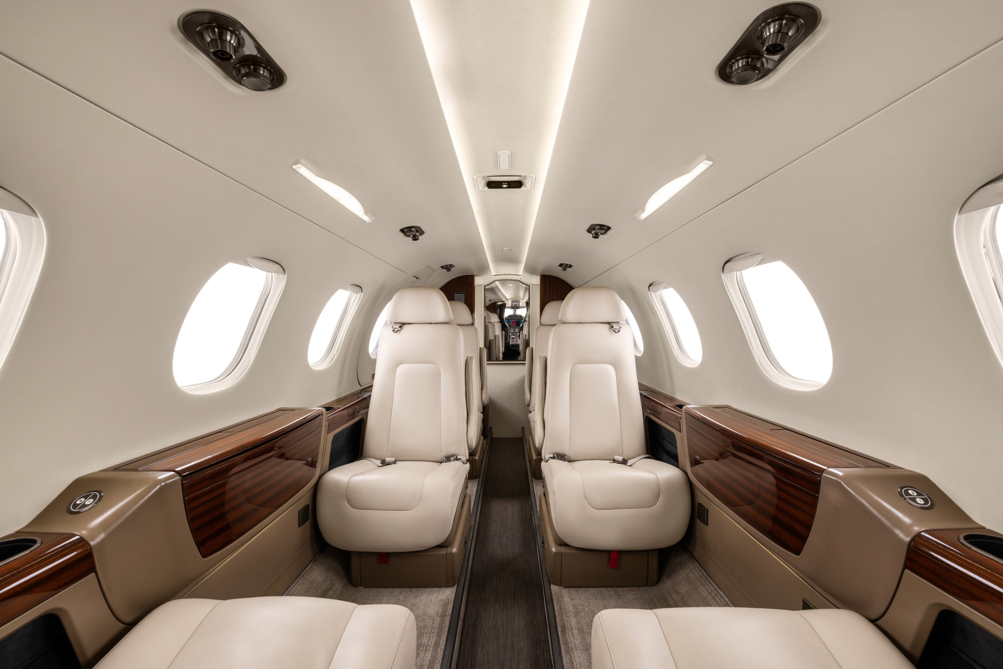 - Cabin layout accommodates six passengers plus a belted lavatory.