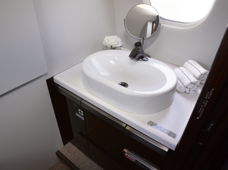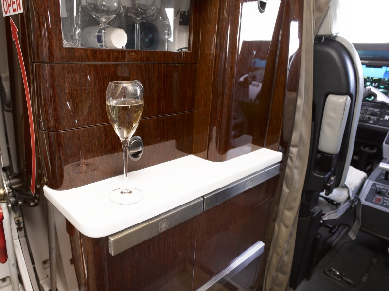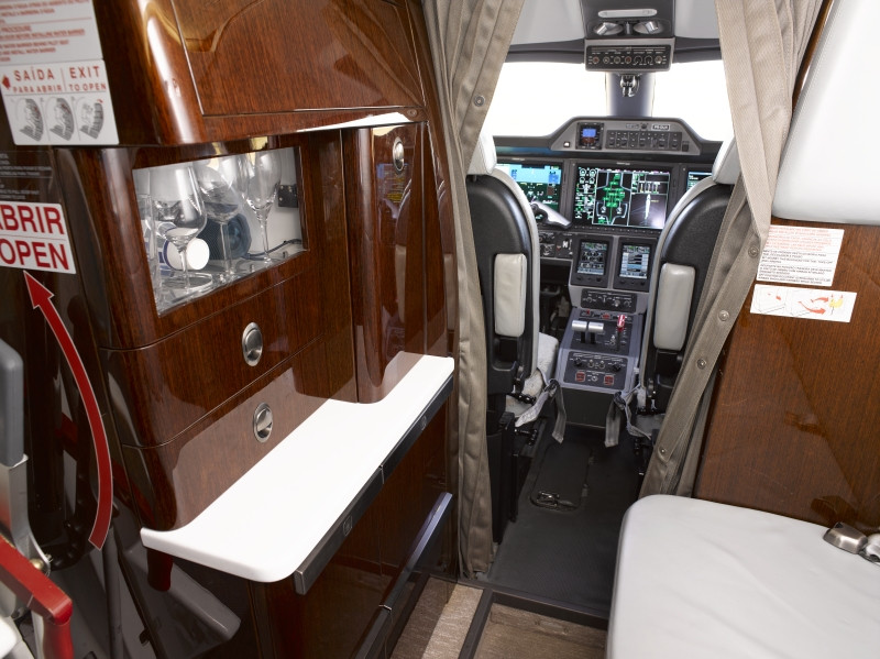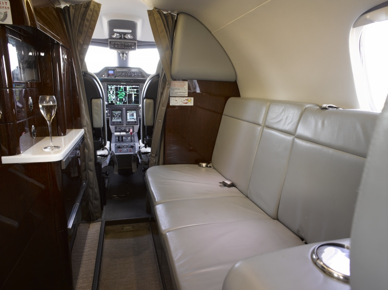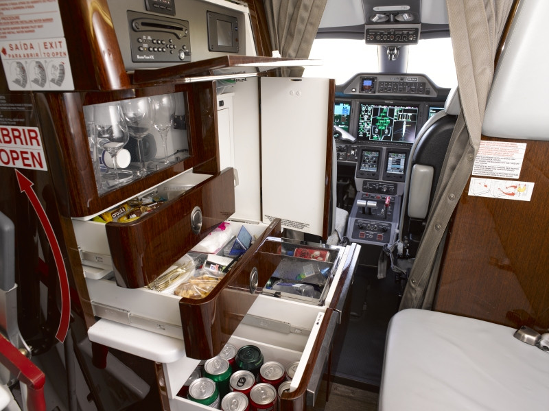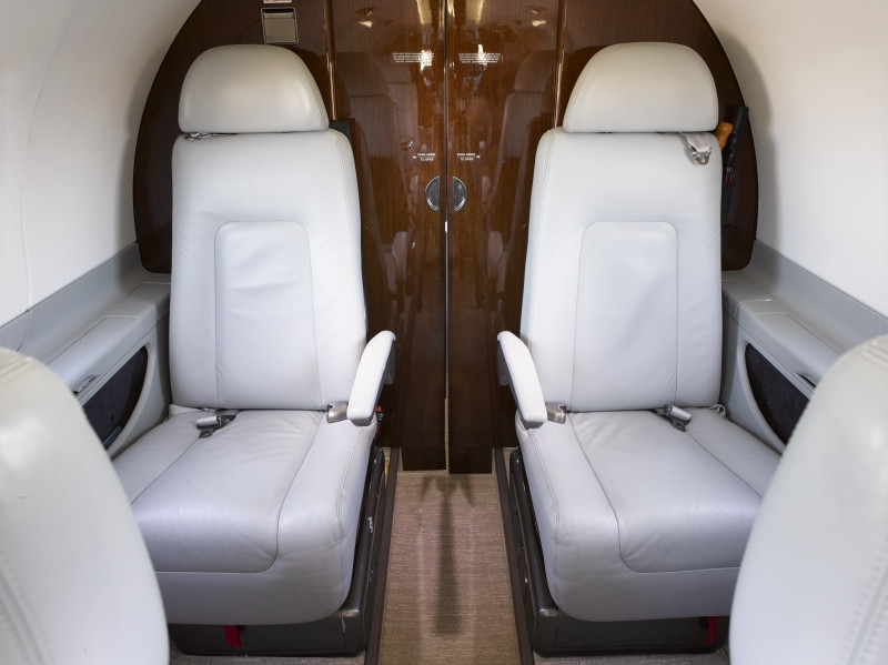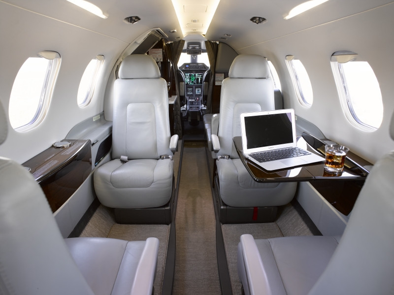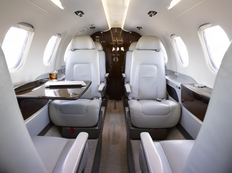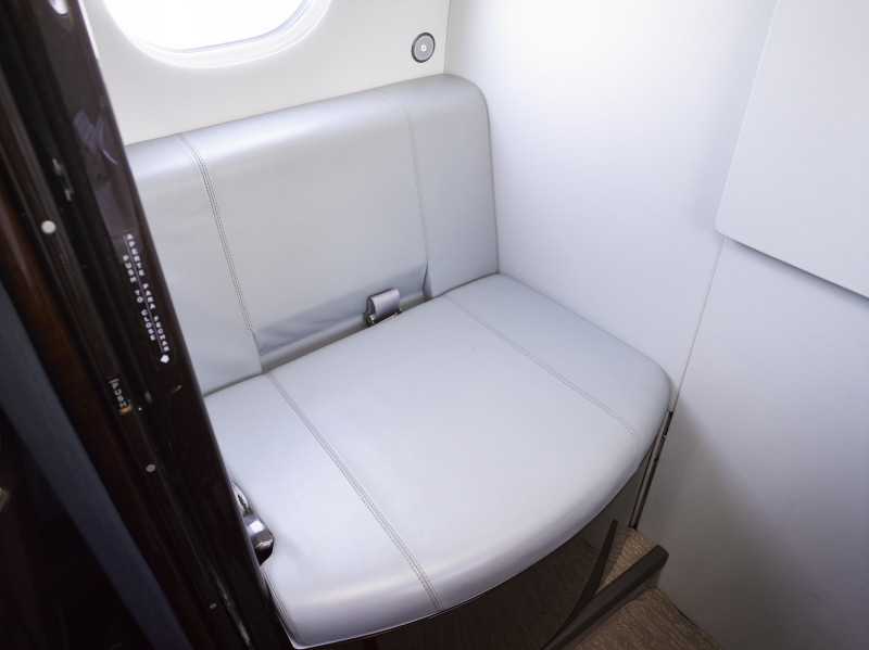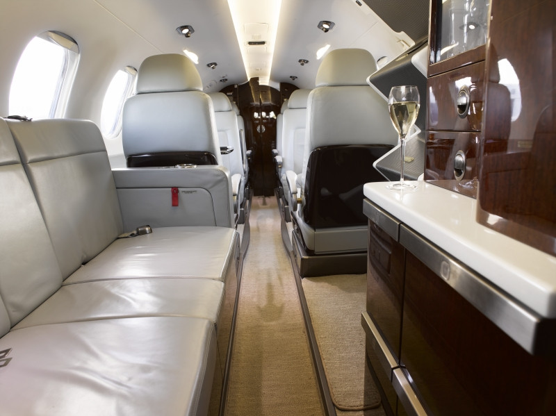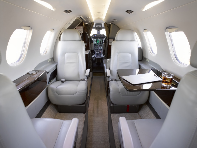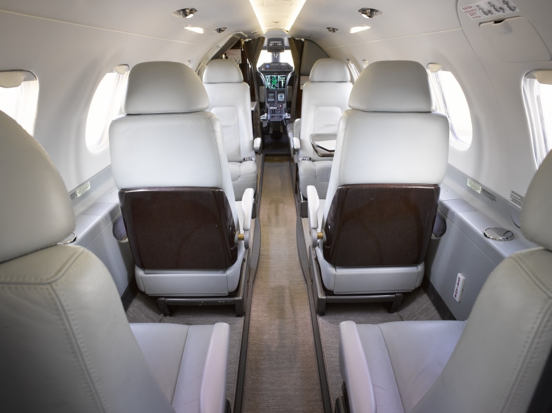 Cabin layout is typically a forward refreshment area, a main club seating section, and an aft enclosed lavatory, giving a more private feel than many light jets. Windows are large for the class, and the baggage compartment is usually accessed from outside; in-flight access is limited compared with larger jets. Noise and ride quality are generally consistent with a modern light jet, with comfort depending on seating configuration and operator interior choices.