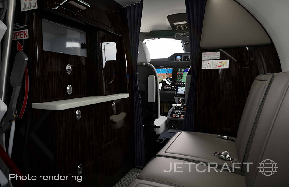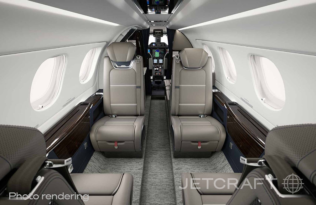 Cabin layout is typically a forward refreshment area, a main club seating section, and an aft enclosed lavatory, giving a more private feel than many light jets. Windows are large for the class, and the baggage compartment is usually accessed from outside; in-flight access is limited compared with larger jets. Noise and ride quality are generally consistent with a modern light jet, with comfort depending on seating configuration and operator interior choices.