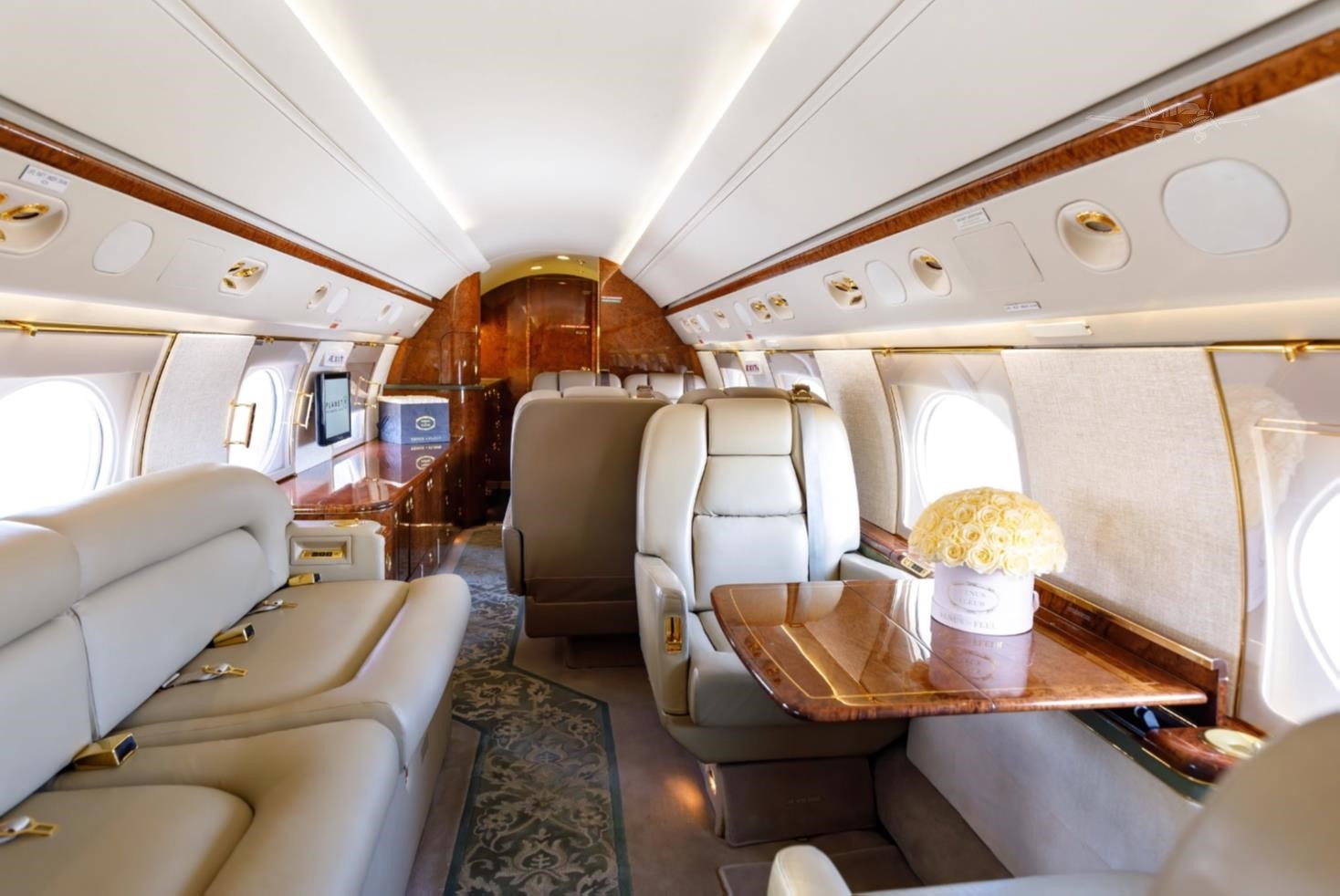 The GV cabin is known for its width and ability to be arranged into distinct zones, commonly including a forward galley, club seating, conference/dining area, and an aft stateroom or additional seating. Cabin altitude and environmental performance are geared toward long flights, and baggage capacity supports extended trips. Cabin appointments vary widely by aircraft age and refurbishment history, especially for connectivity, audio/video, and soft goods.