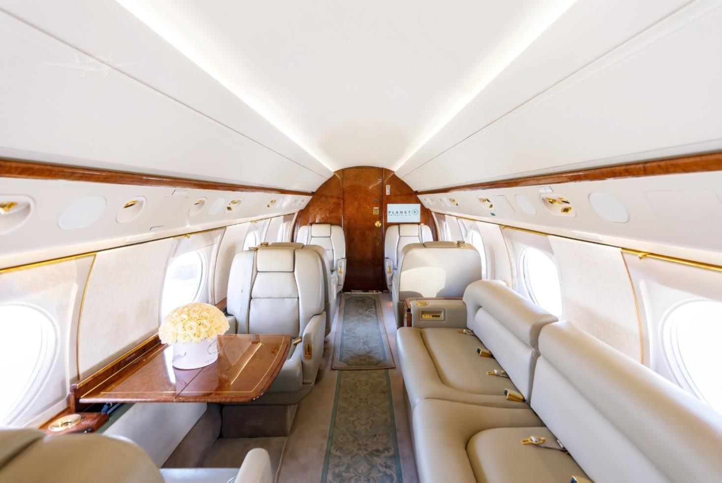 - 14 passenger seats: four forward single seats, two mid-cabin single seats opposite a 4-place divan, and an aft 4-place conference group with a jumpseat.