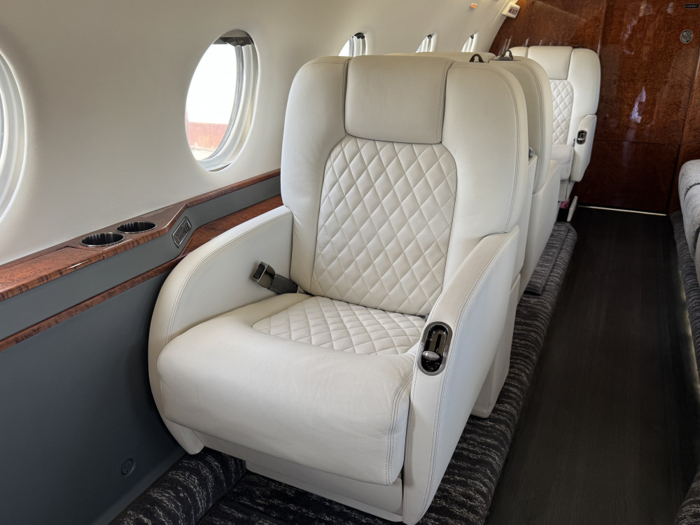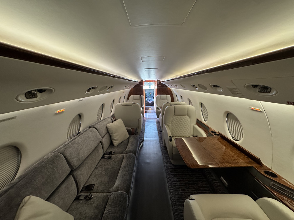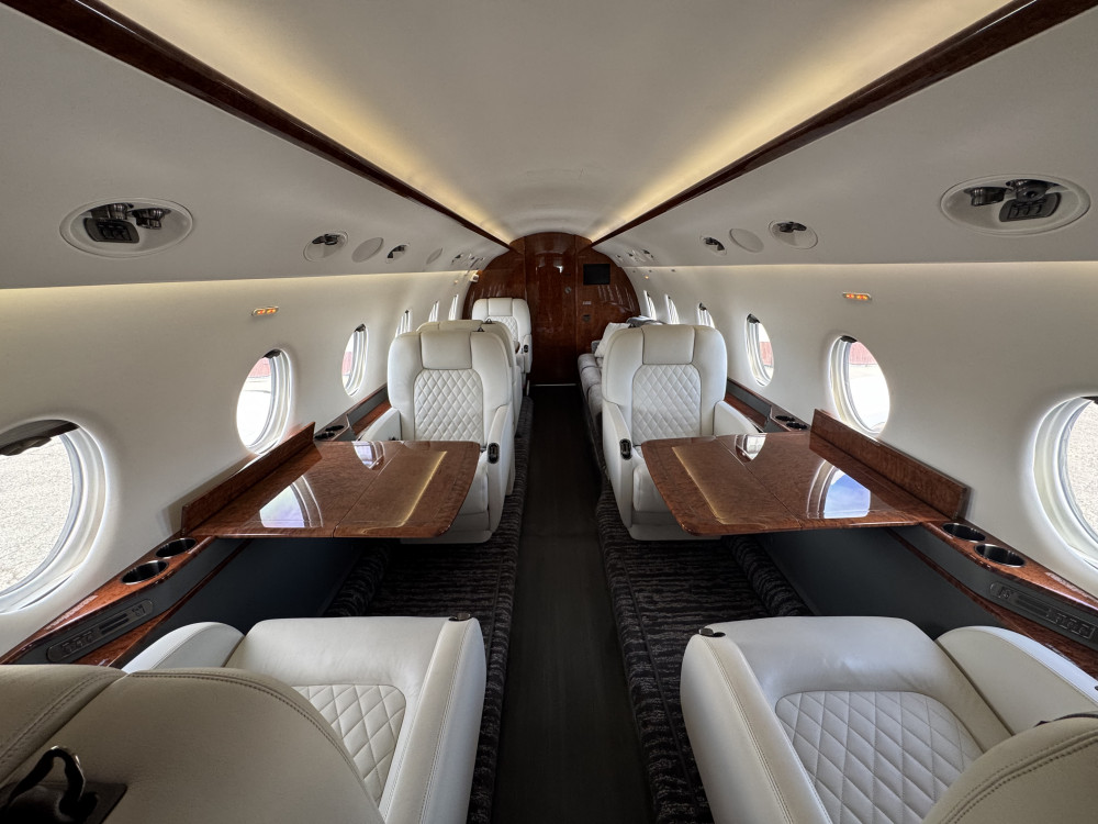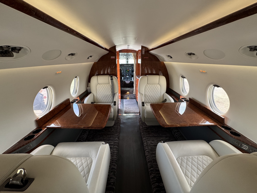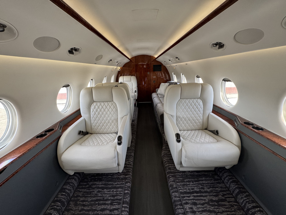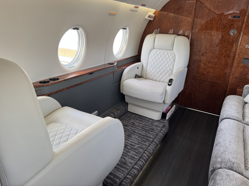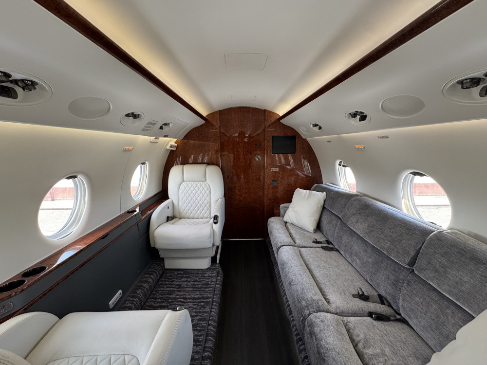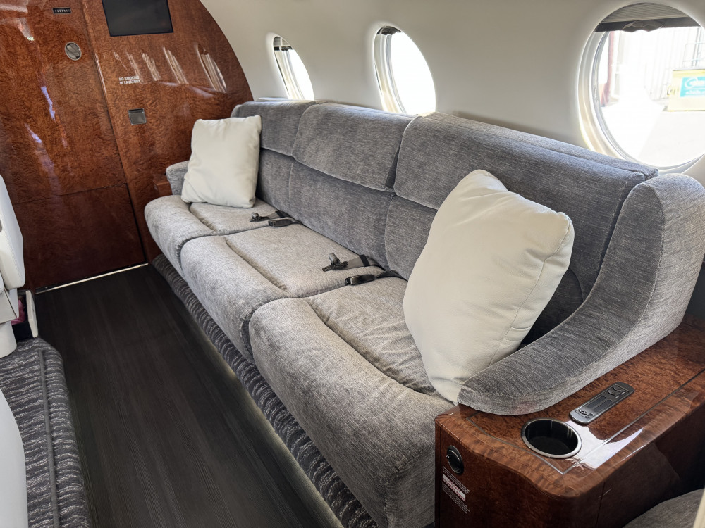 - Interior: 9 passenger seats; Forward galley; Aft lavatory; Refurbished in 2022; Configuration: 4-place club in forward cabin, 2-place club and 3-place divan in aft cabin; Jumpseat included.