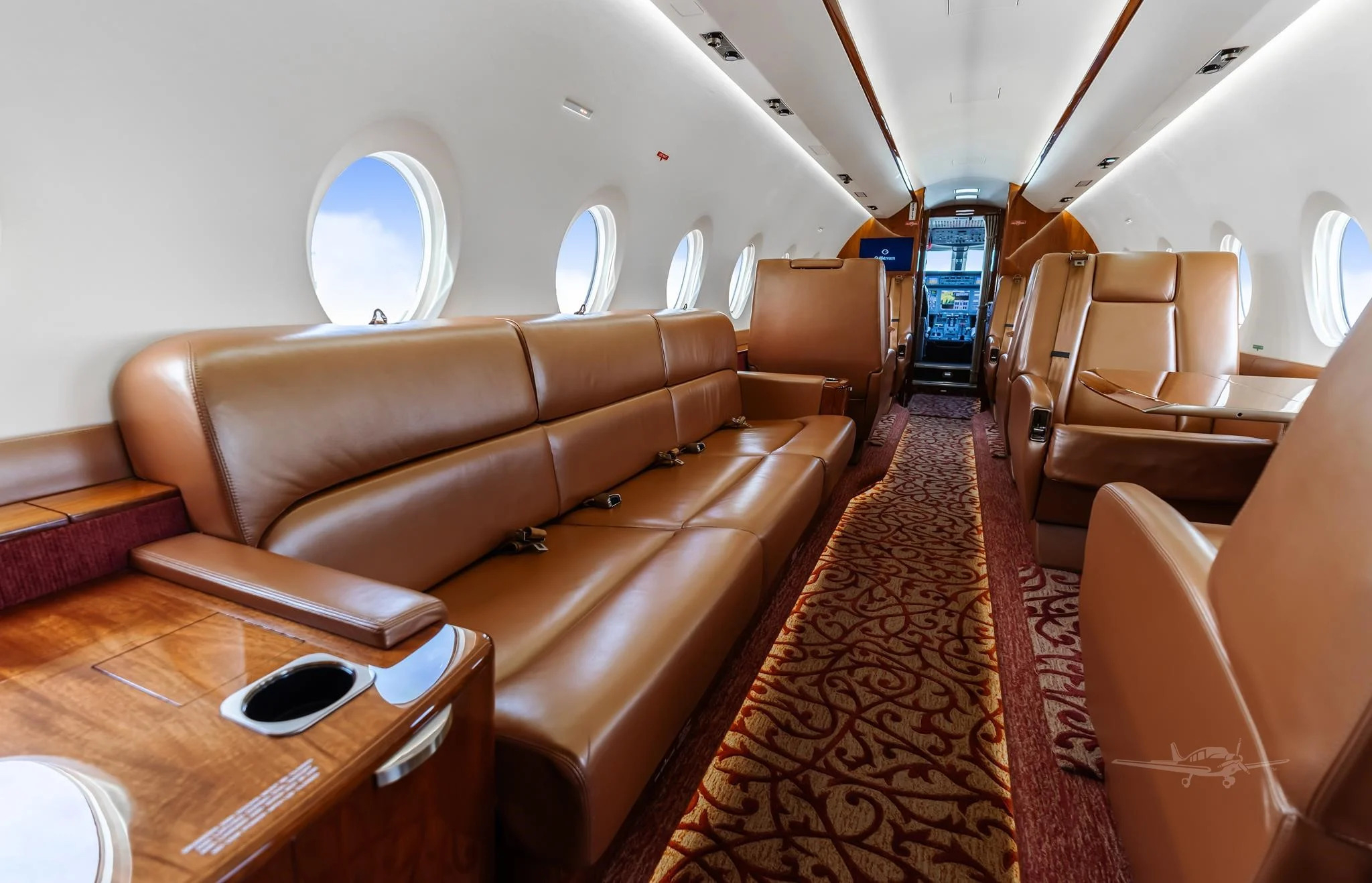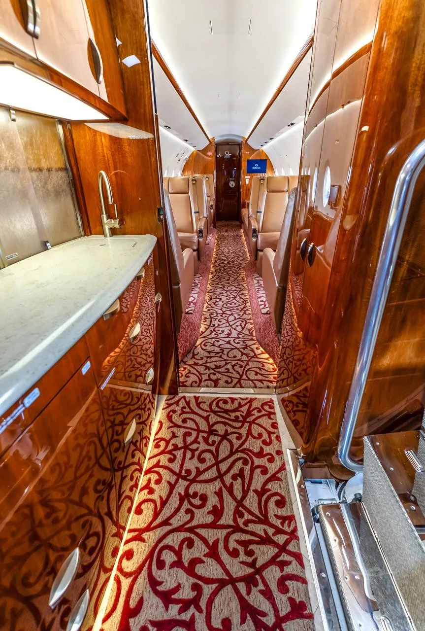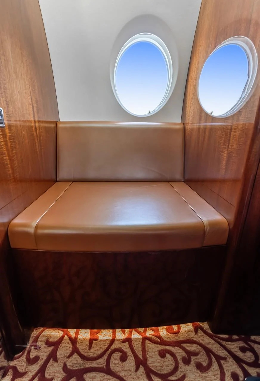 The cabin is arranged to support both productivity and rest, with a flat floor, Gulfstream-style interior fit and finish, and a layout that usually includes a forward galley and enclosed aft lavatory. Most aircraft provide a combination of club seating and additional chairs opposite or aft, plus substantial baggage volume suited to longer trips.