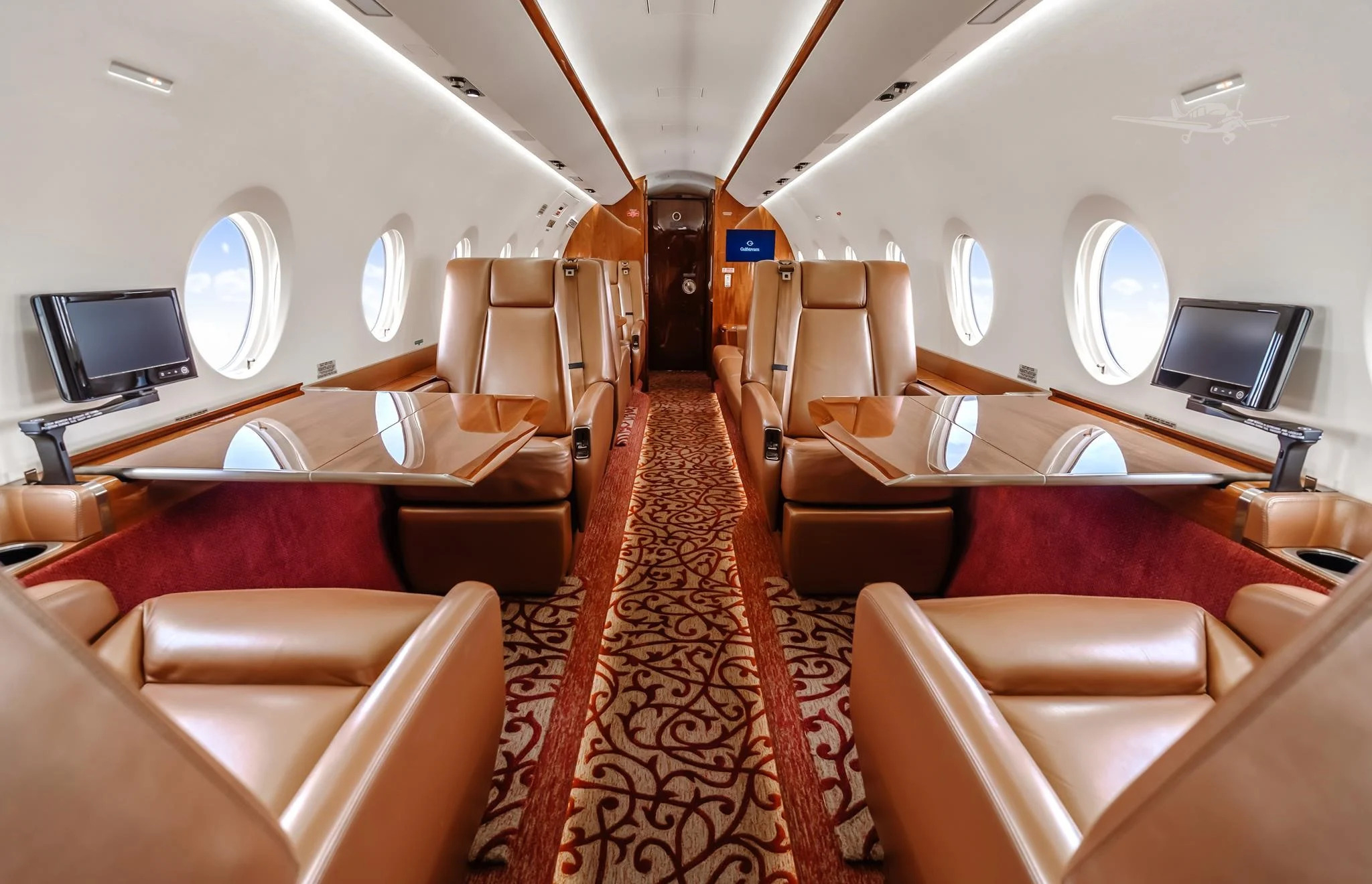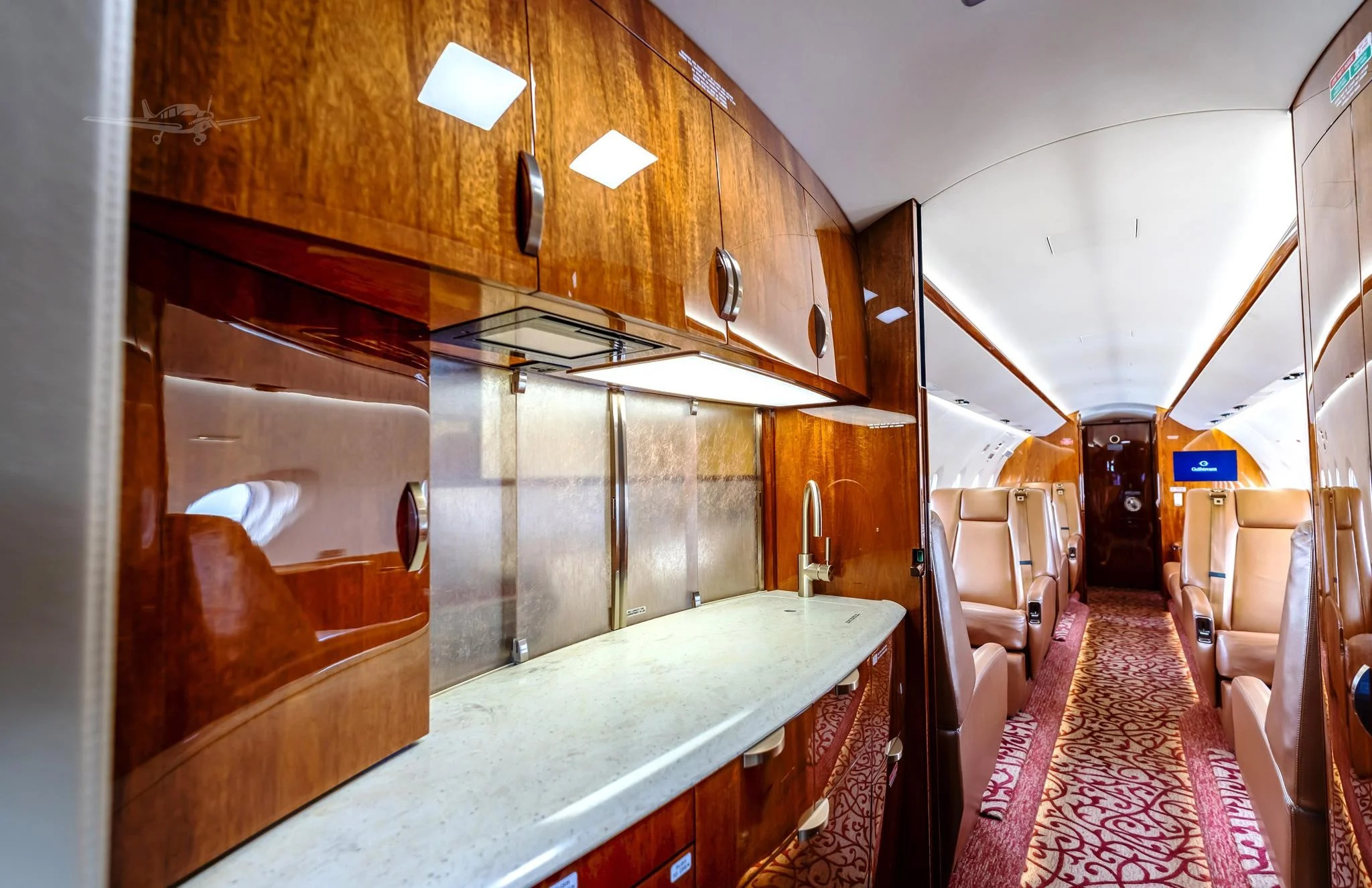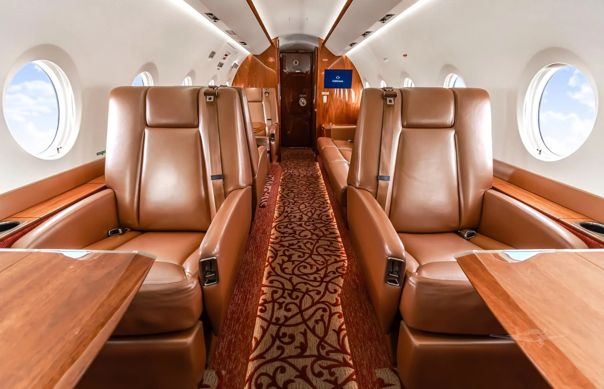 The cabin is arranged to support both productivity and rest, with a flat floor, Gulfstream-style interior fit and finish, and a layout that usually includes a forward galley and enclosed aft lavatory. Most aircraft provide a combination of club seating and additional chairs opposite or aft, plus substantial baggage volume suited to longer trips.
