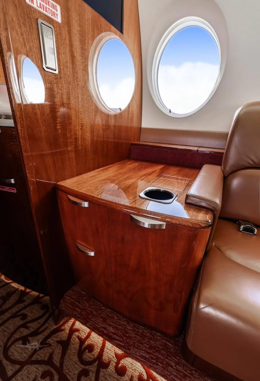 - Interior: Executive configuration for 9 passengers; original brown leather in excellent condition; forward 4-place club seating, aft 2-place club opposite 3-place divan, jumpseat; forward galley; walnut woodwork; Gogo AVANCE L5 Wi-Fi.